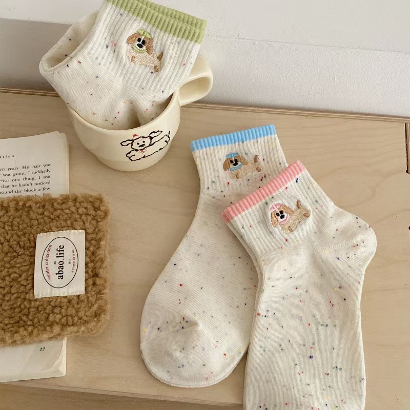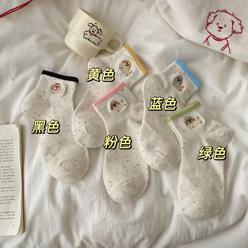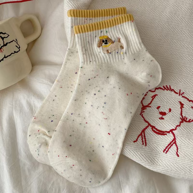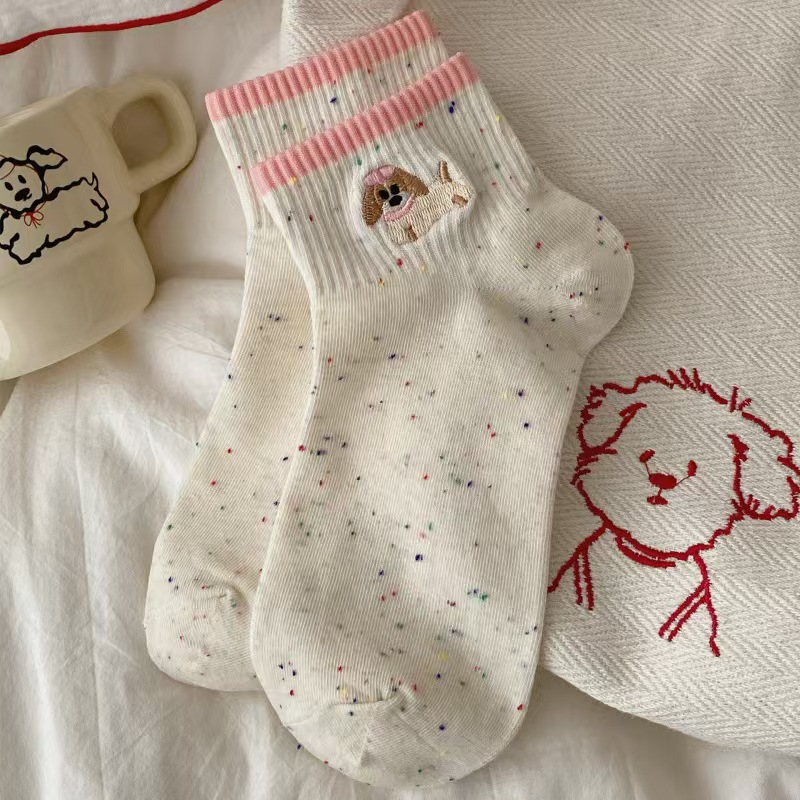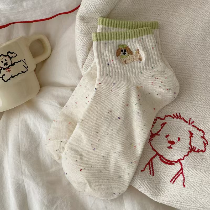여름 얇은 양말 여성 포인트 원사 양말 짧은 배럴 양말 자수 강아지 한국 동대문 포인트 원사 여성 양말