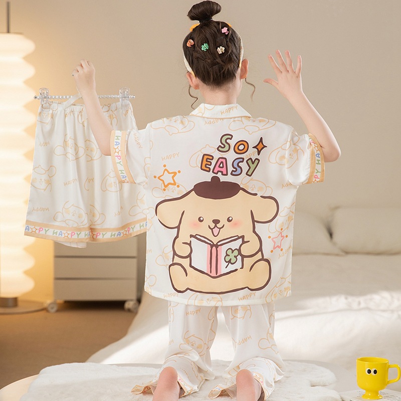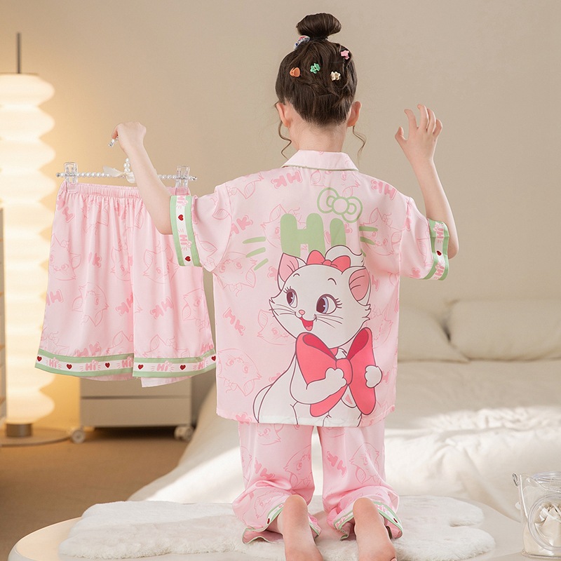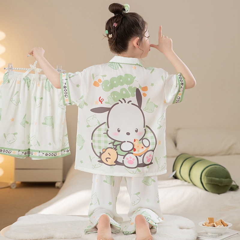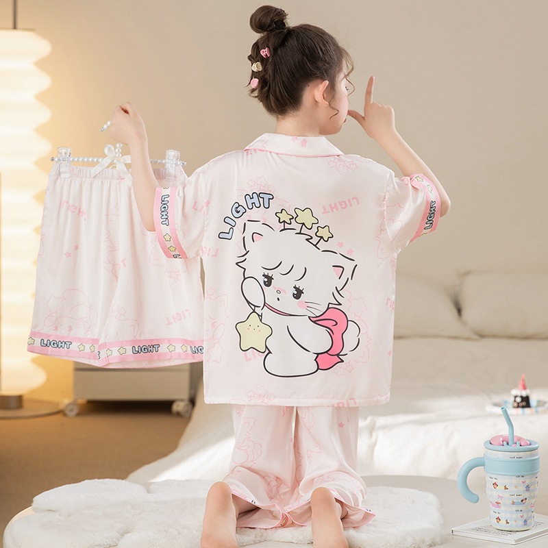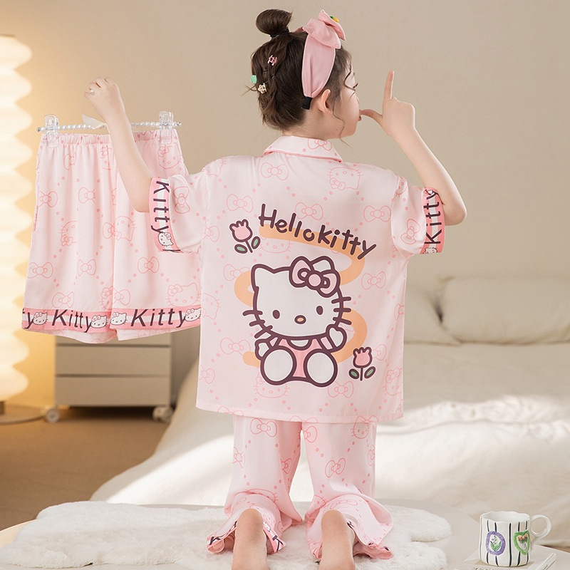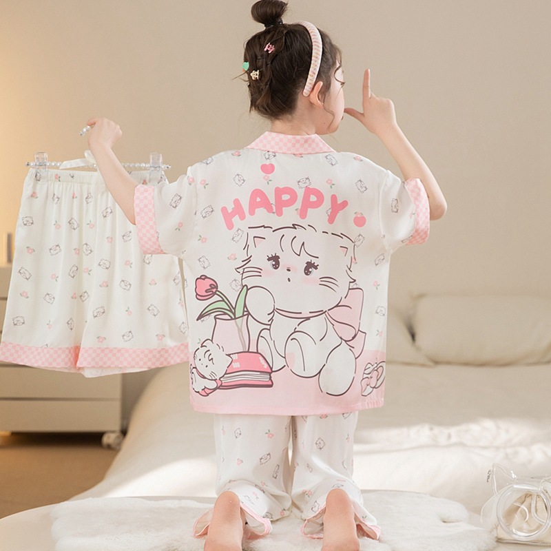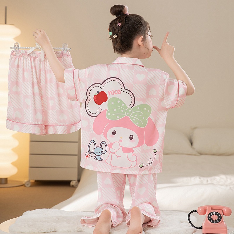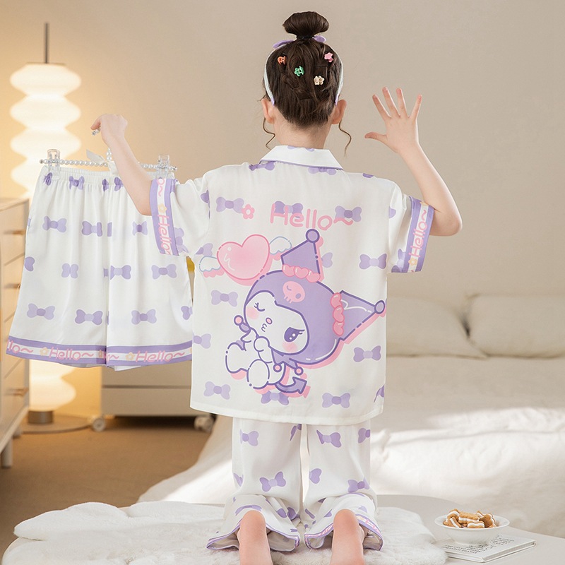 Kuromi 아이스 실크 잠옷 소녀 2025 여름 새로운 반팔 중대형 어린이 달콤한 스타일 가정 의류 3 피스 세트스토어 가기