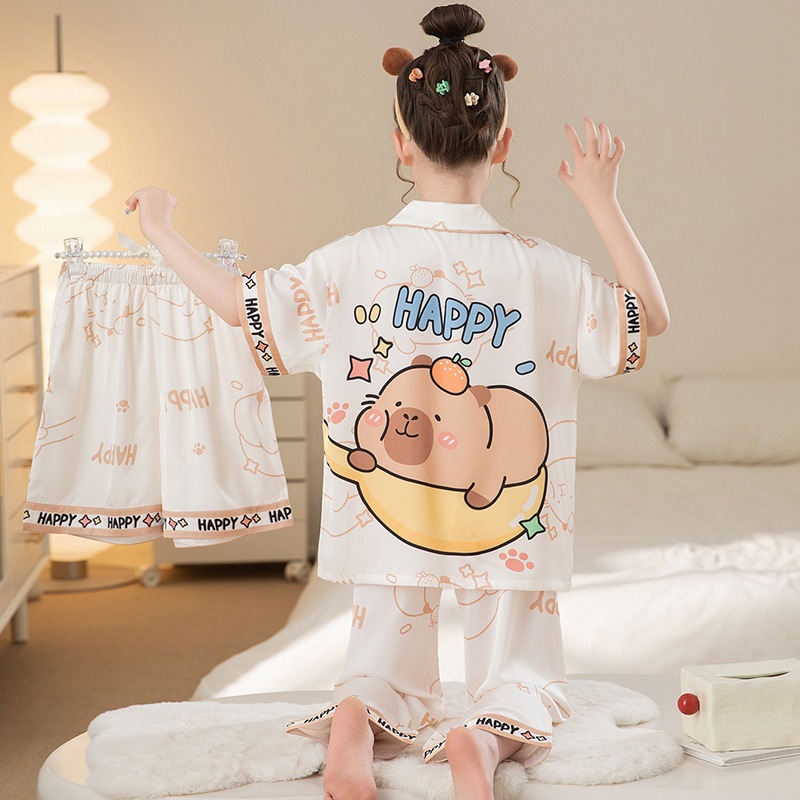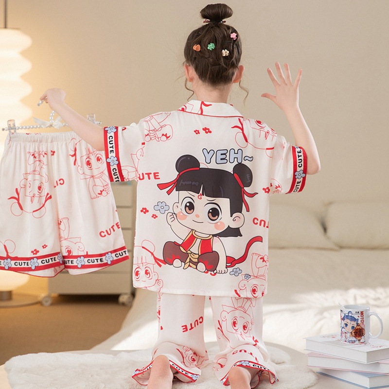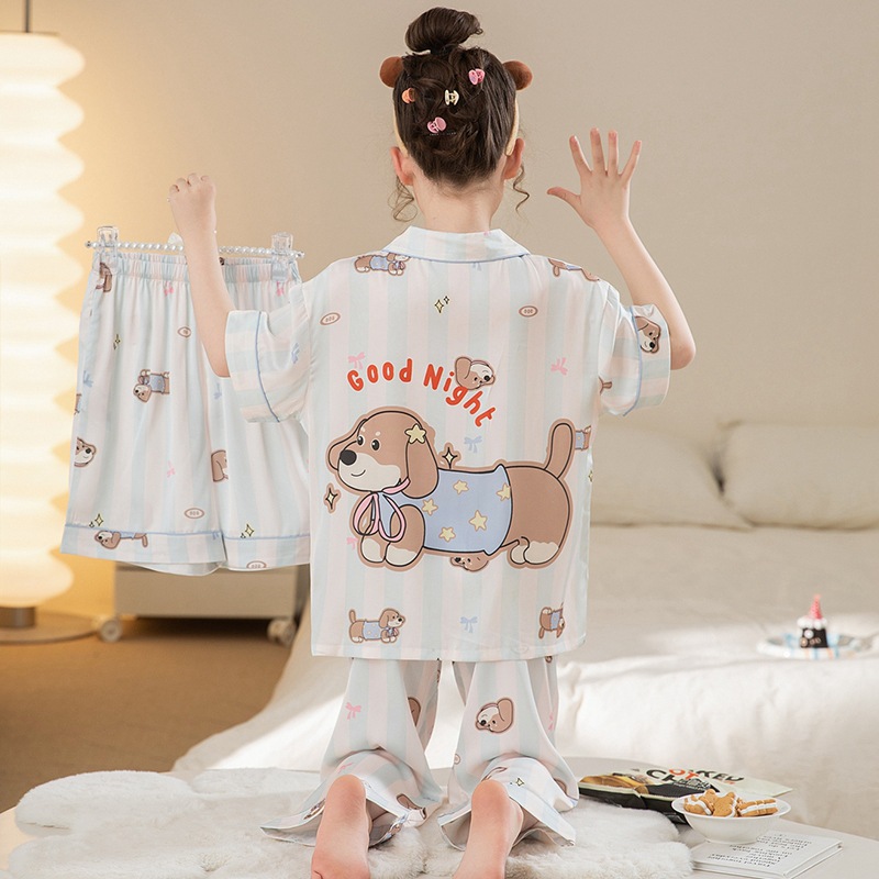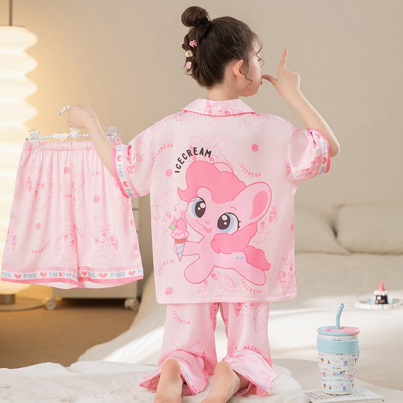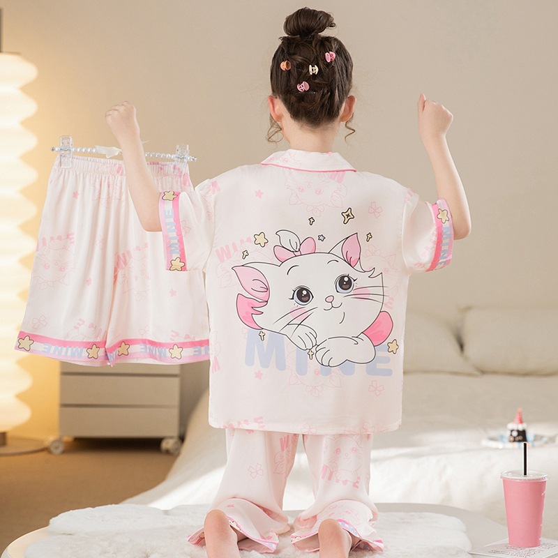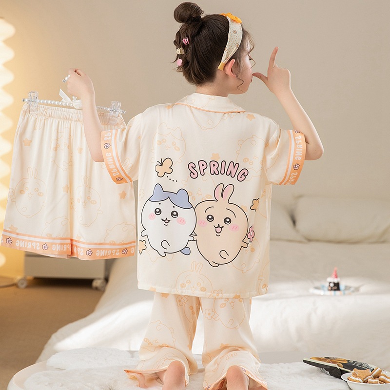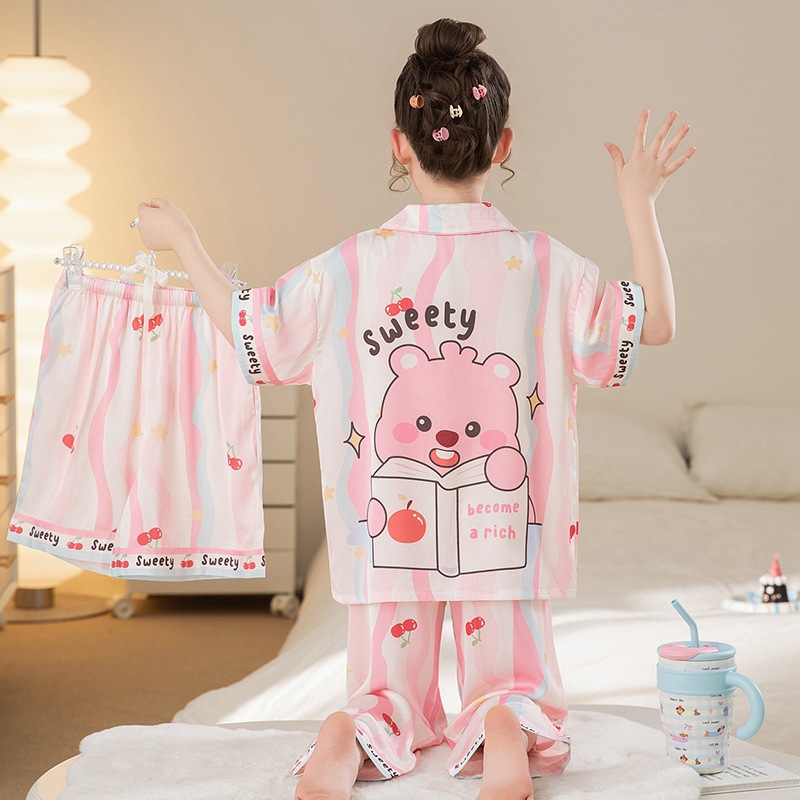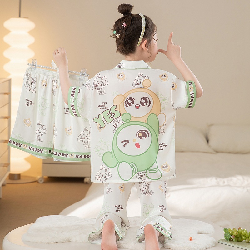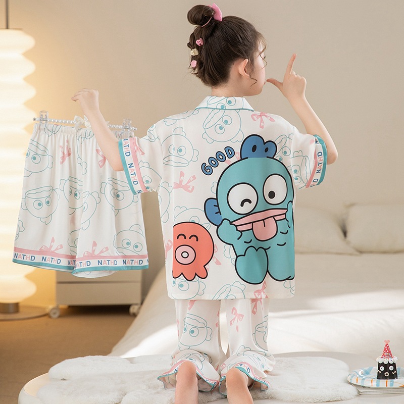 Kuromi 아이스 실크 잠옷 소녀 2025 여름 새로운 반팔 중대형 어린이 달콤한 스타일 가정 의류 3 피스 세트스토어 가기