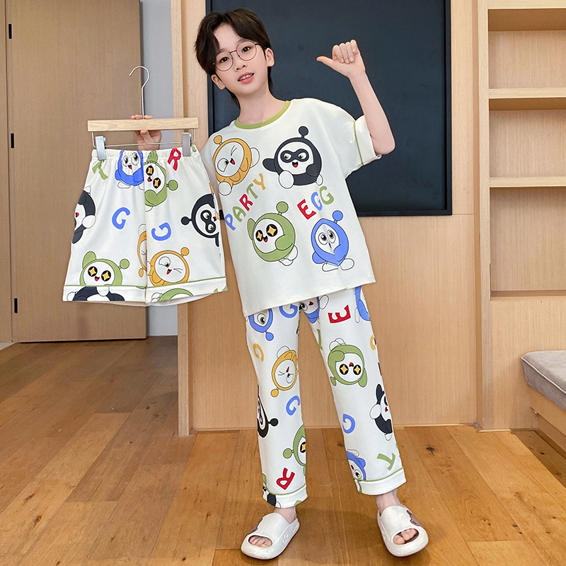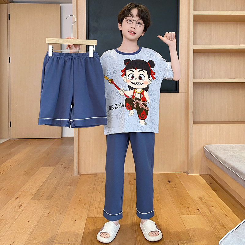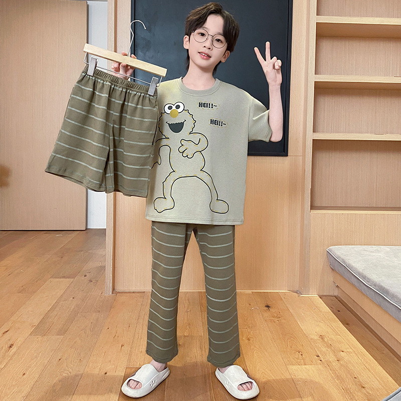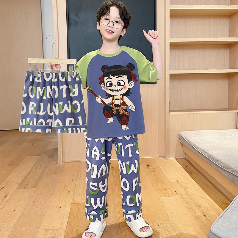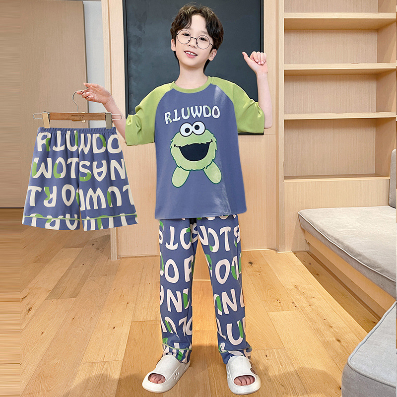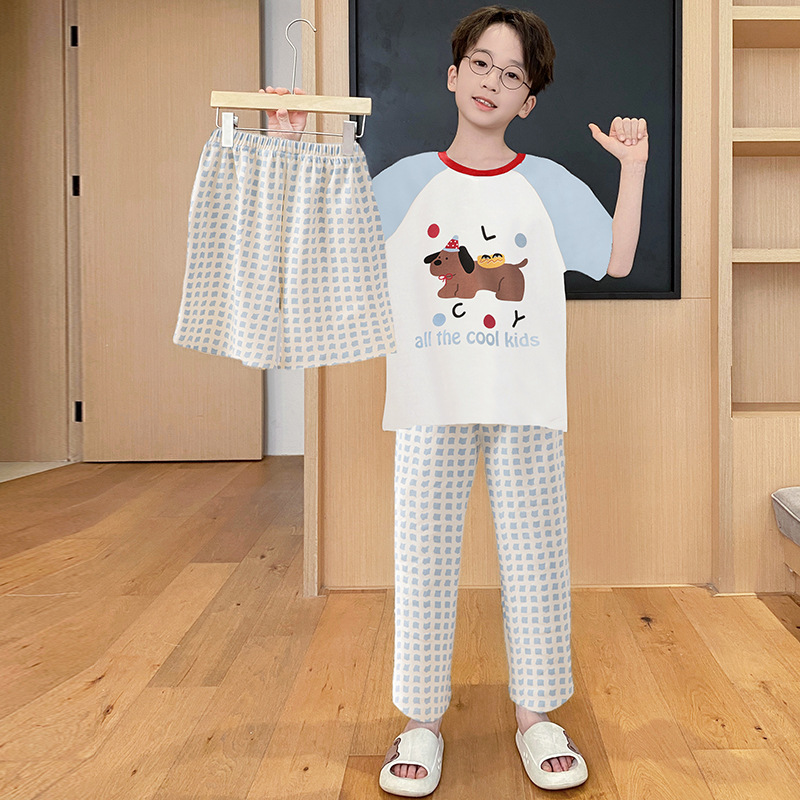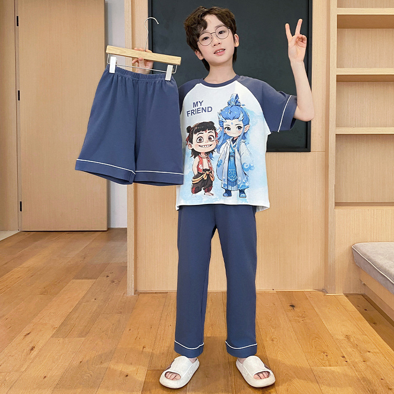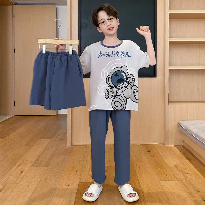 3피스 소년 잠옷 여름 순면 반팔 반바지 바지 여름 캐주얼 소년 가정복 세트