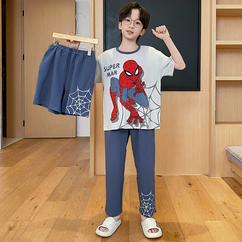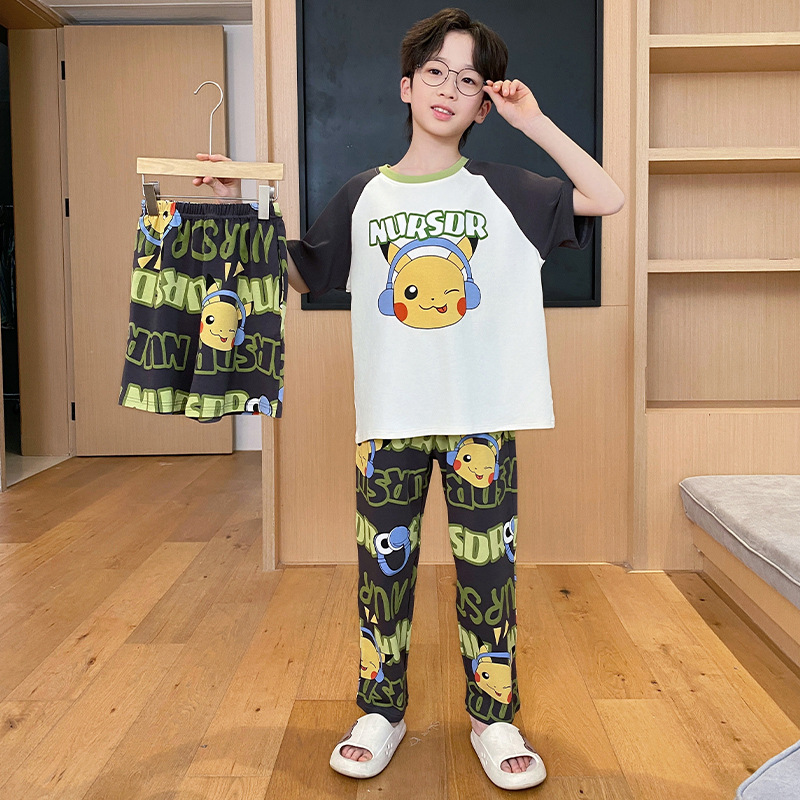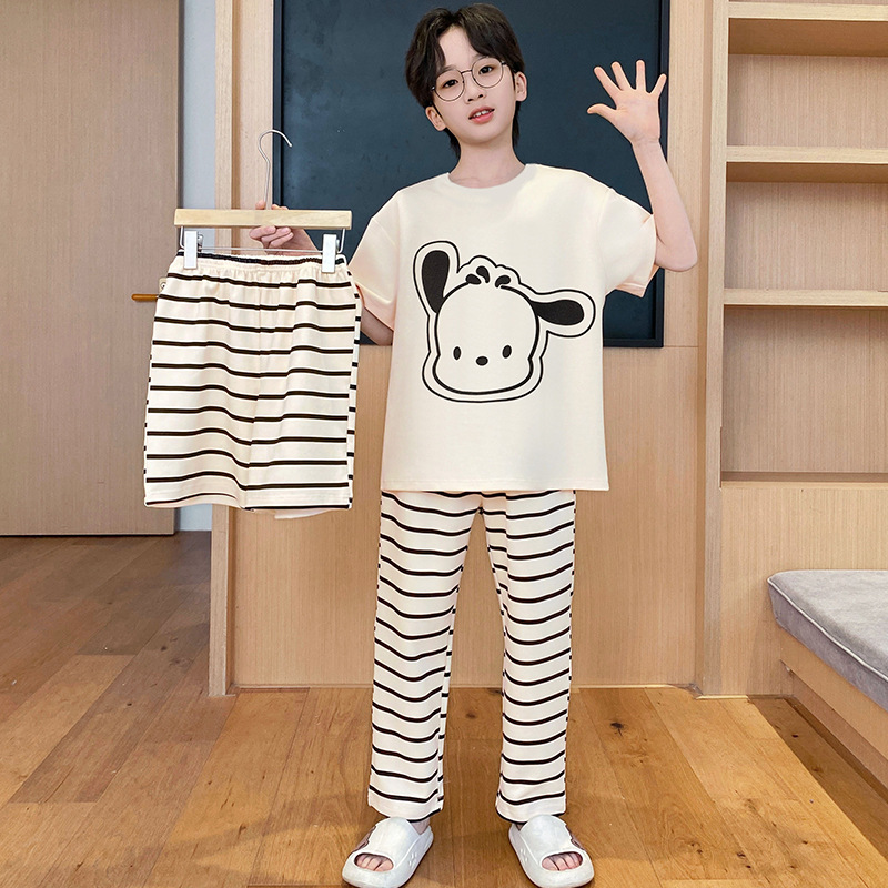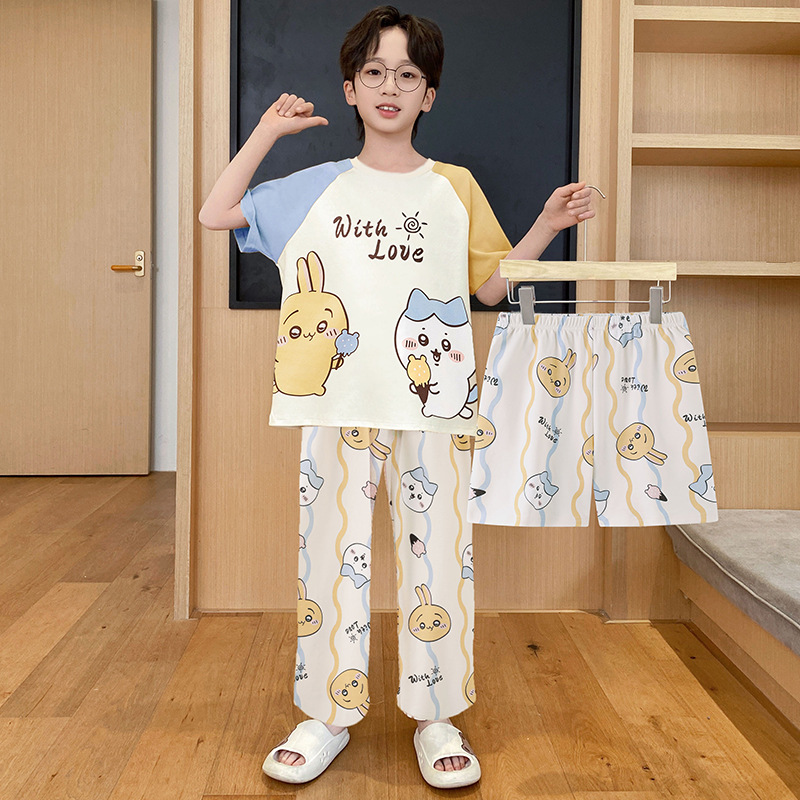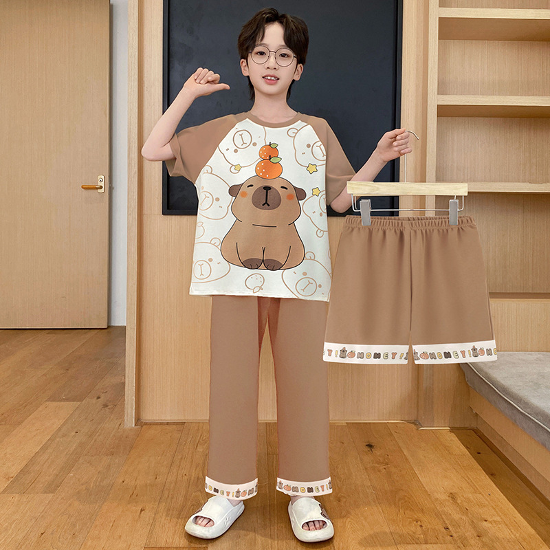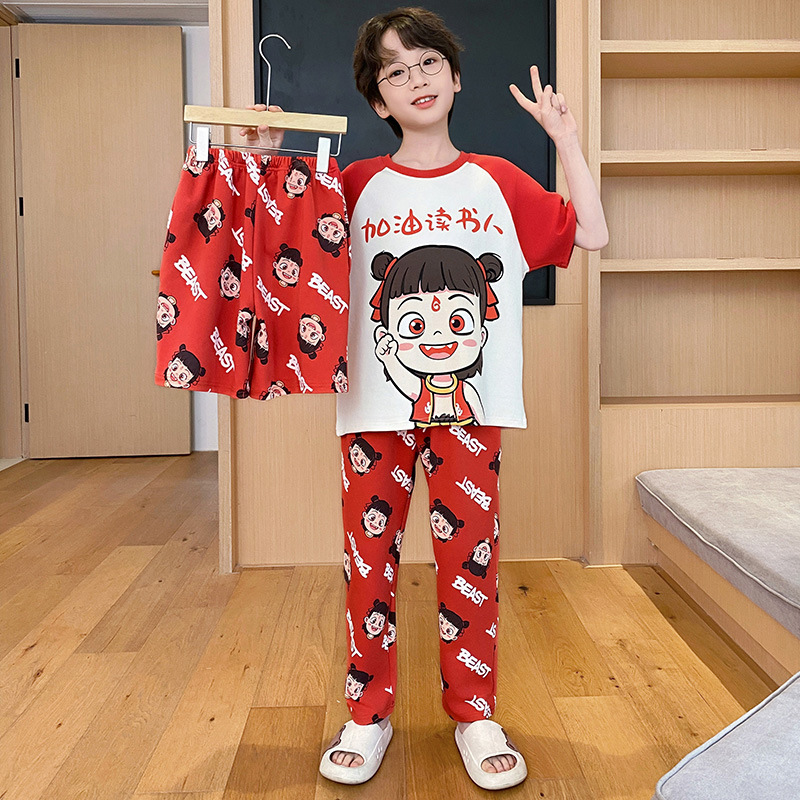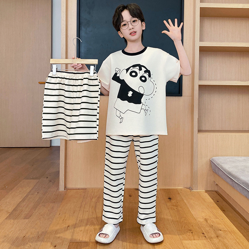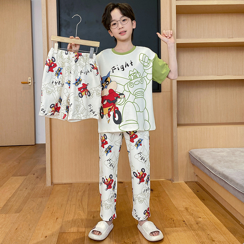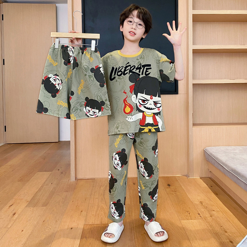 3피스 소년 잠옷 여름 순면 반팔 반바지 바지 여름 캐주얼 소년 가정복 세트