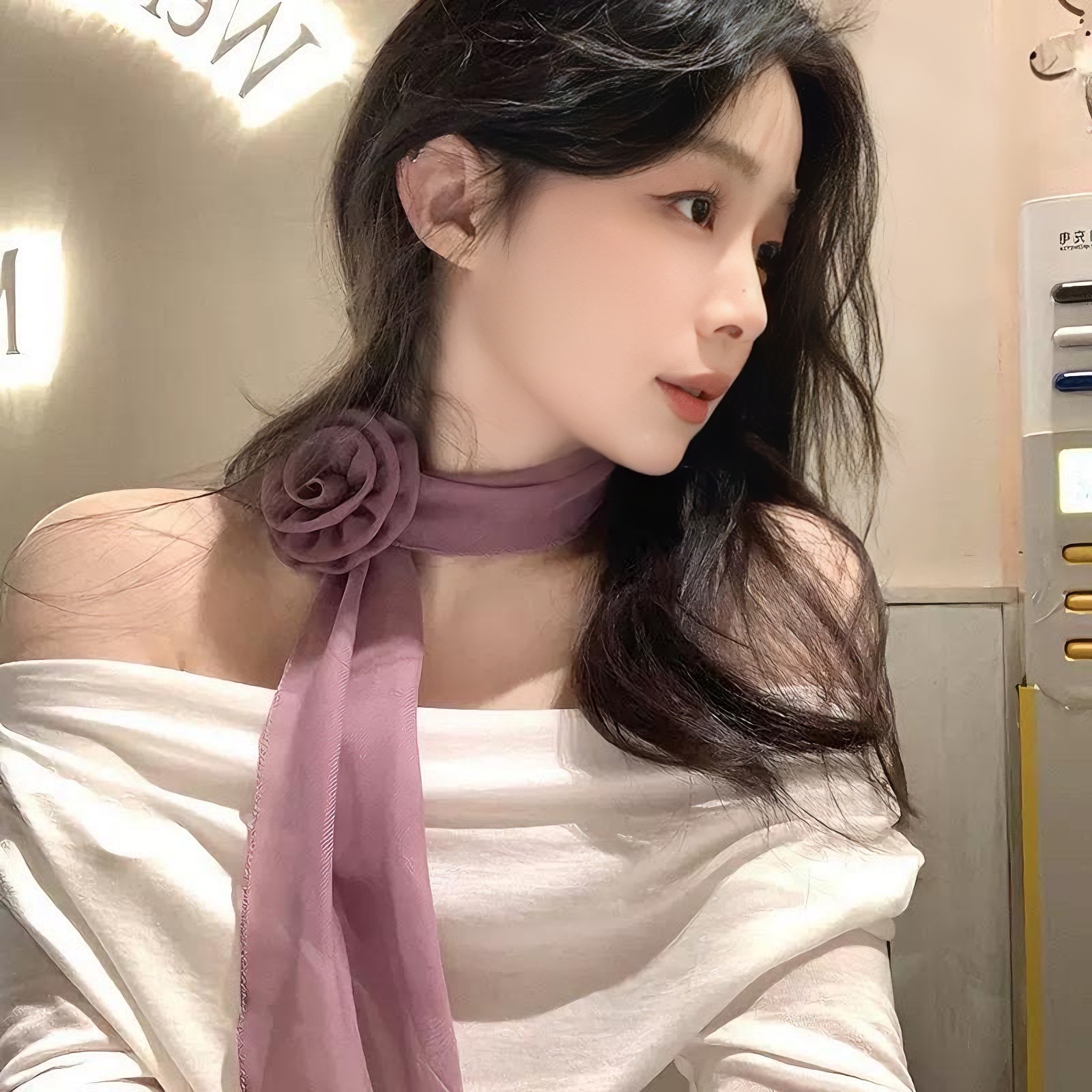 • 매력적인 보라색 실크 스카프 [탈부착 가능한 꽃 액세서리]