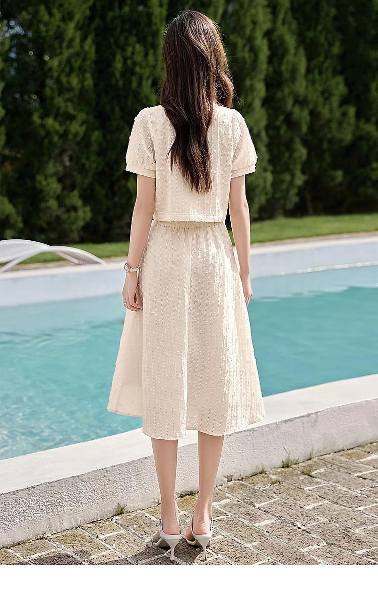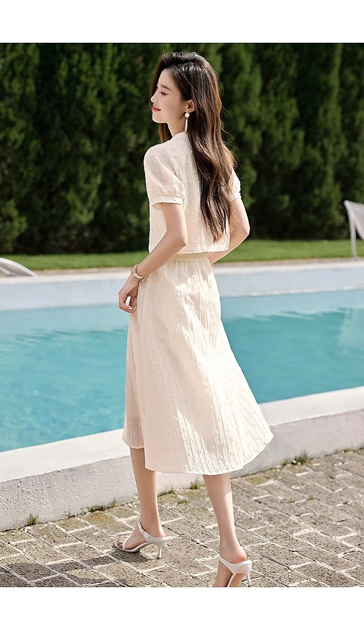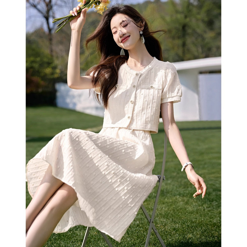 절묘하고 세련된 질감 세트 mogo fish yuanchuang 2025 여름 둥근 목 셔츠 오버스커트 여성의 세트 연령 감소 슬리밍스토어 가기