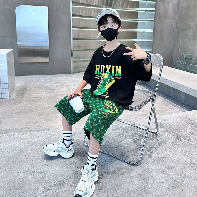 어린이의 새로운 2025 여름 티셔츠 소년의 잘 생긴 프린트 캐주얼 반팔 하이 스트리트 힙합 레터 반바지 정장