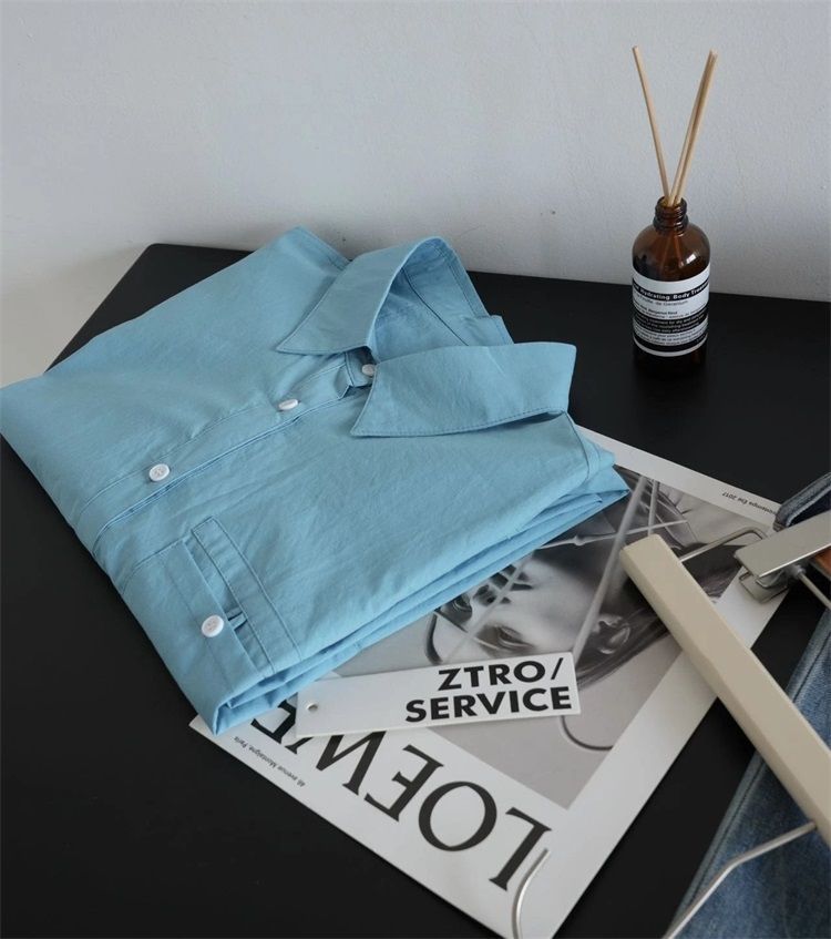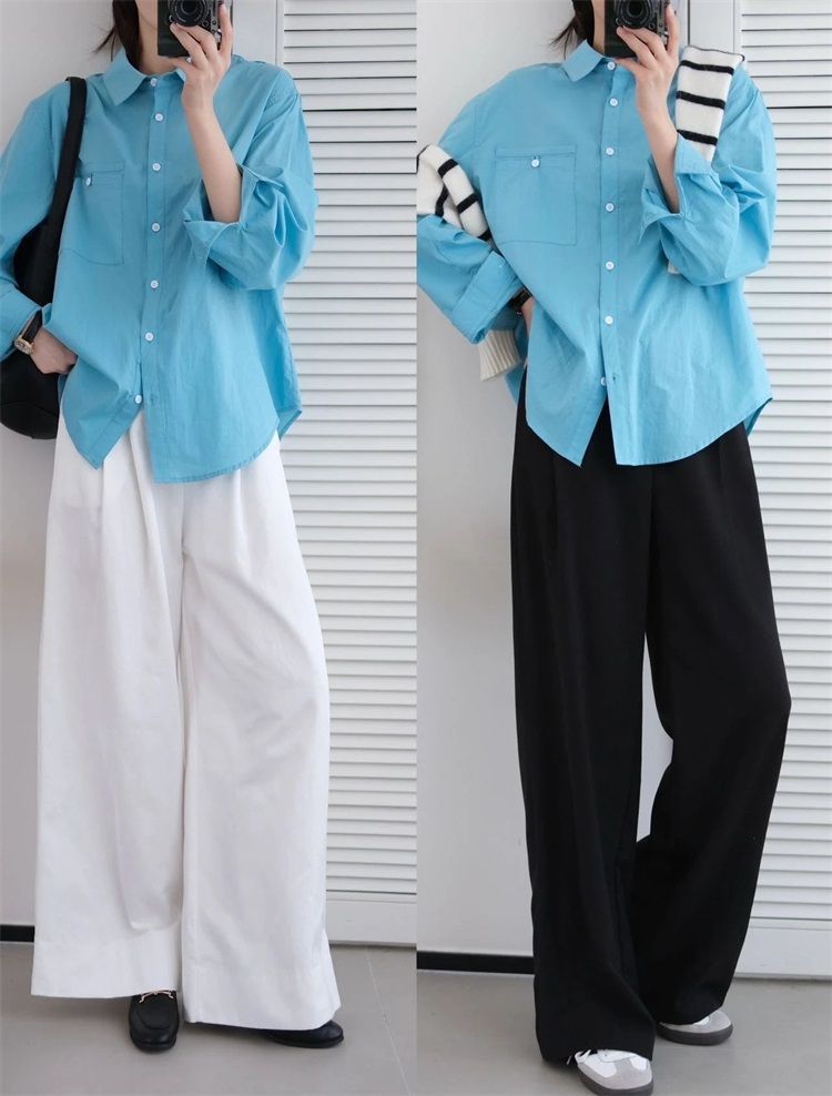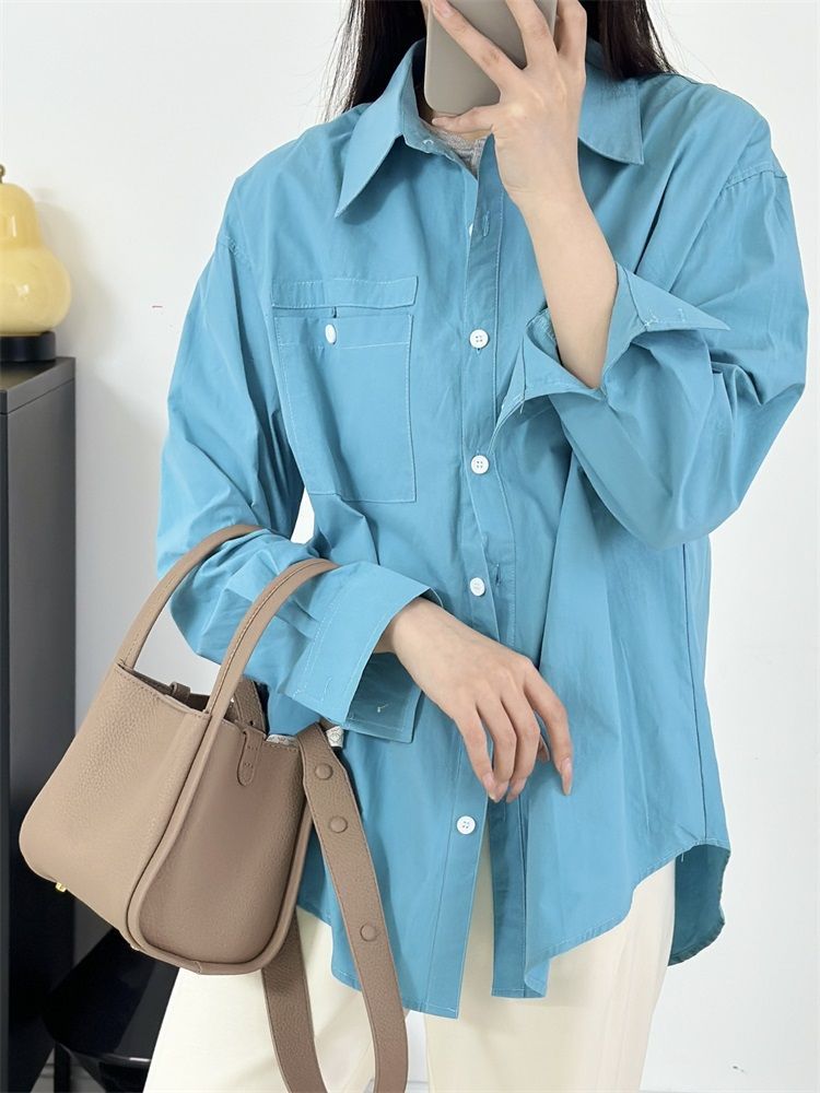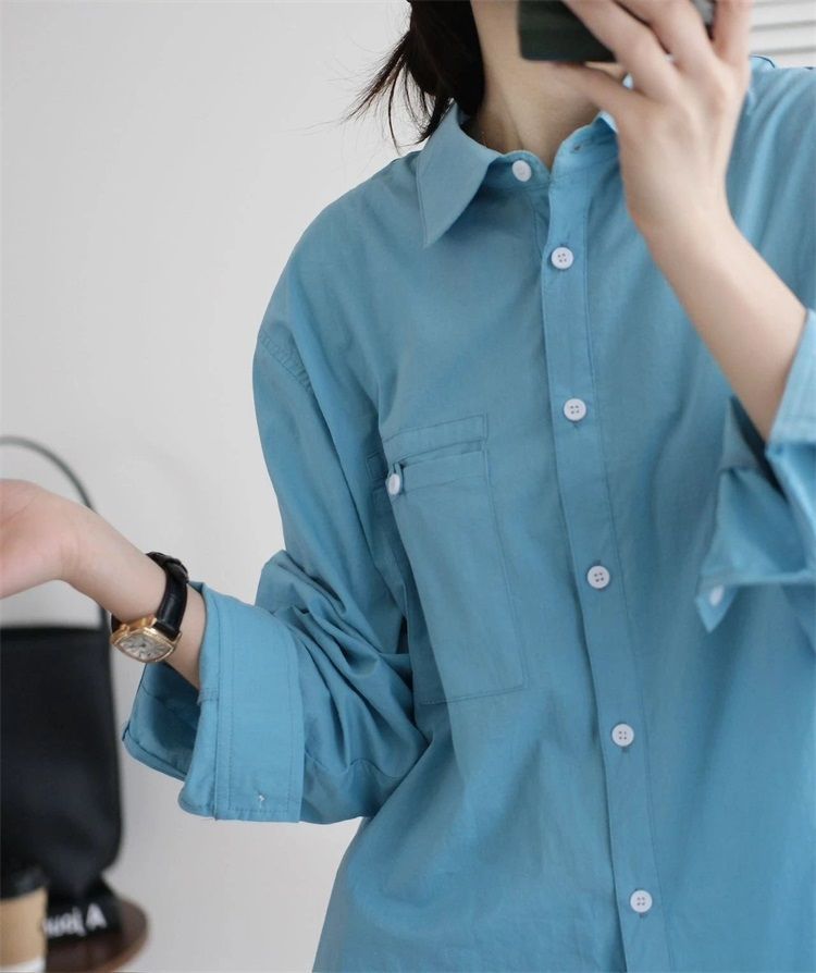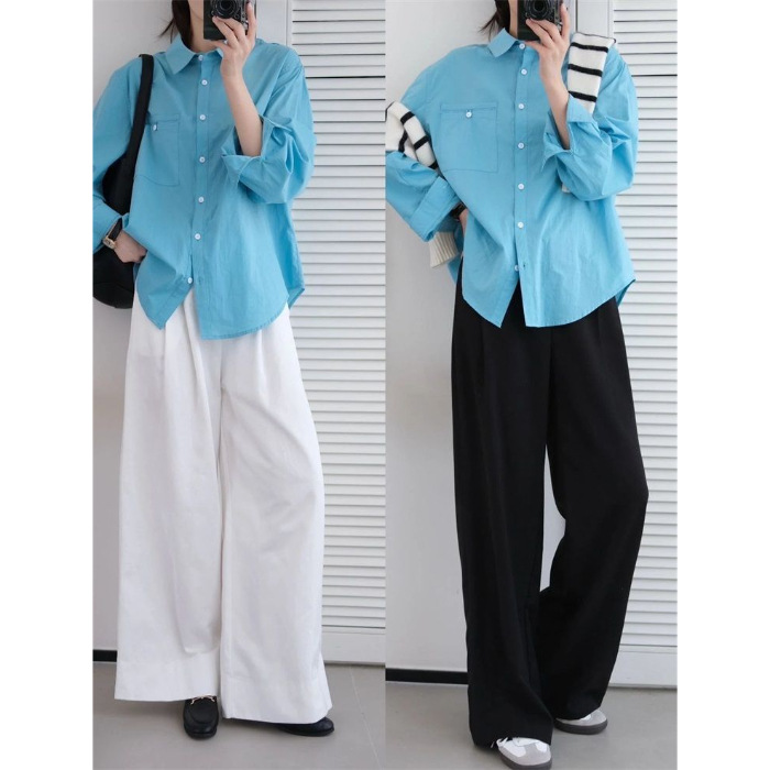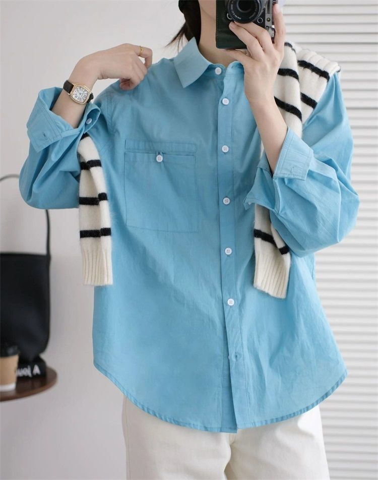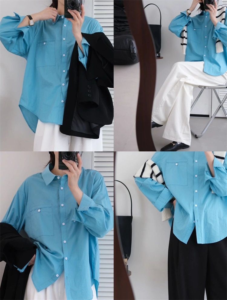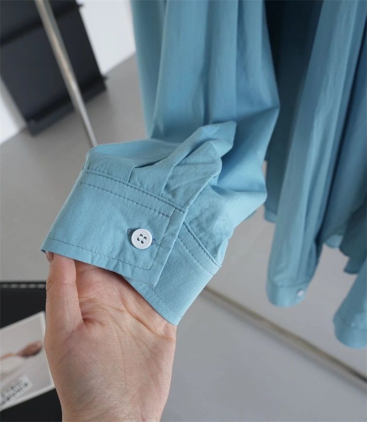 월든 레이크 블루 셔츠 100% 코튼 이른 봄 콜드 화이트 스킨 긴팔 루즈한 마이크로 와이드 드롭 숄더 슬리브 캐주얼 통근복스토어 가기
