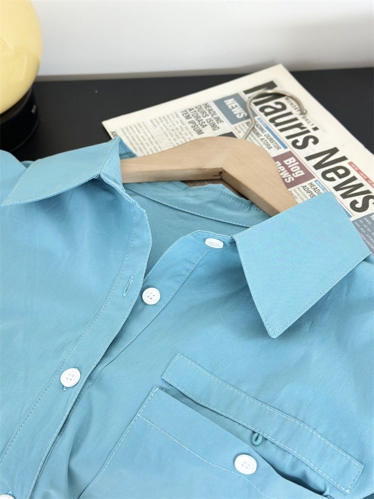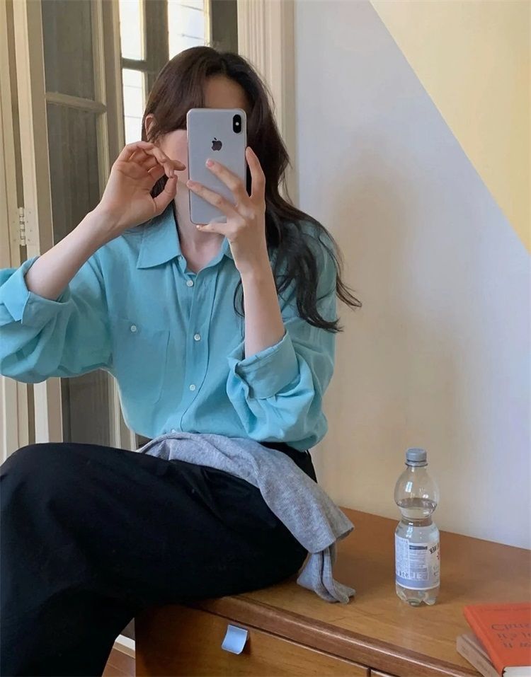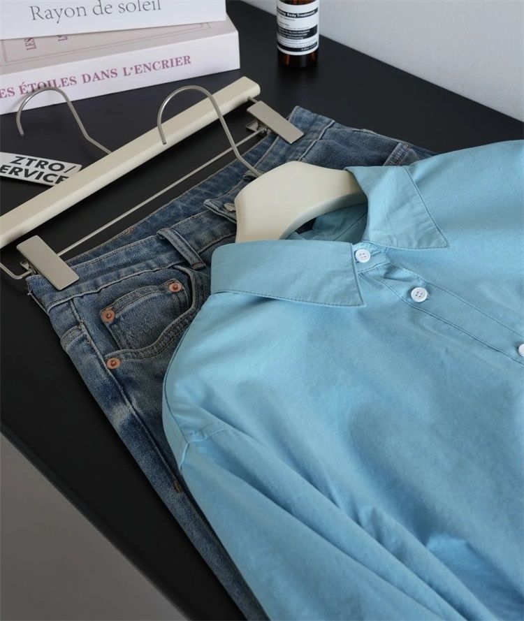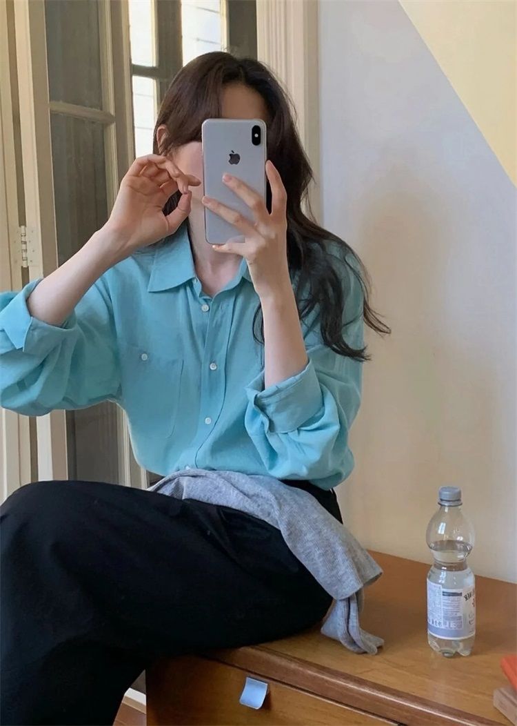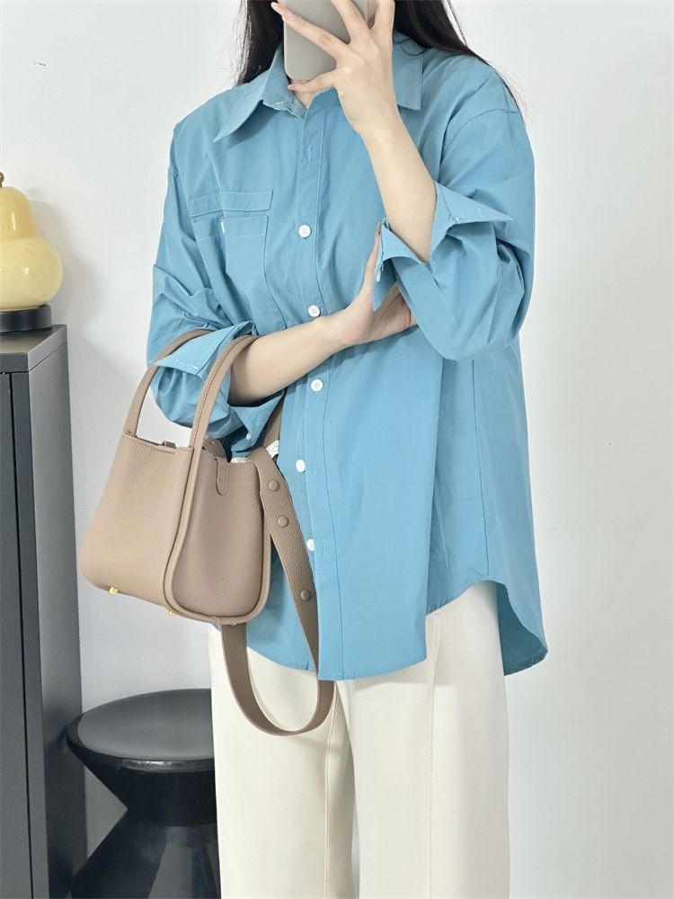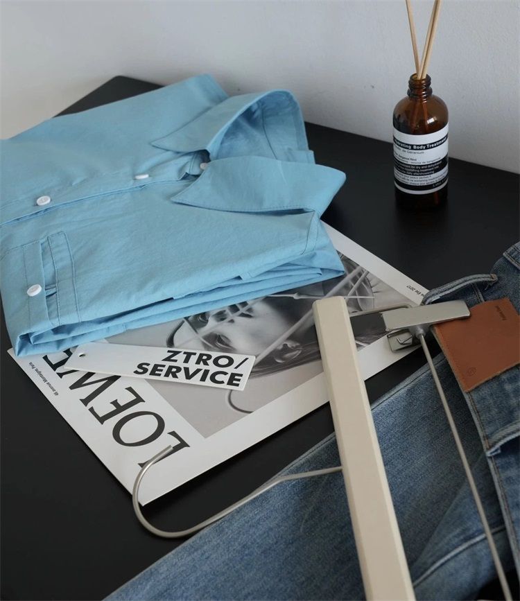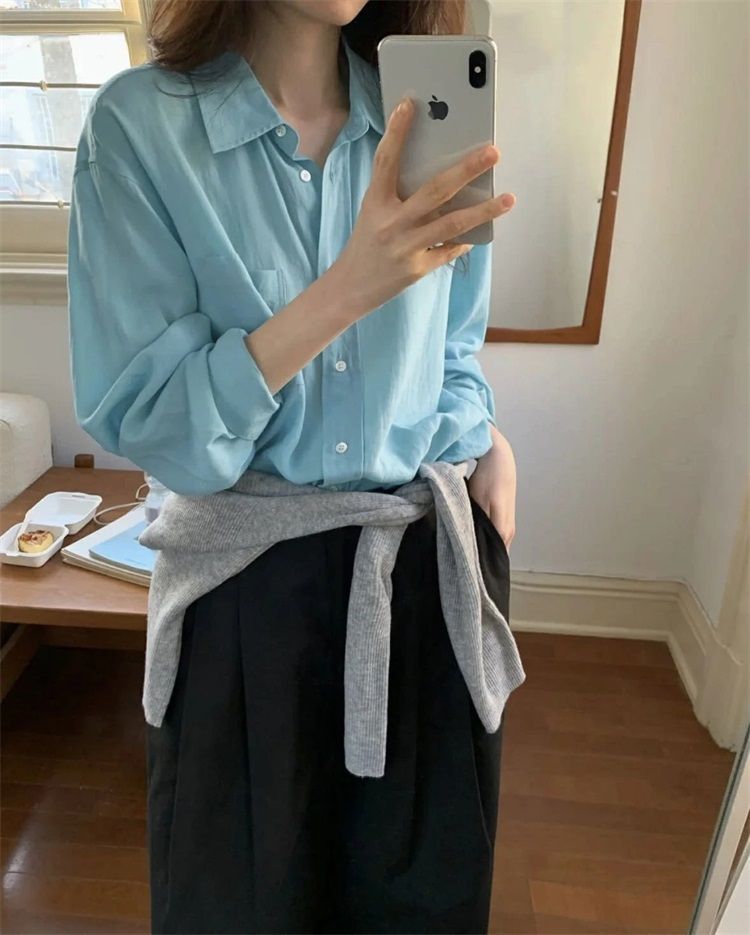 월든 레이크 블루 셔츠 100% 코튼 이른 봄 콜드 화이트 스킨 긴팔 루즈한 마이크로 와이드 드롭 숄더 슬리브 캐주얼 통근복스토어 가기