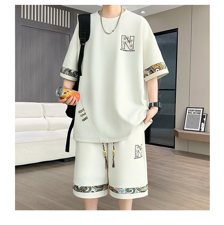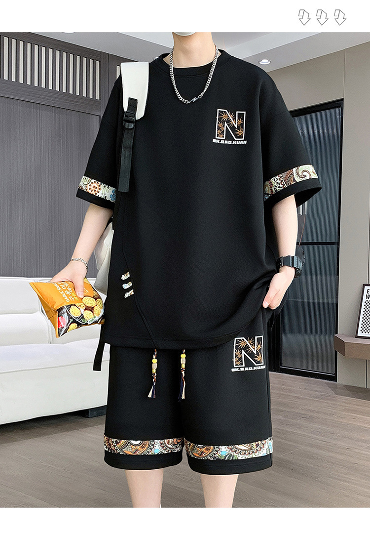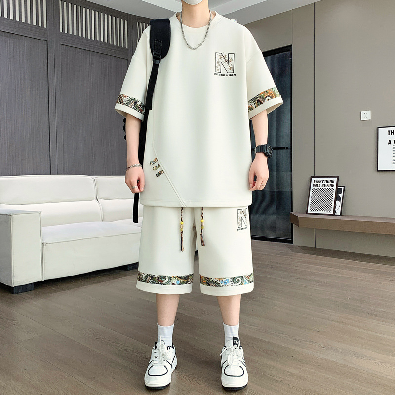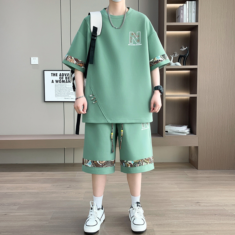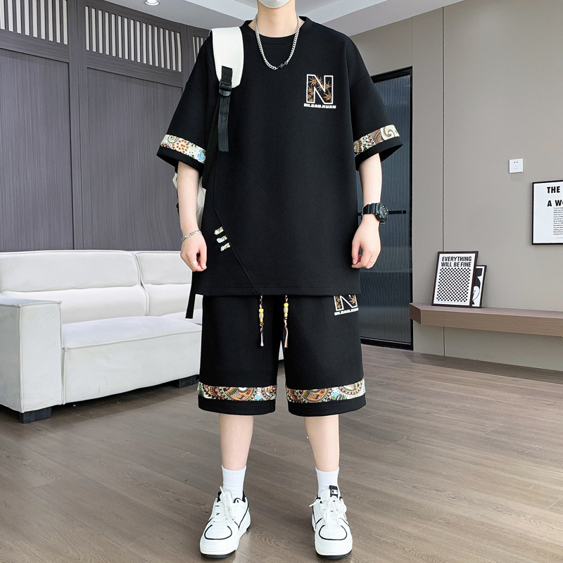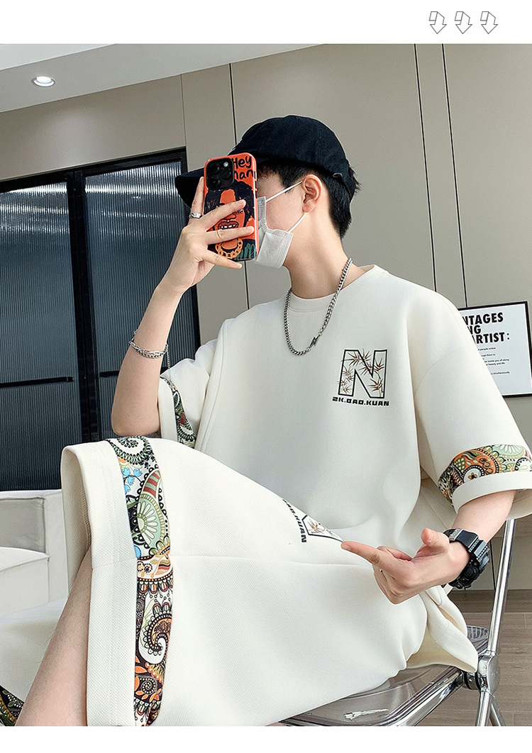 2025 새로운 폭발 세트 홍콩 스타일 청소년 패션 트렌드 조커 짧은 소매 반바지 남성스토어 가기