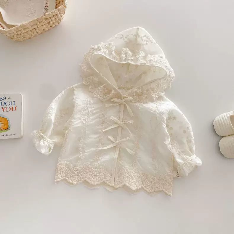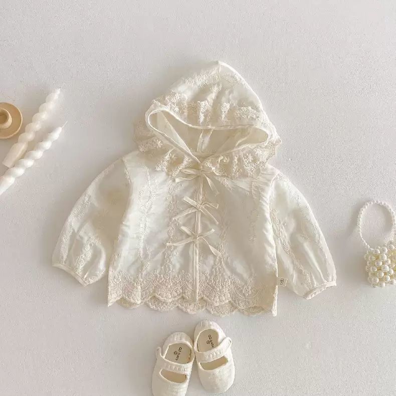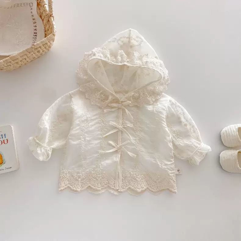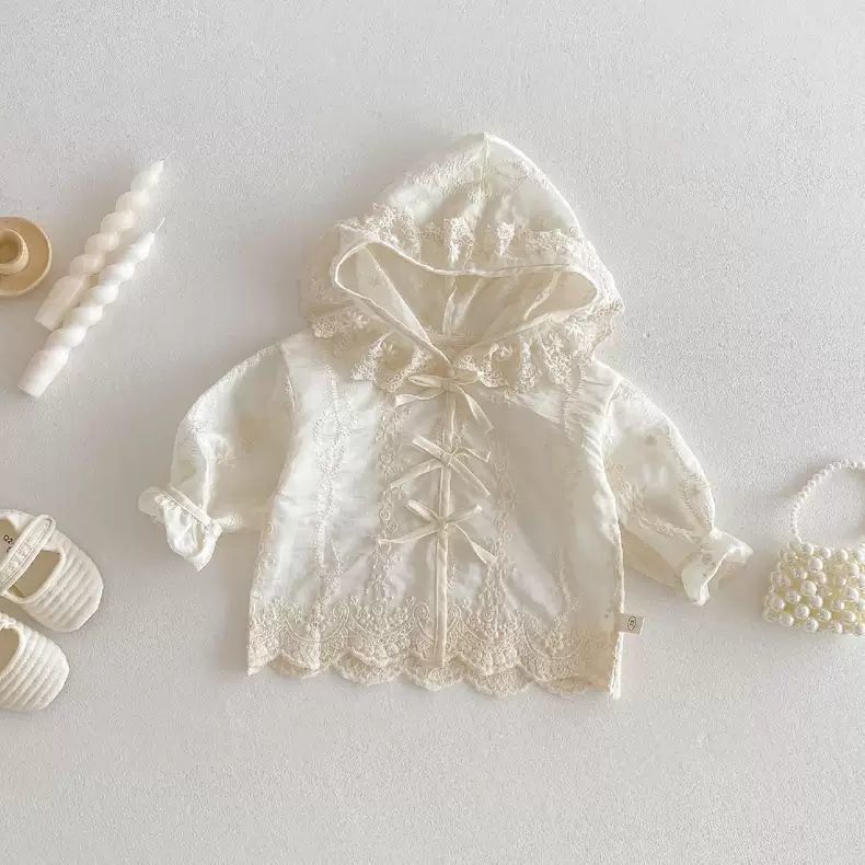 봄과 여름 새 아기 소녀 얇은 레이스 코트 유아 긴팔 탑 소녀 후드 공주 옷 카디건스토어 가기
