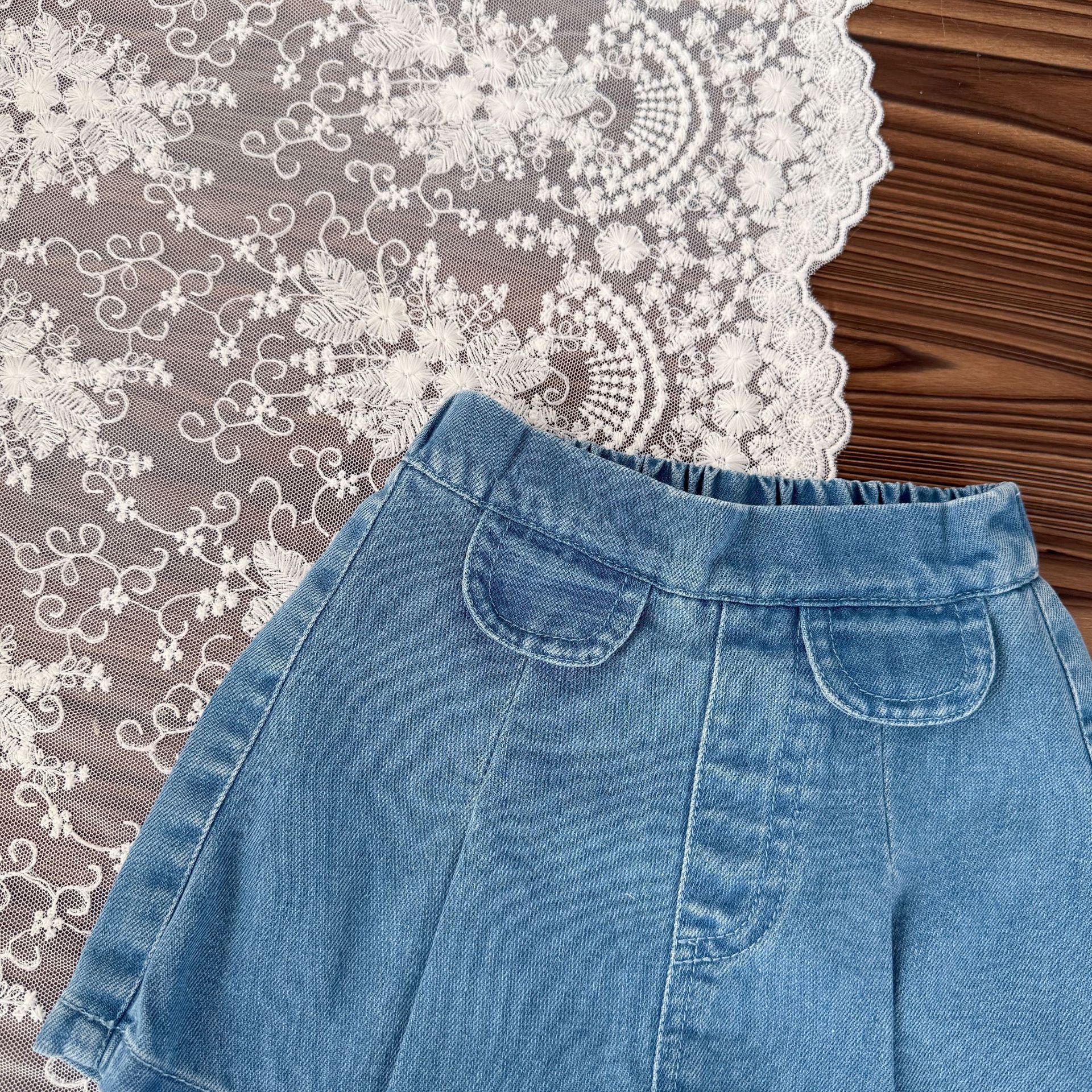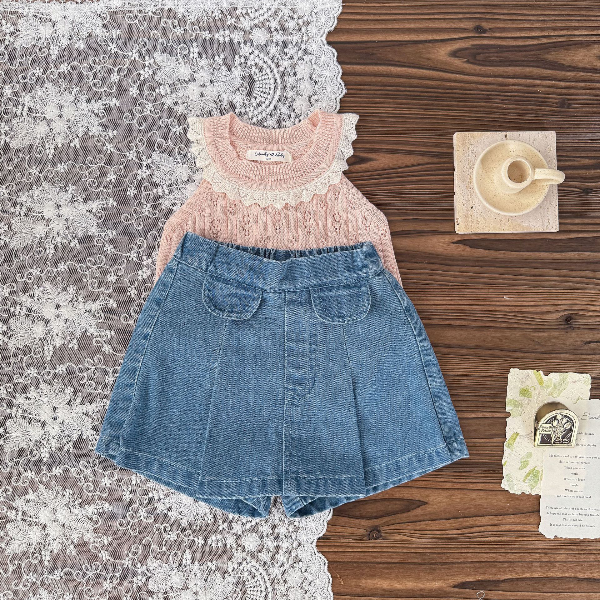 귀여운 봄과 여름 아기 소녀의 귀여운 데님 흉상 바지 스커트 여성용 포켓 커버 부드러운 데님 반바지