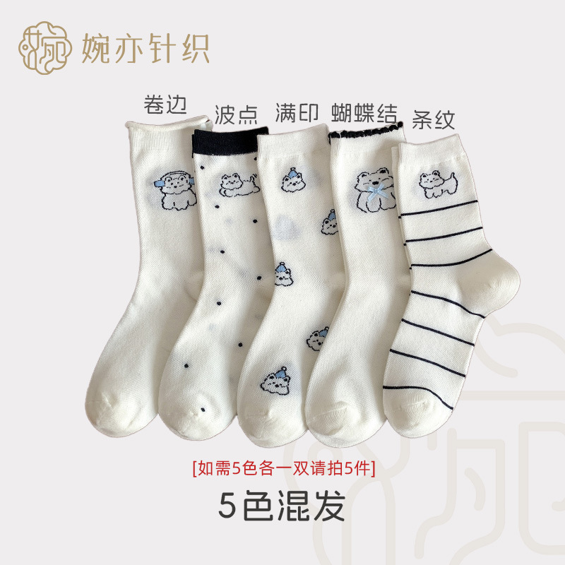 여름 얇은 만화 강아지 양말 여성 메쉬 땀 흡수 통기성 간단한 귀여운 줄무늬 폴카 도트 화이트 미드 튜브 양말