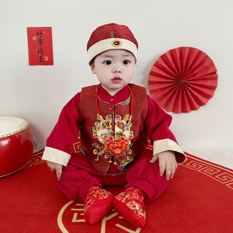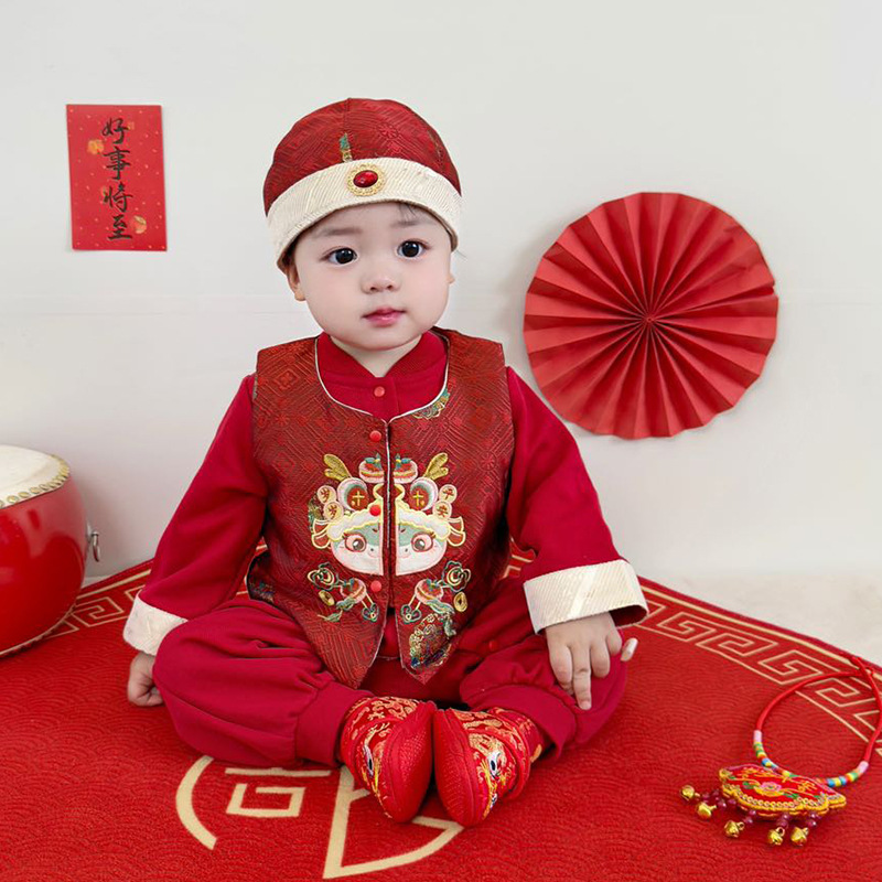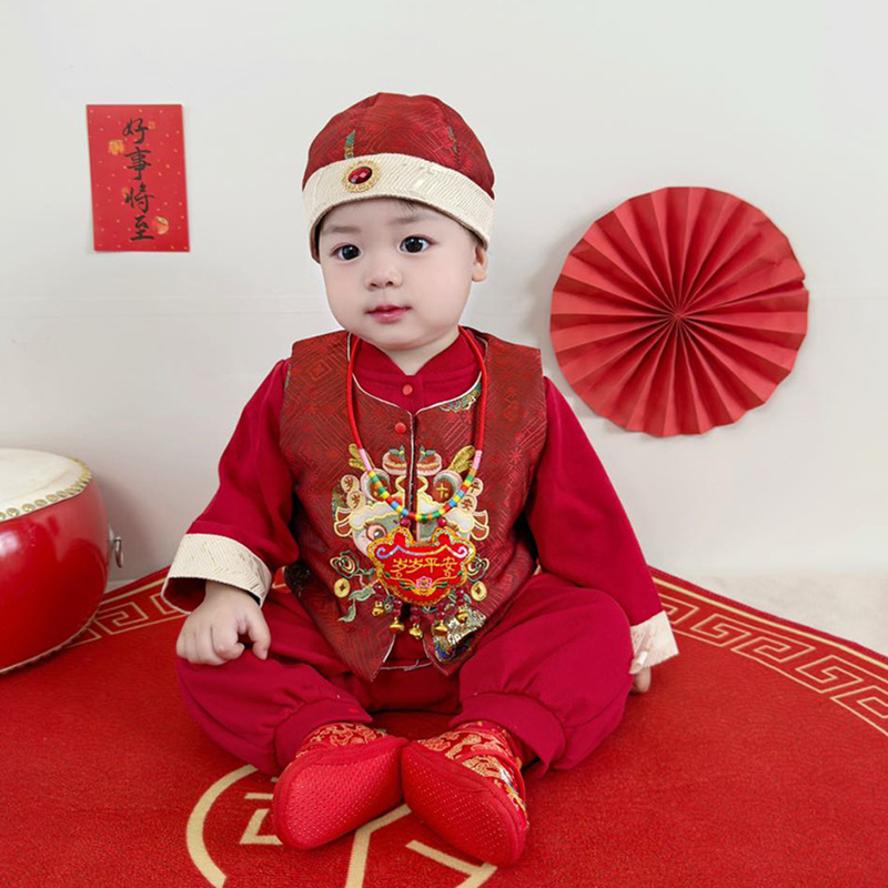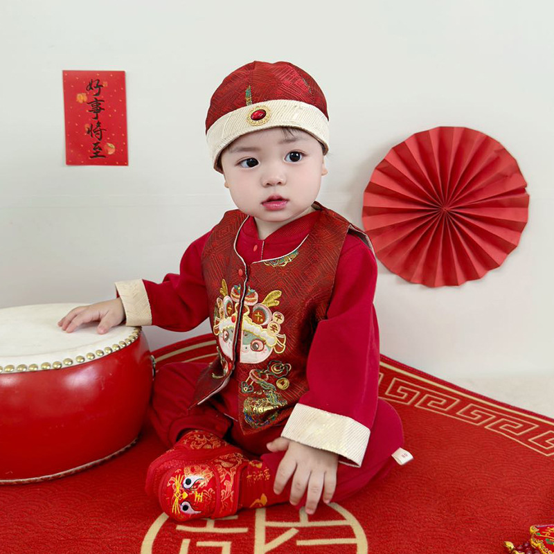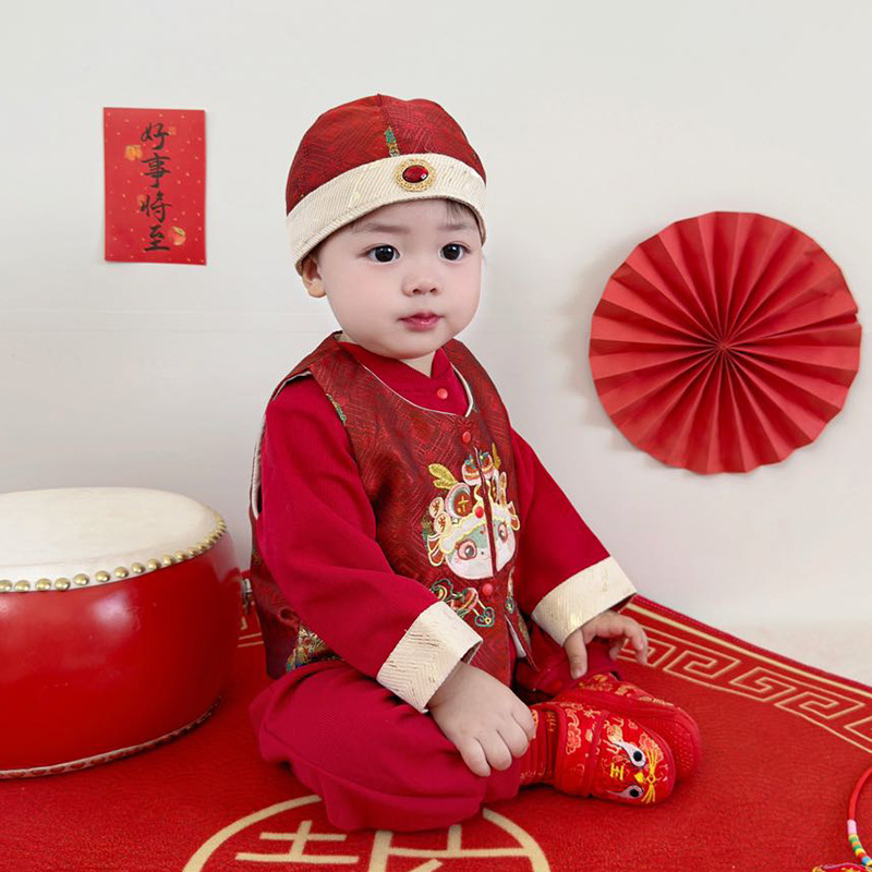 아기 옷 빨간색 새로운 중국 스타일 점프 슈트 + 조끼 정장 봄 옷 아기 소년의 100 일 연회 한 살짜리 드레스