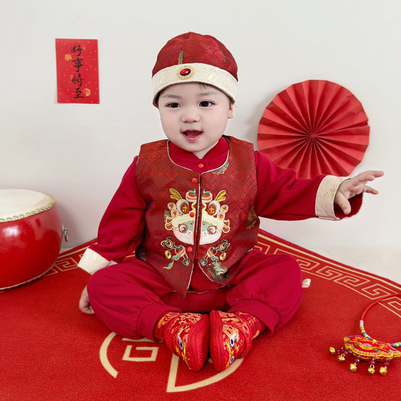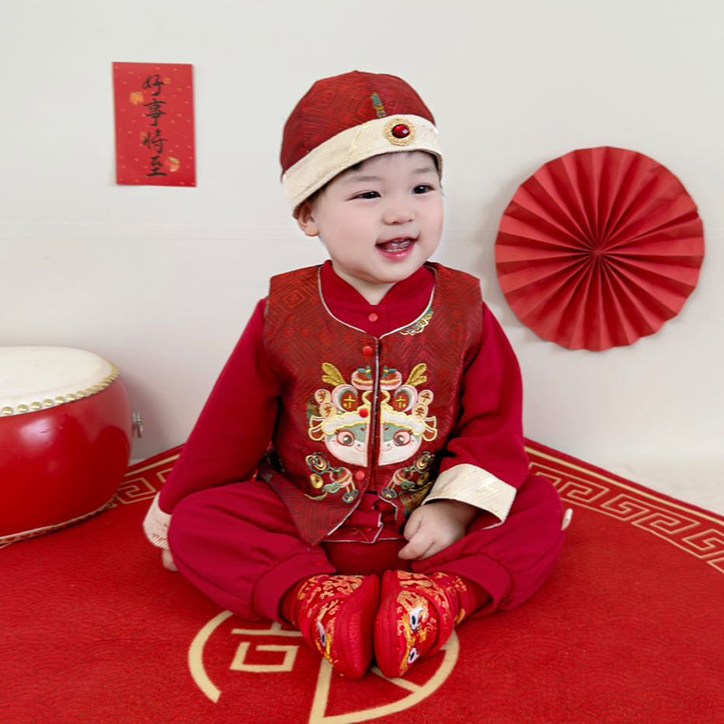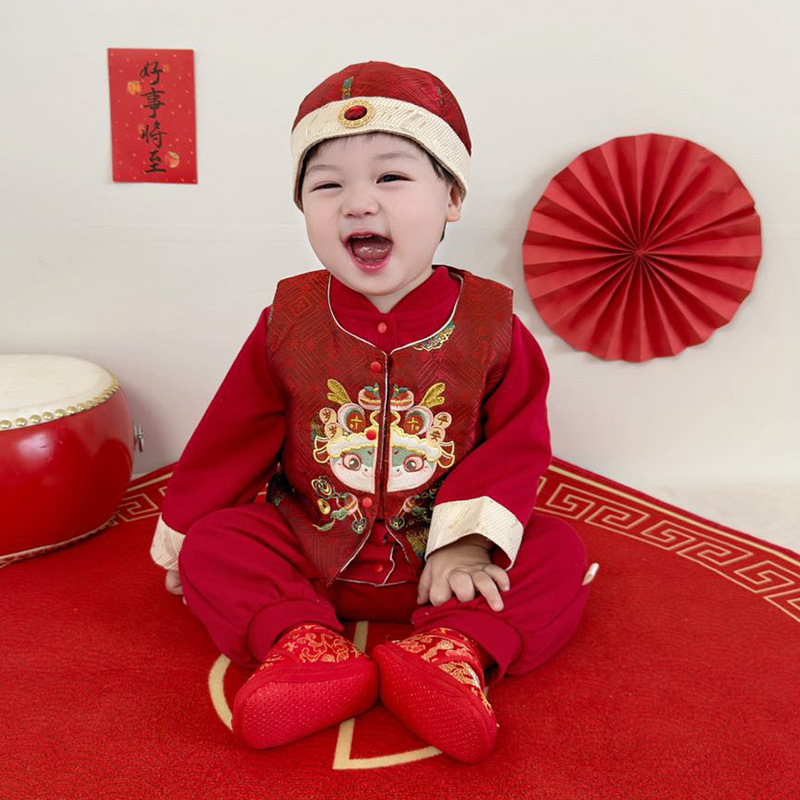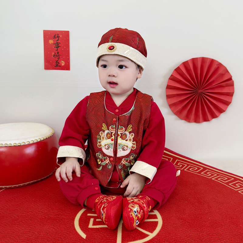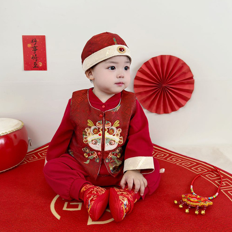 아기 옷 빨간색 새로운 중국 스타일 점프 슈트 + 조끼 정장 봄 옷 아기 소년의 100 일 연회 한 살짜리 드레스