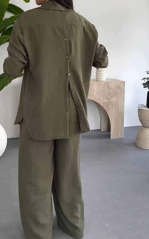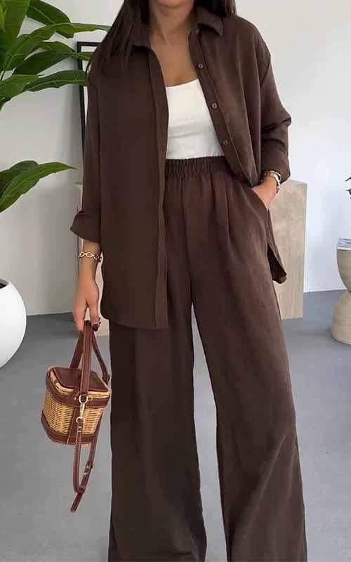 아마존 국경 간 패션 봄과 여름 느슨한 단일 가슴 긴 소매 단색 셔츠 플러스 사이즈 여성 캐주얼 바지 세트 여성스토어 가기