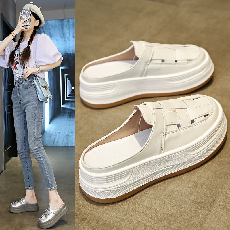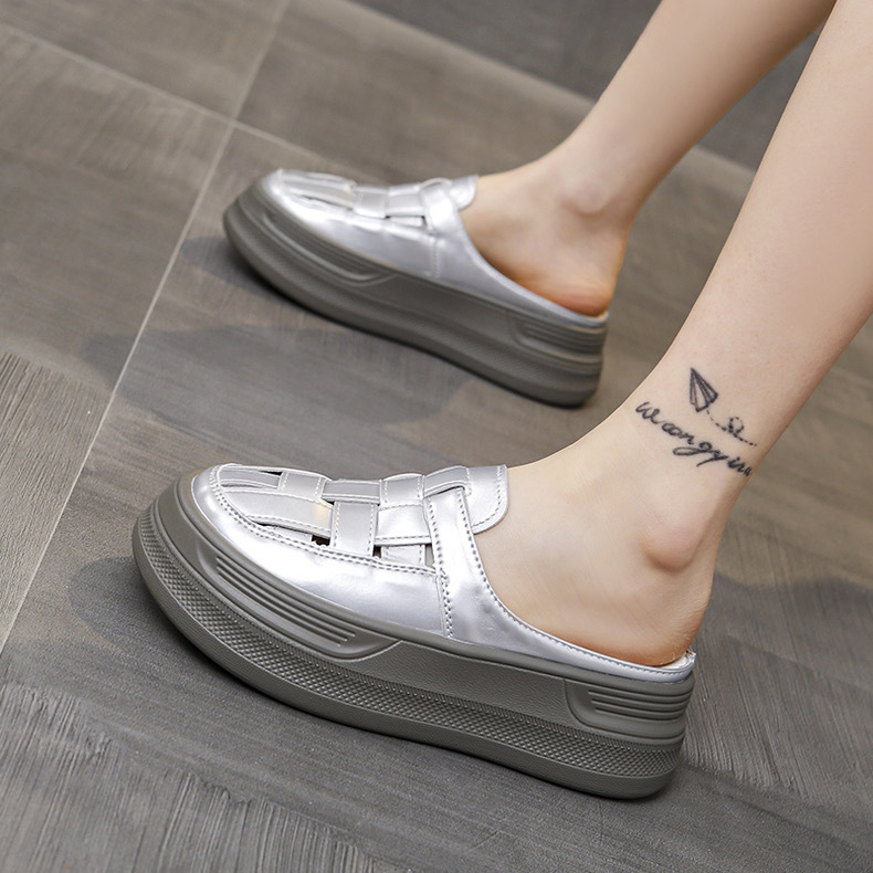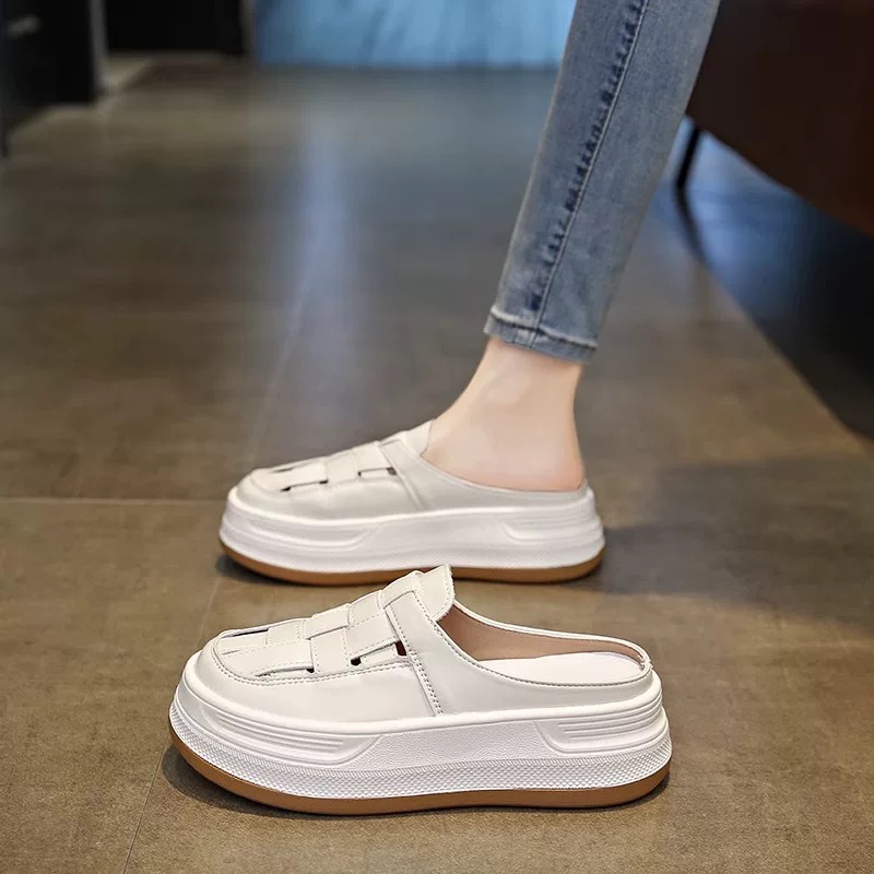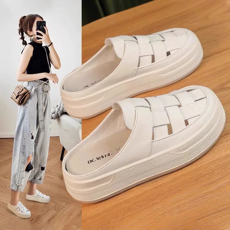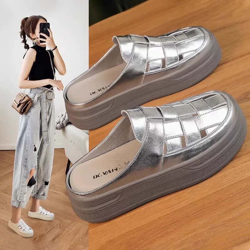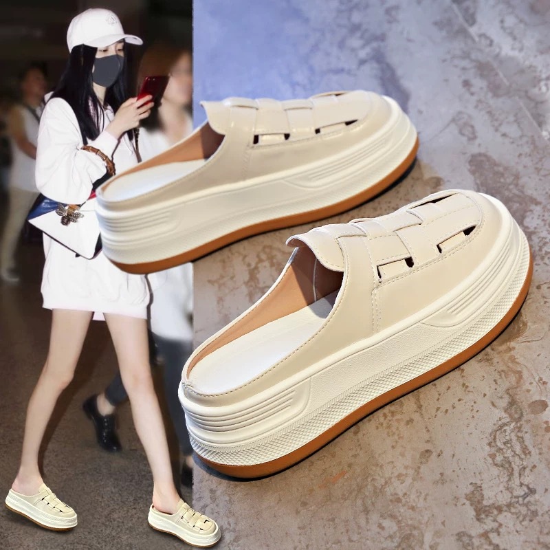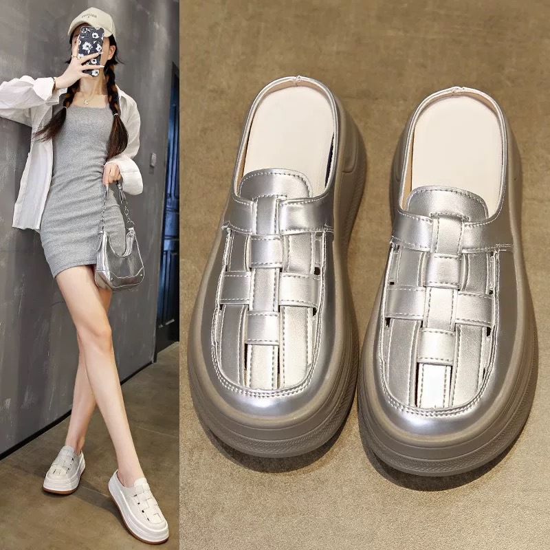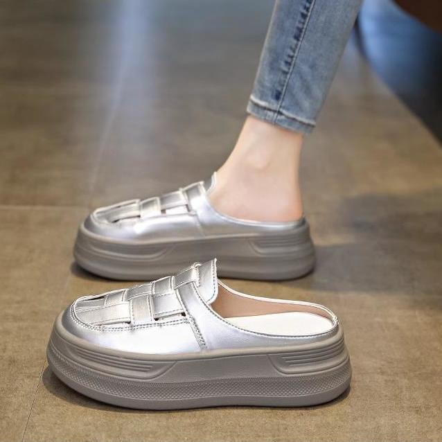 Baotou Woven 할로우 아웃 슬리퍼 여성 복장 봄 2025 새로운 폭발 복고풍 두꺼운 게으른 남자 플랫폼 샌들