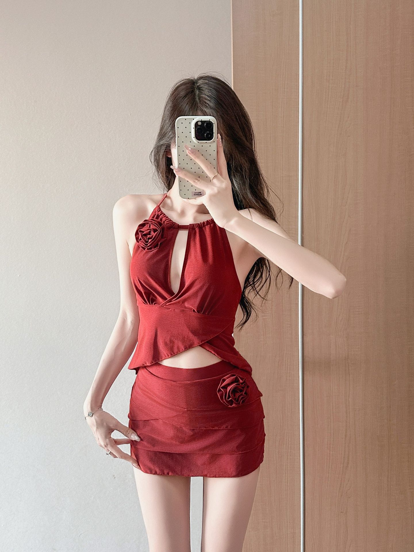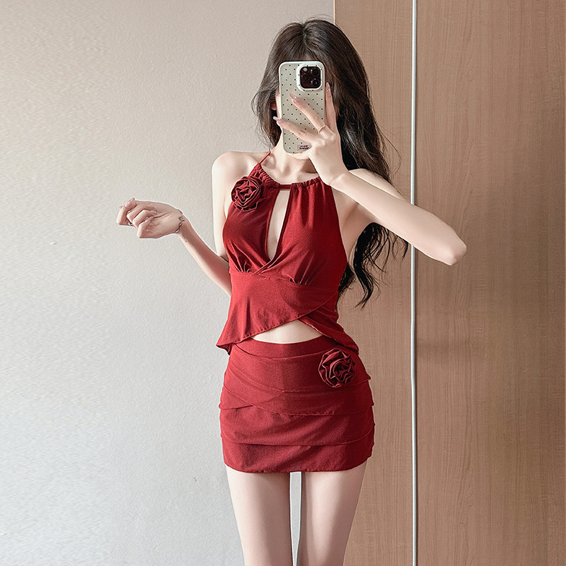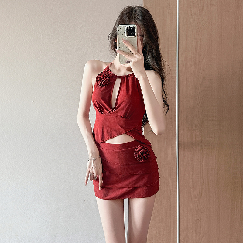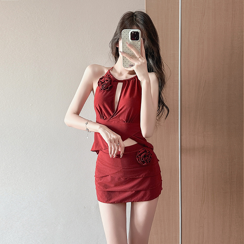 붉은 아름다운 목 분할 수영복 여성의 2025 새로운 폭발 순수한 욕망 작은 가슴 온천 하이 엔드 수영복스토어 가기