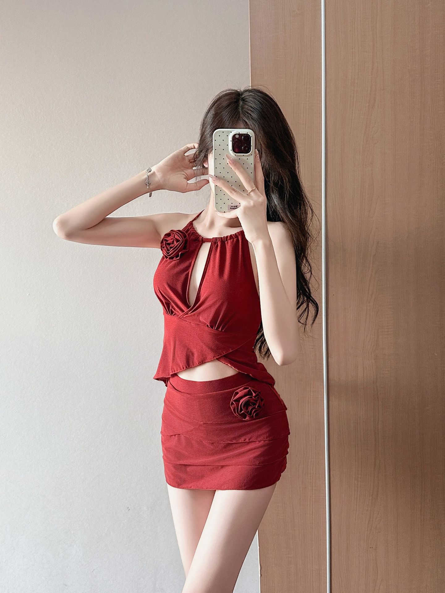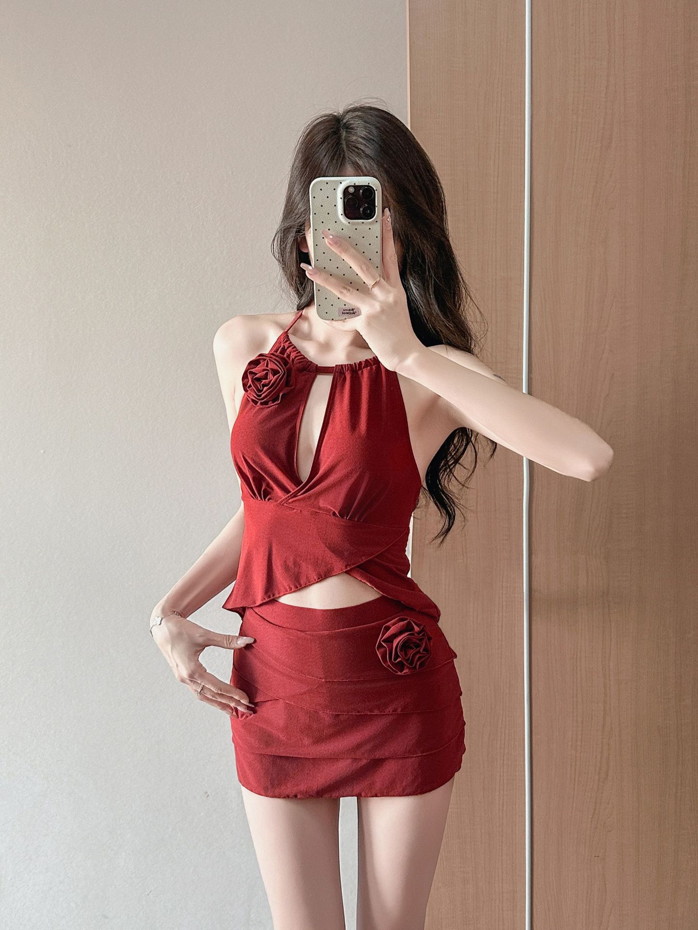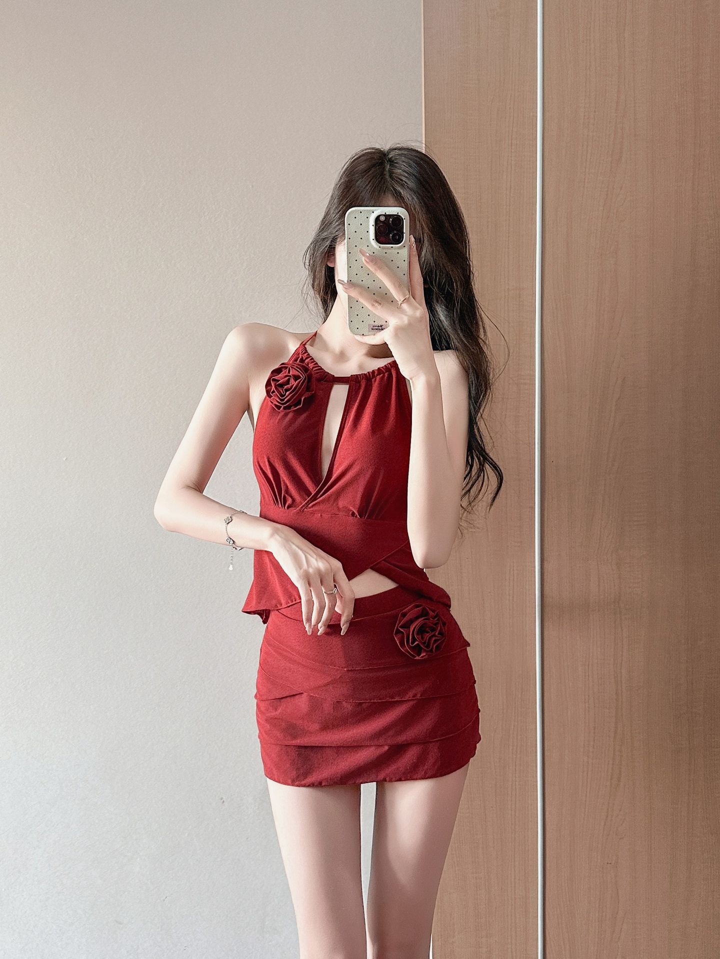 붉은 아름다운 목 분할 수영복 여성의 2025 새로운 폭발 순수한 욕망 작은 가슴 온천 하이 엔드 수영복스토어 가기