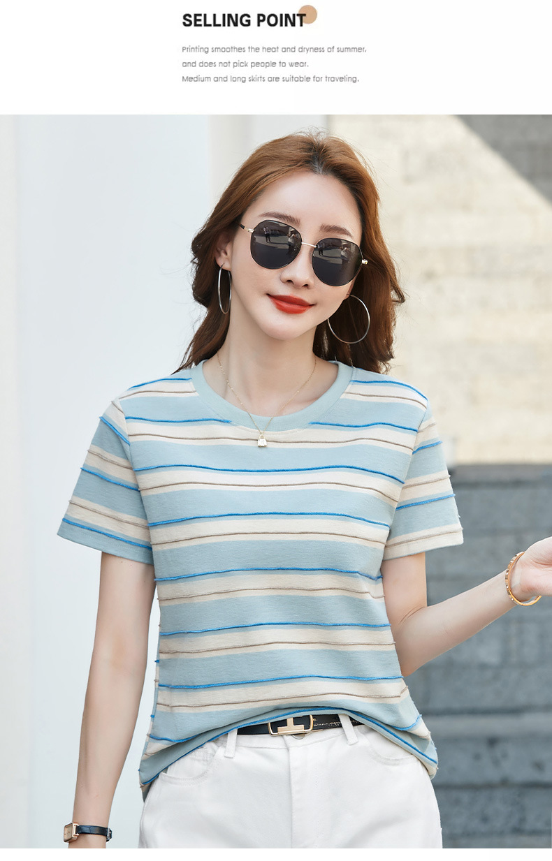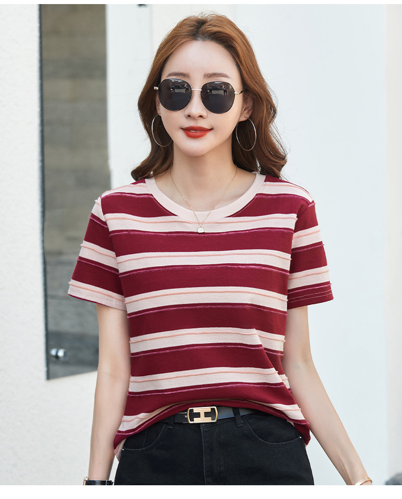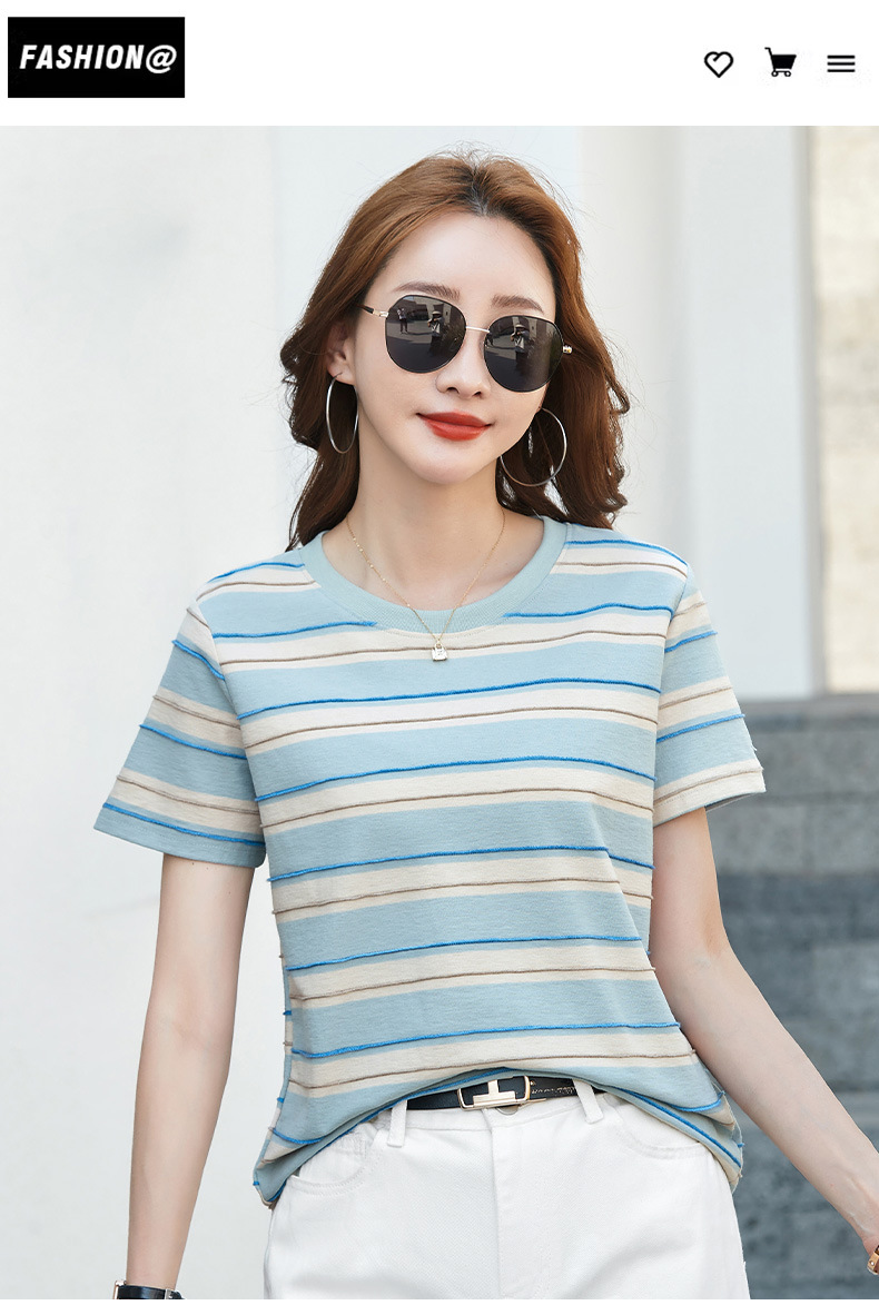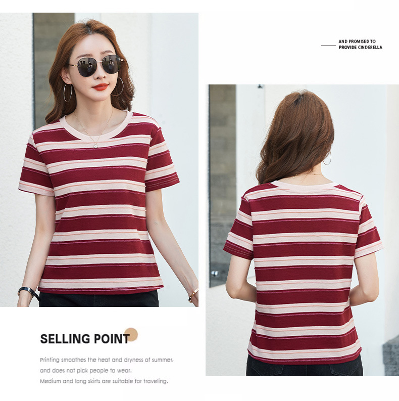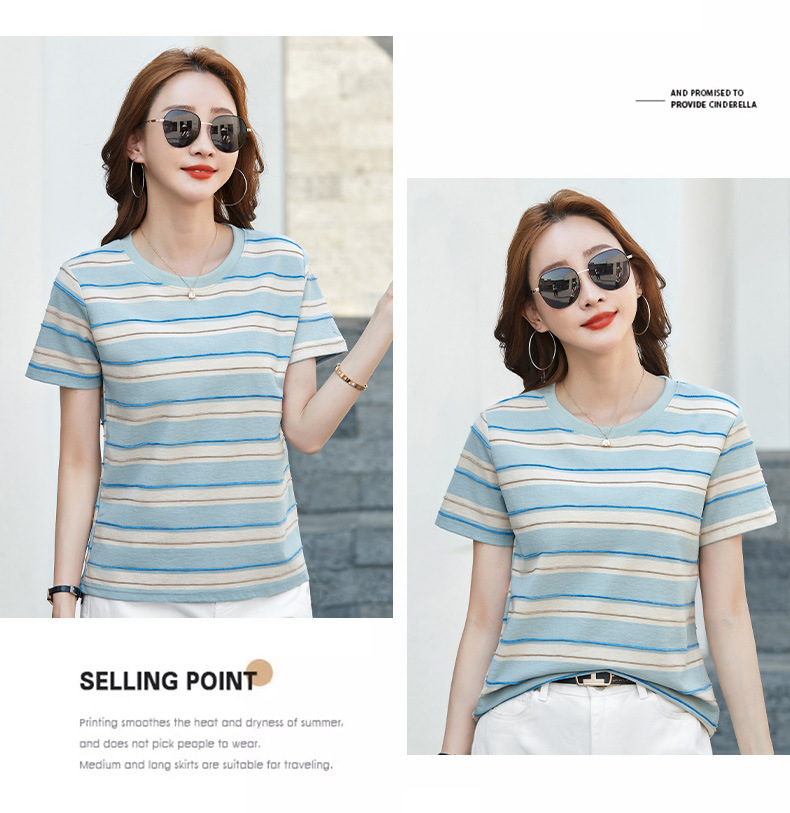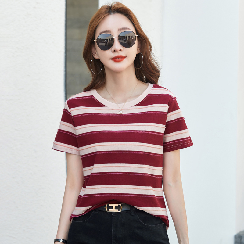 495 여름 새 어깨 반팔 줄무늬 티셔츠 여성용 대비 느슨한 색상 플러스 사이즈 둥근 목 예술적 빈티지 자카드 탑스토어 가기
