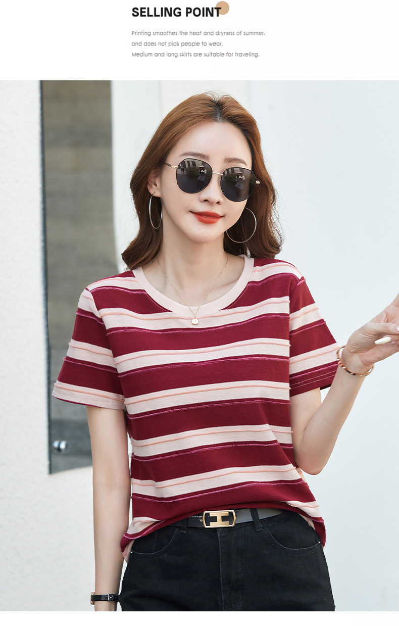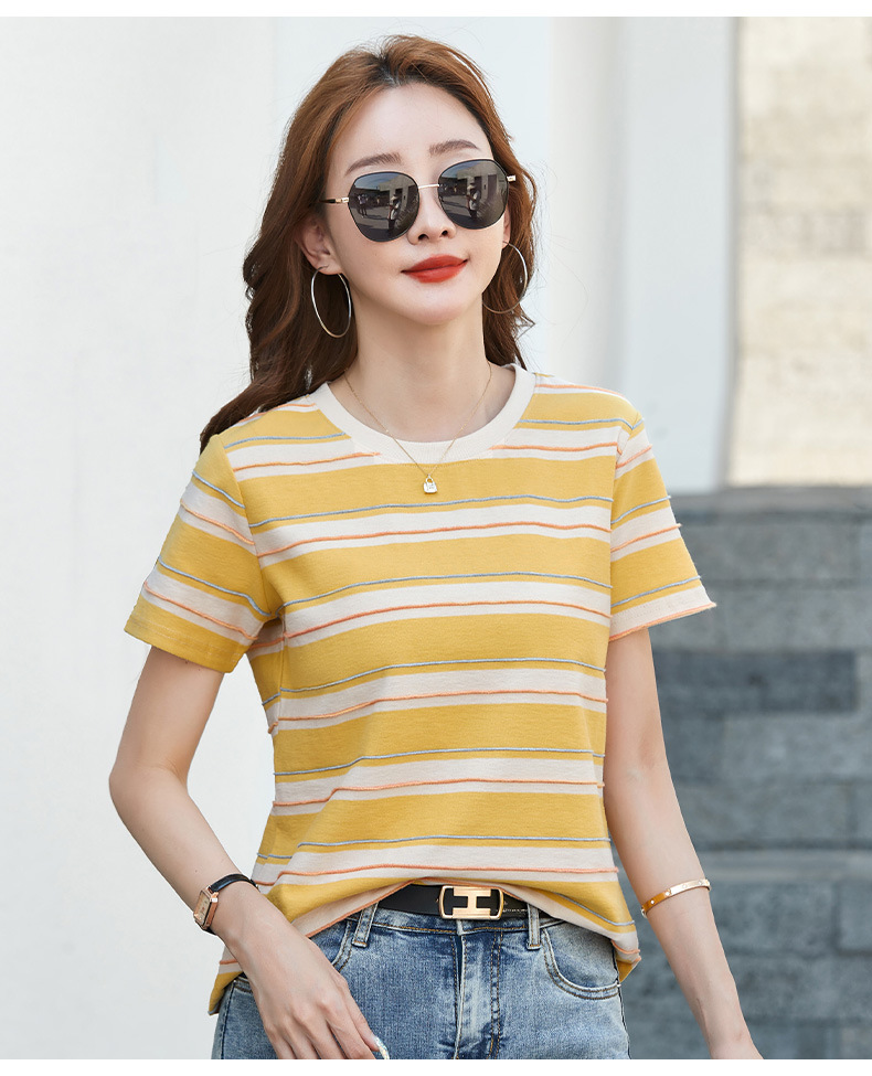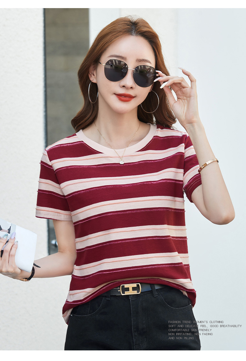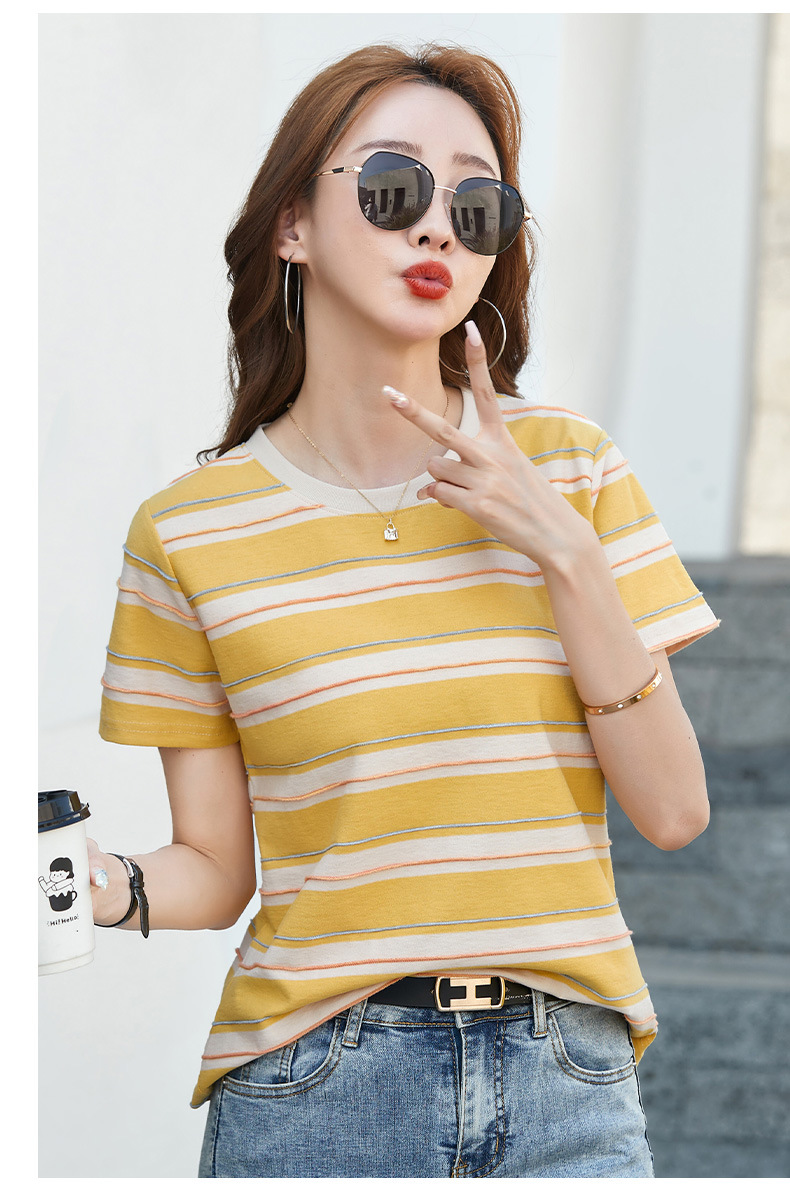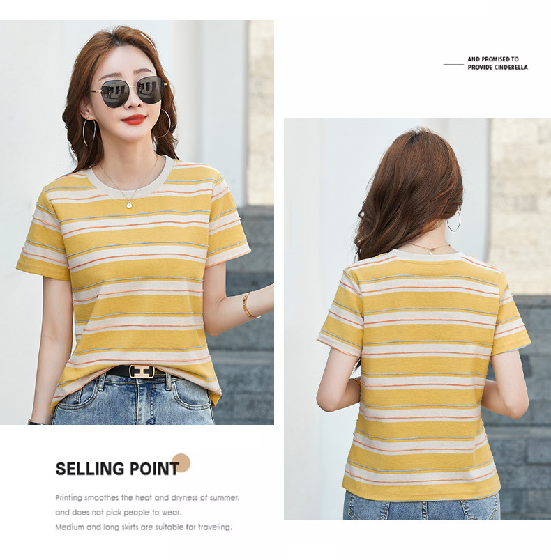 495 여름 새 어깨 반팔 줄무늬 티셔츠 여성용 대비 느슨한 색상 플러스 사이즈 둥근 목 예술적 빈티지 자카드 탑스토어 가기