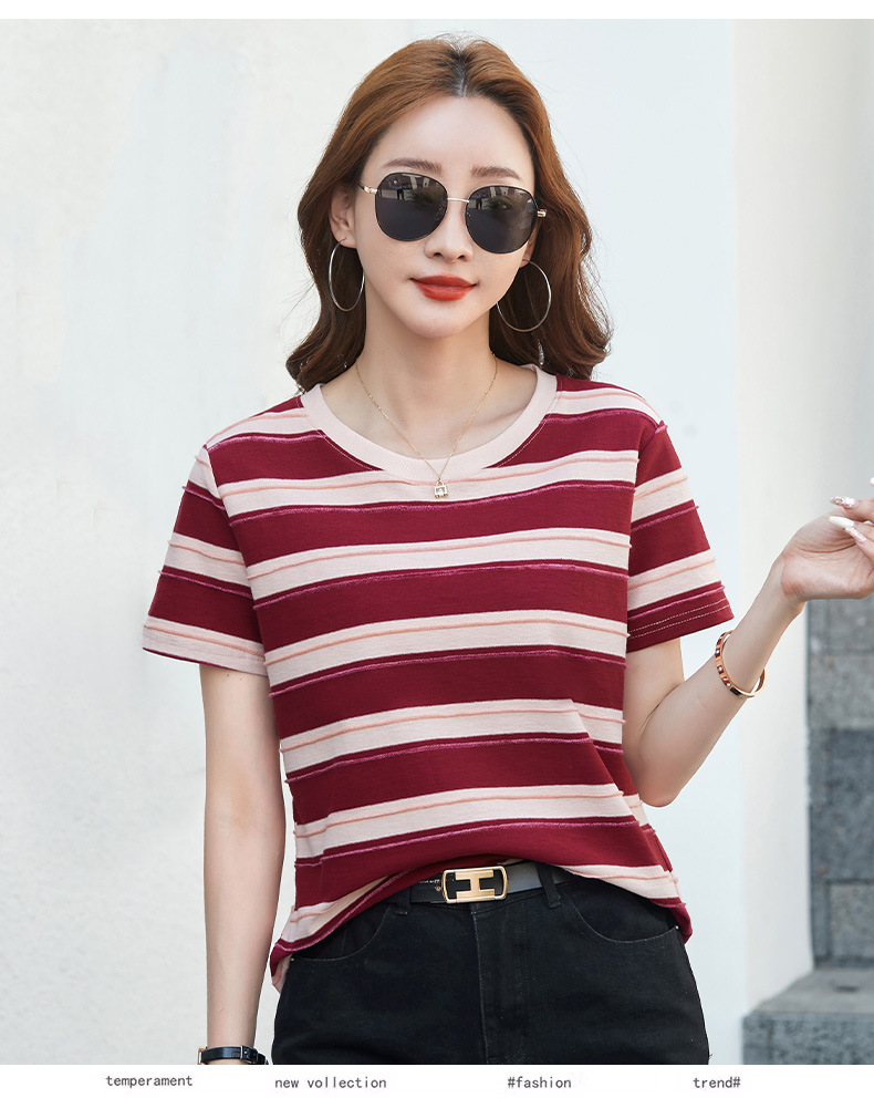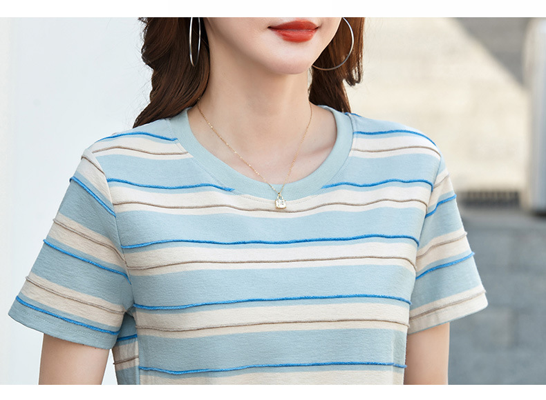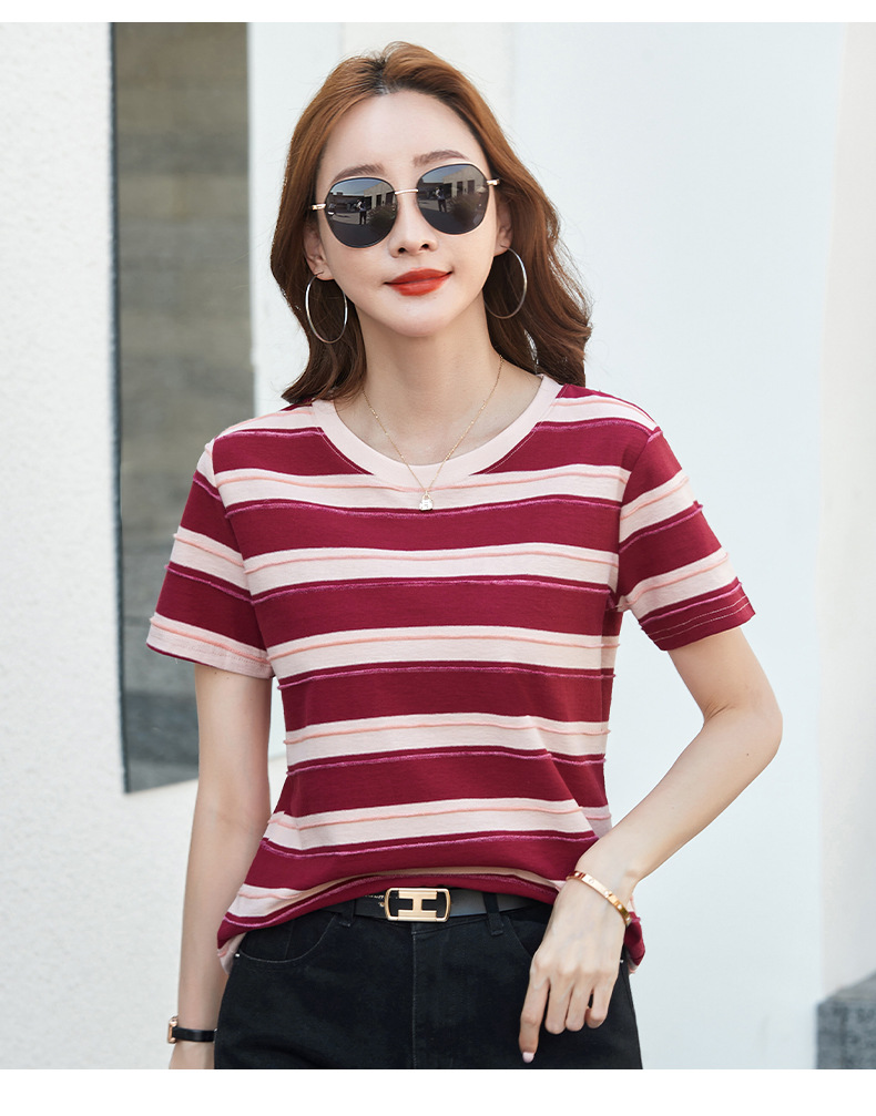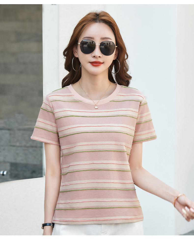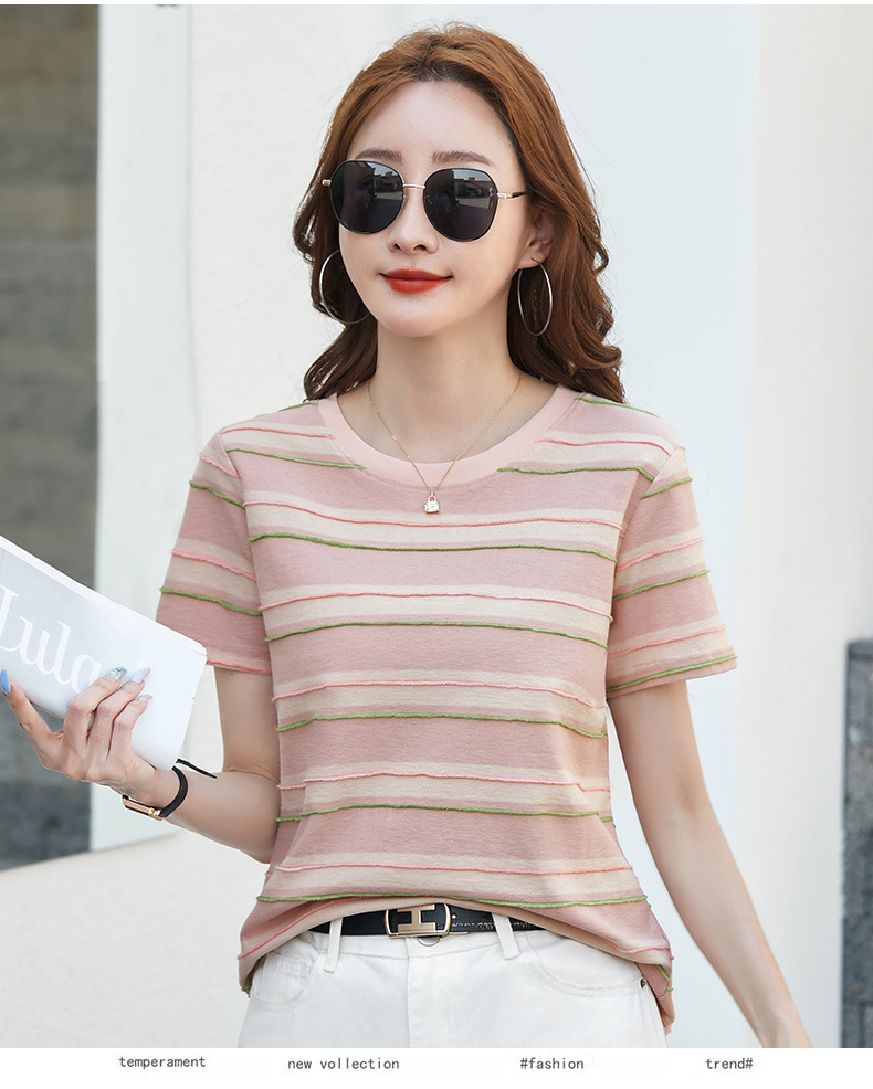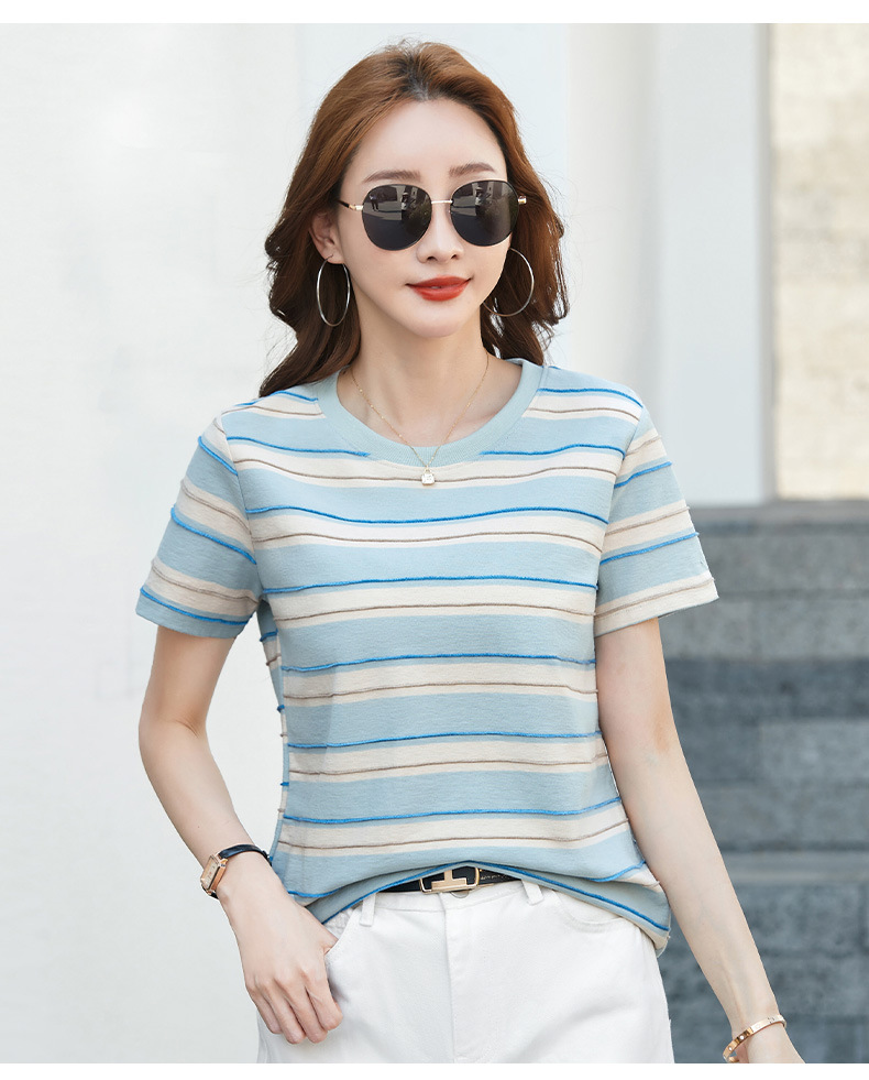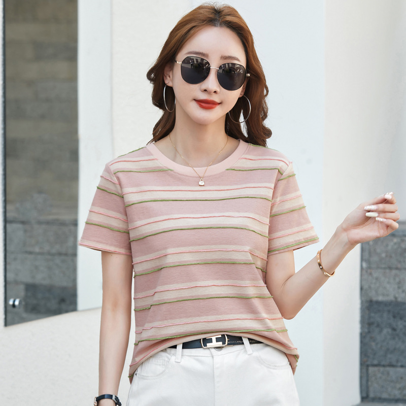 495 여름 새 어깨 반팔 줄무늬 티셔츠 여성용 대비 느슨한 색상 플러스 사이즈 둥근 목 예술적 빈티지 자카드 탑