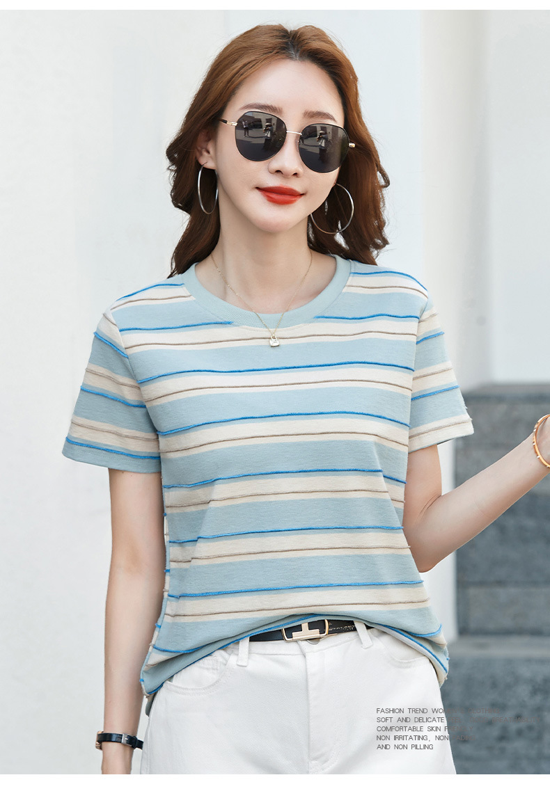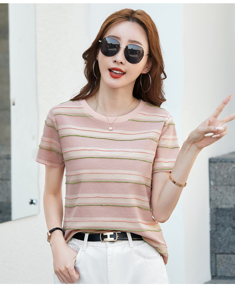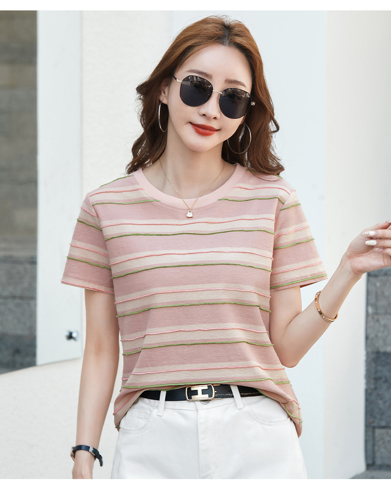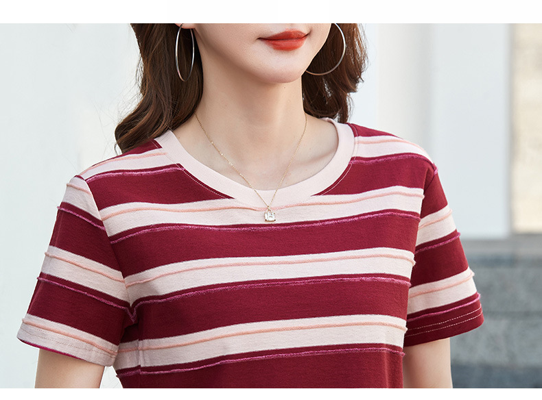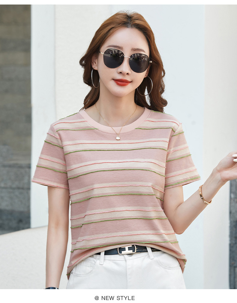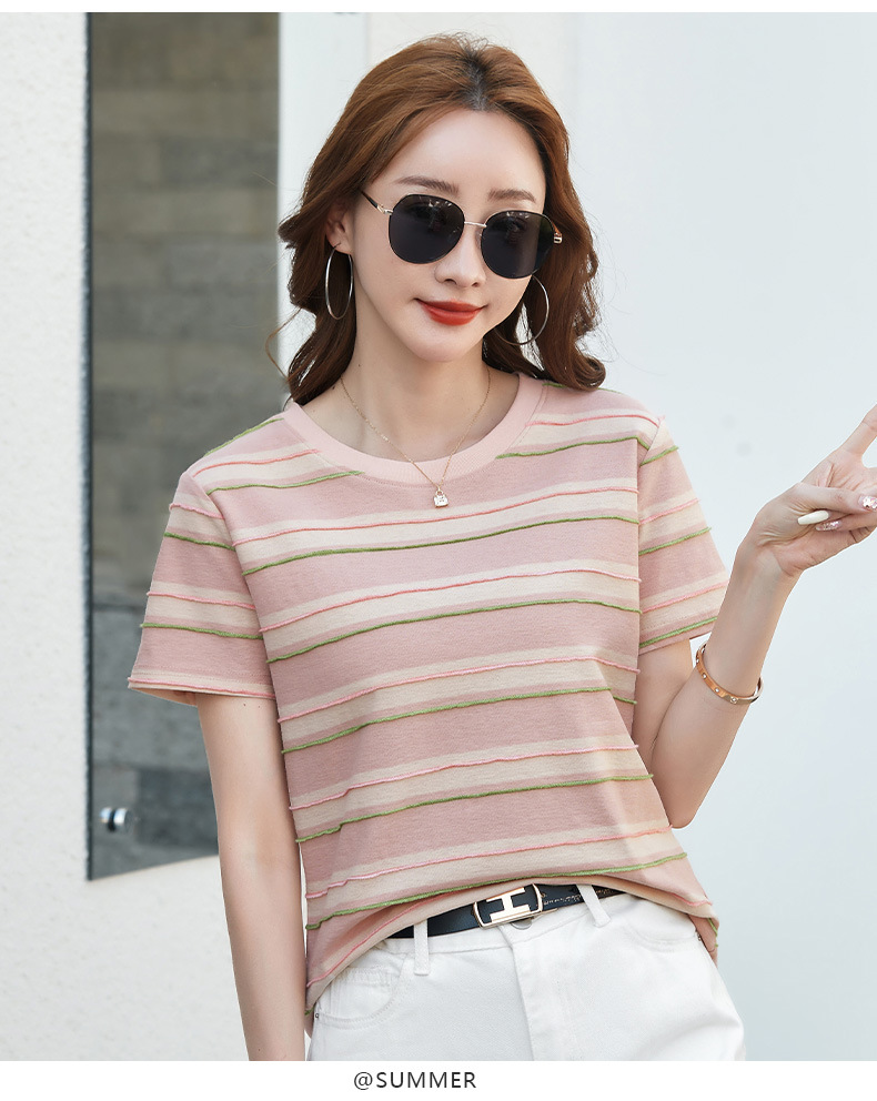 495 여름 새 어깨 반팔 줄무늬 티셔츠 여성용 대비 느슨한 색상 플러스 사이즈 둥근 목 예술적 빈티지 자카드 탑