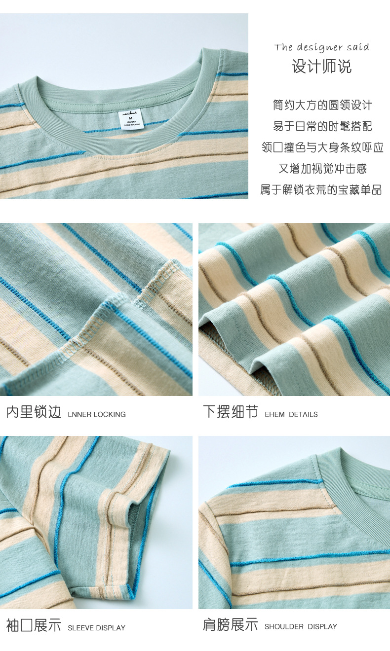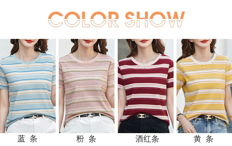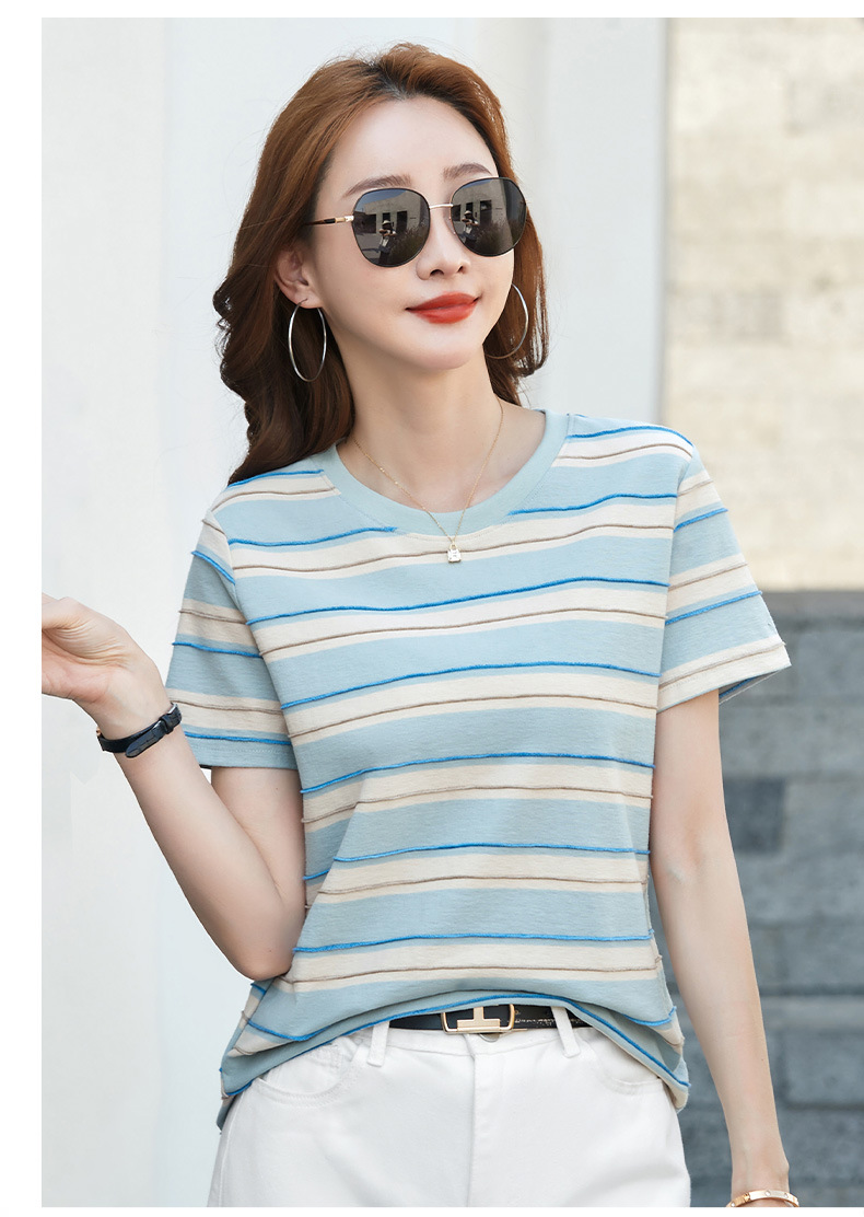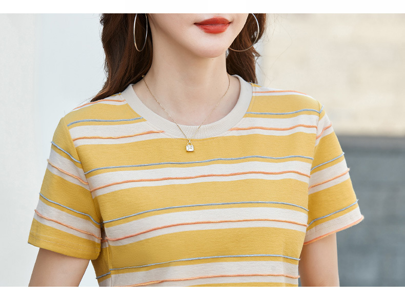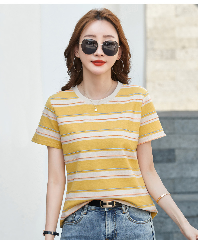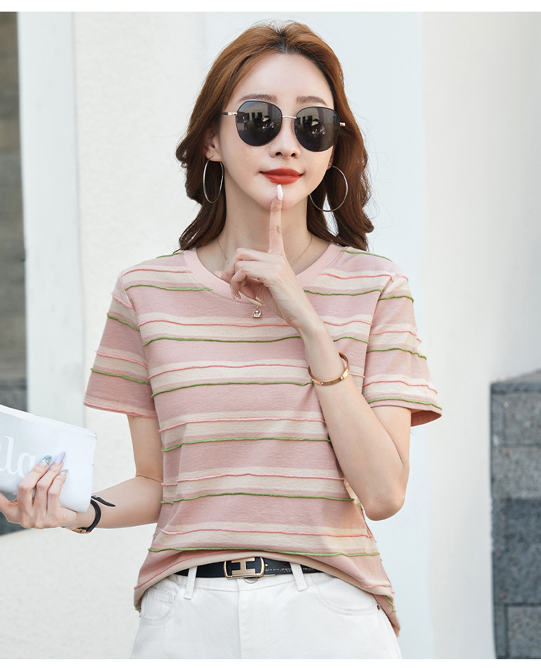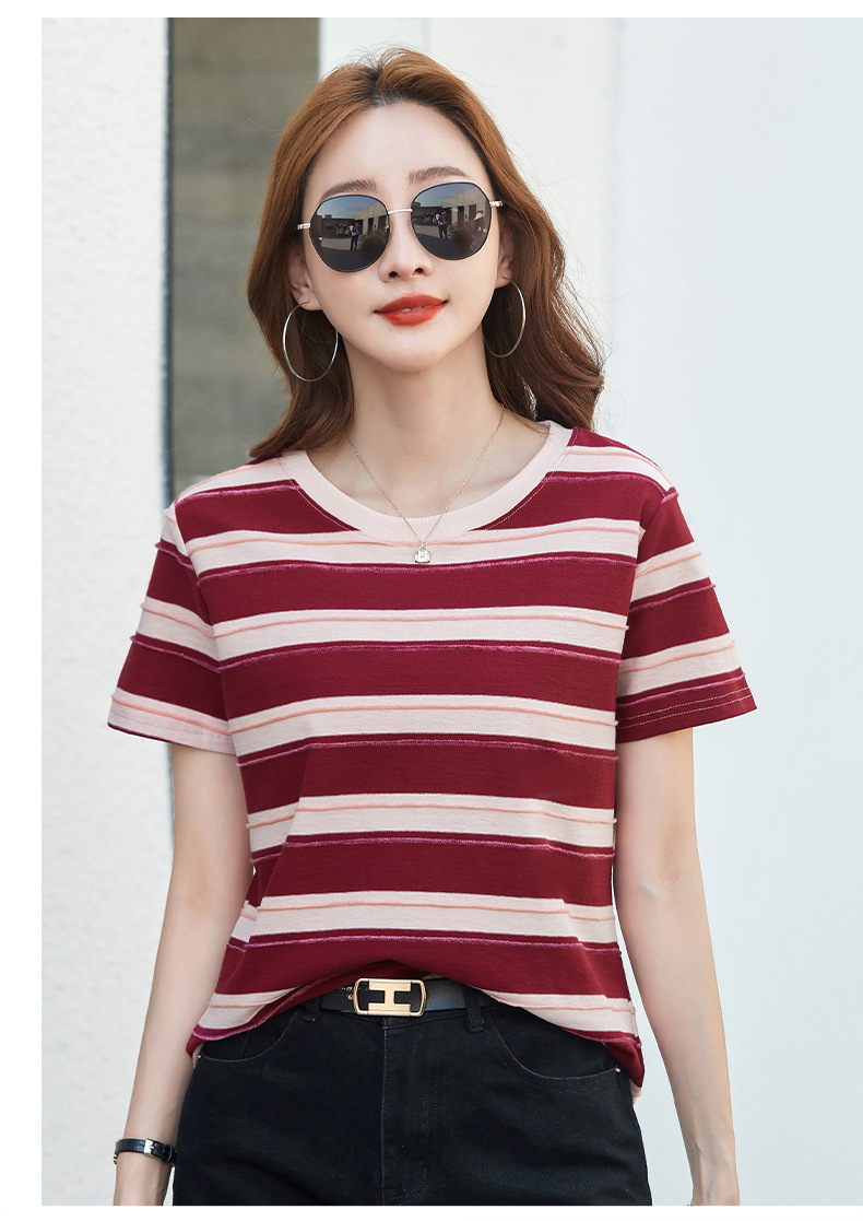 495 여름 새 어깨 반팔 줄무늬 티셔츠 여성용 대비 느슨한 색상 플러스 사이즈 둥근 목 예술적 빈티지 자카드 탑
