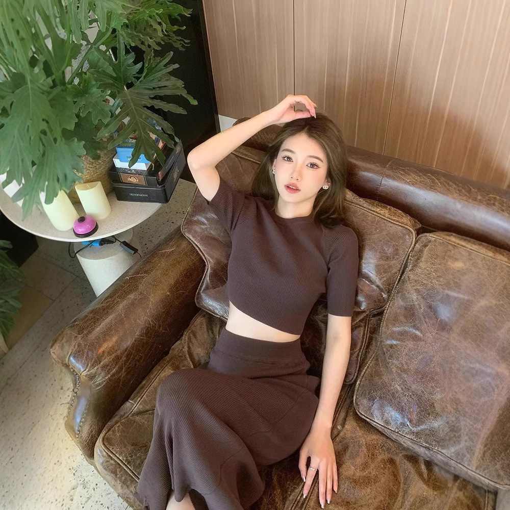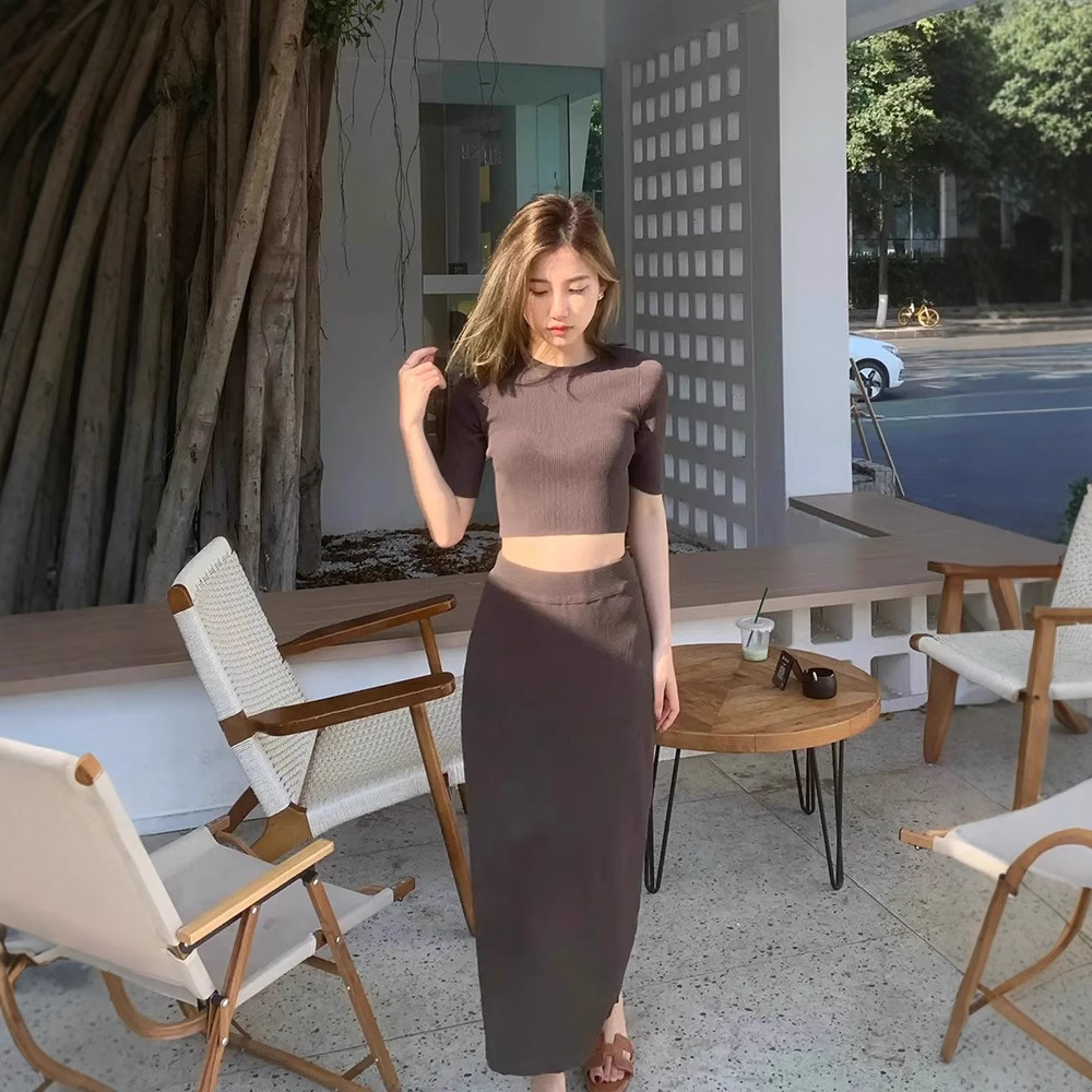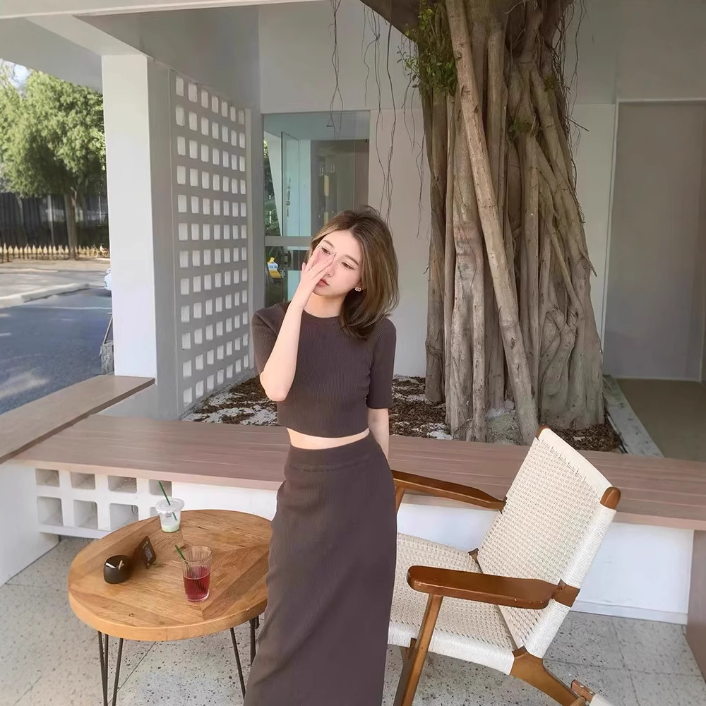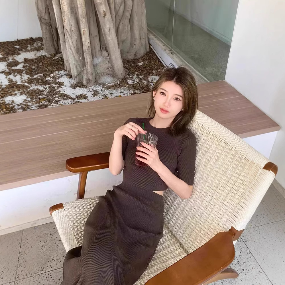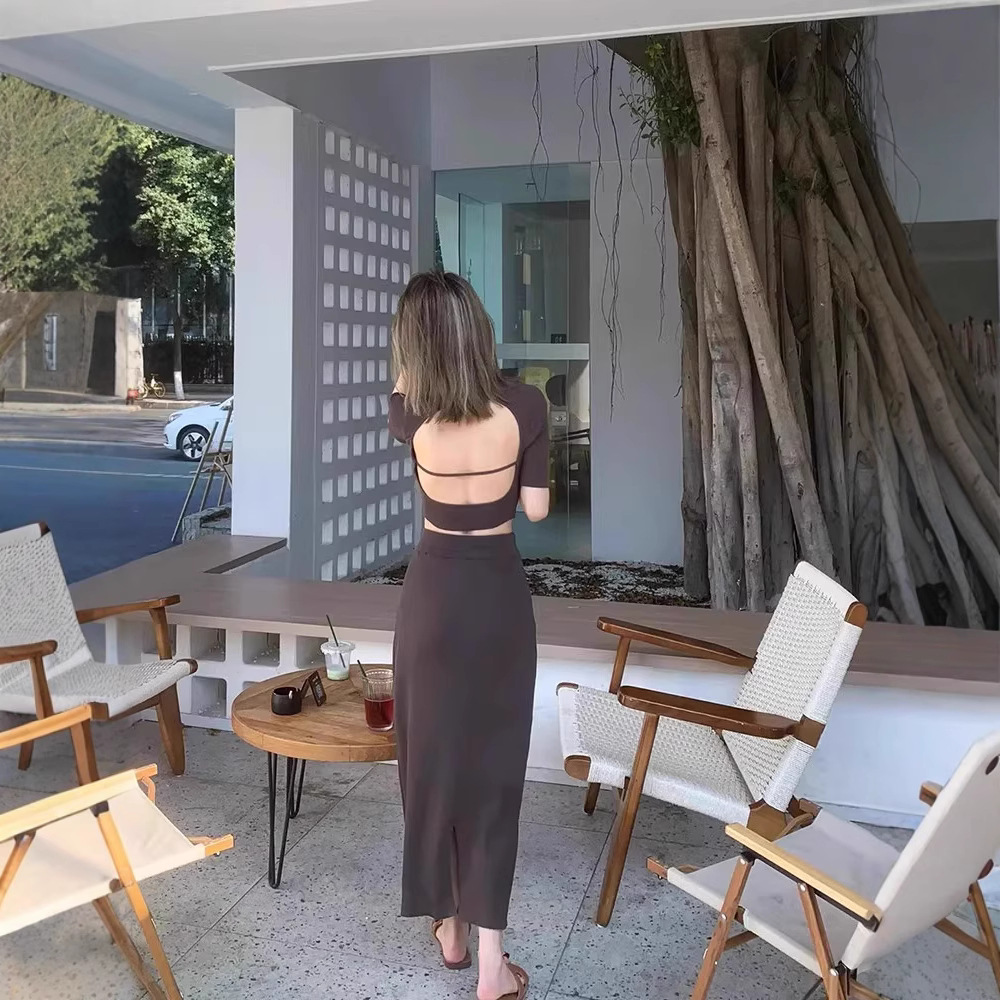 프랑스 빈티지 할로우 아웃 슬림 핏 백리스 니트 반팔 티셔츠 여성용 여름 하이 웨이스트 슬림 핏 투피스 패셔너블 스커트