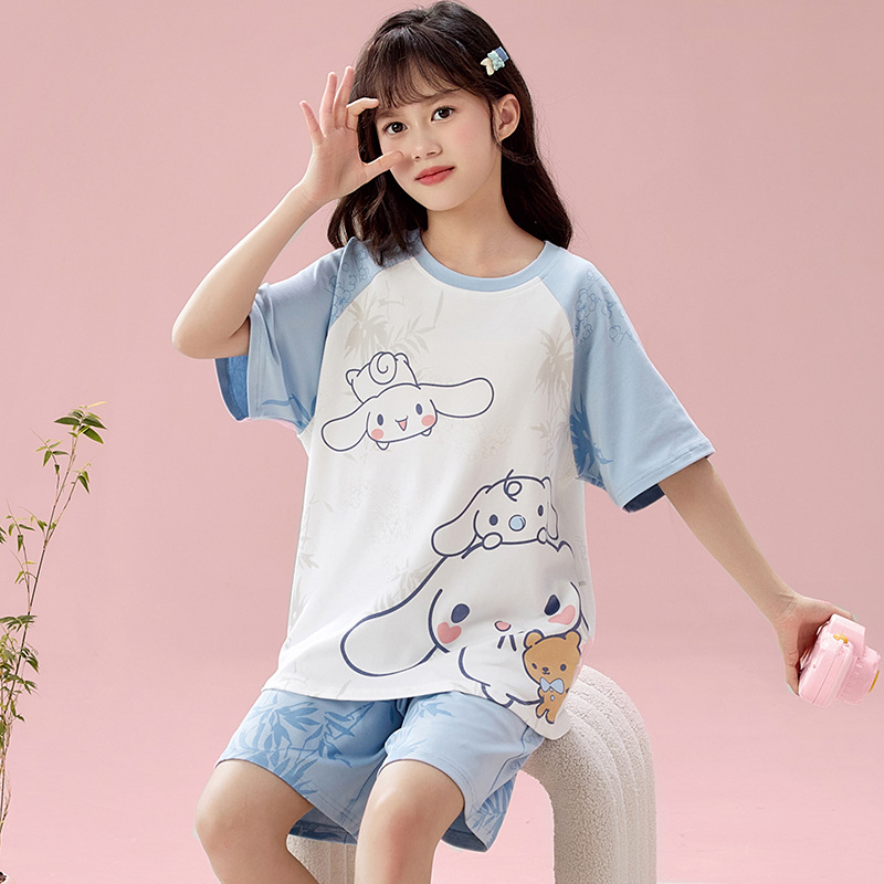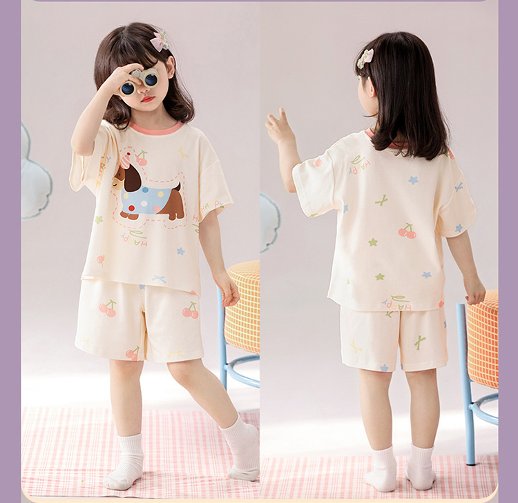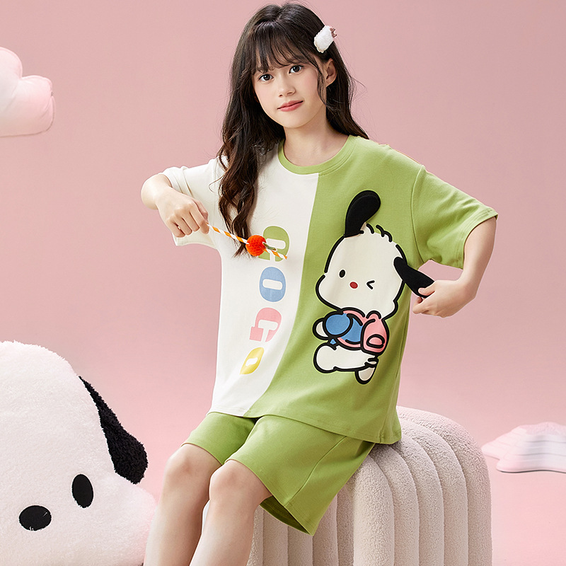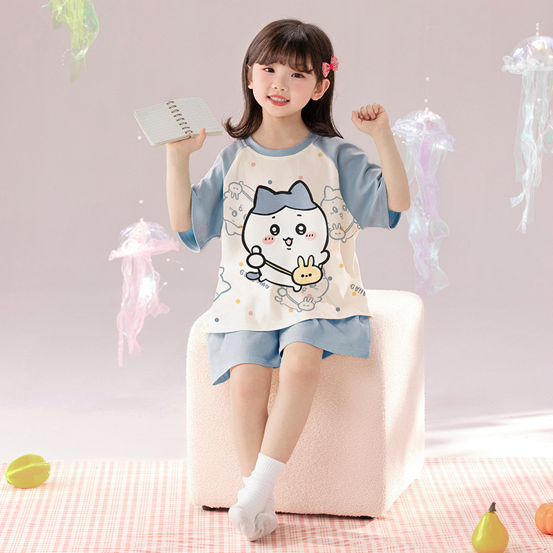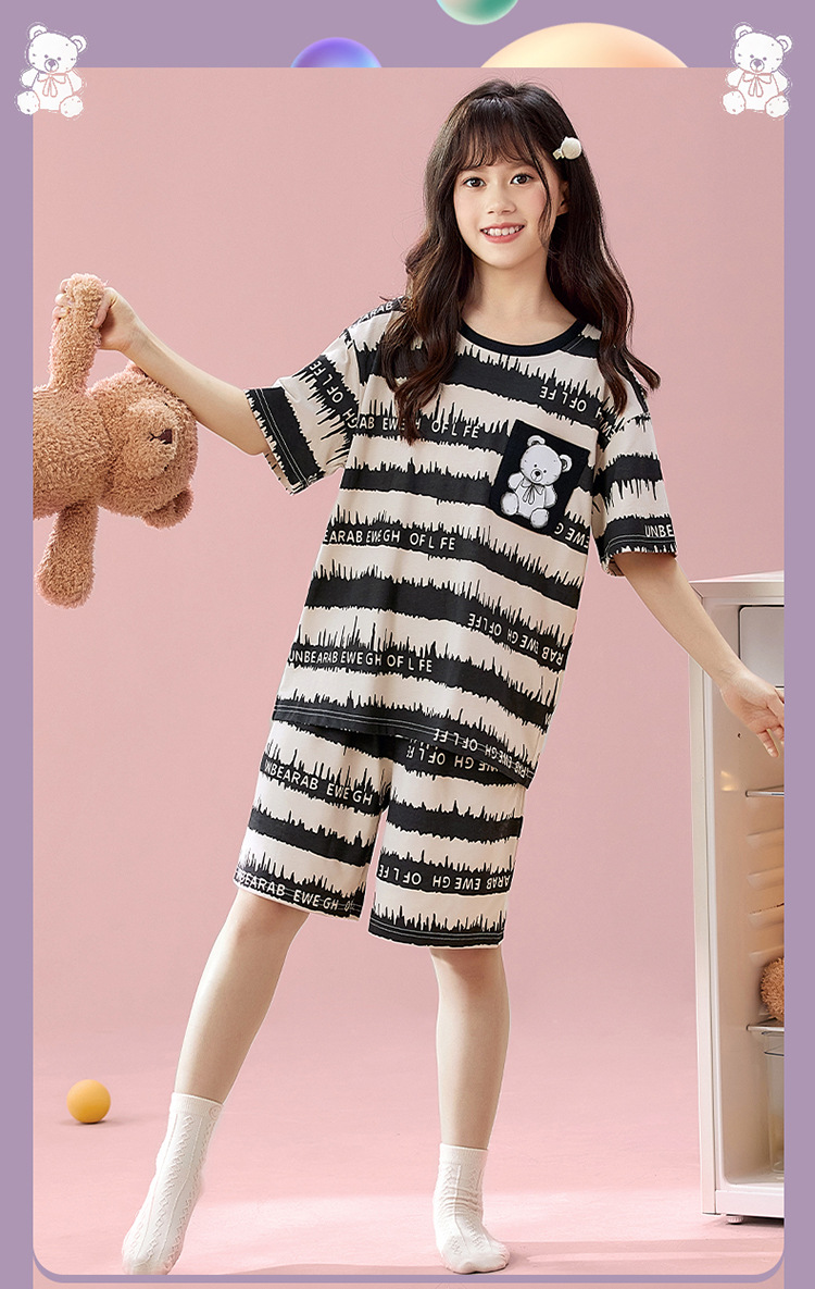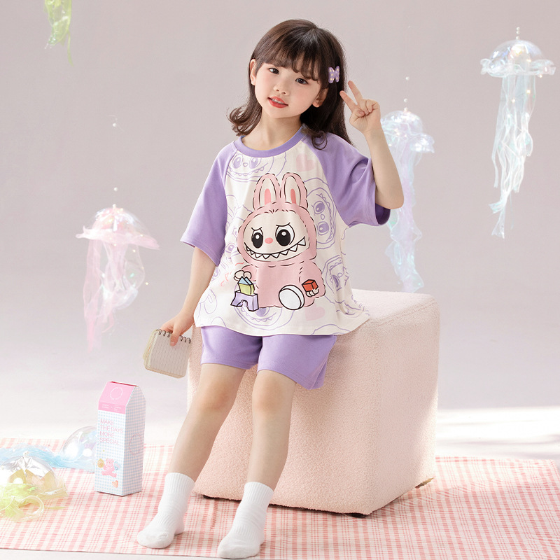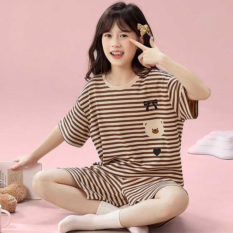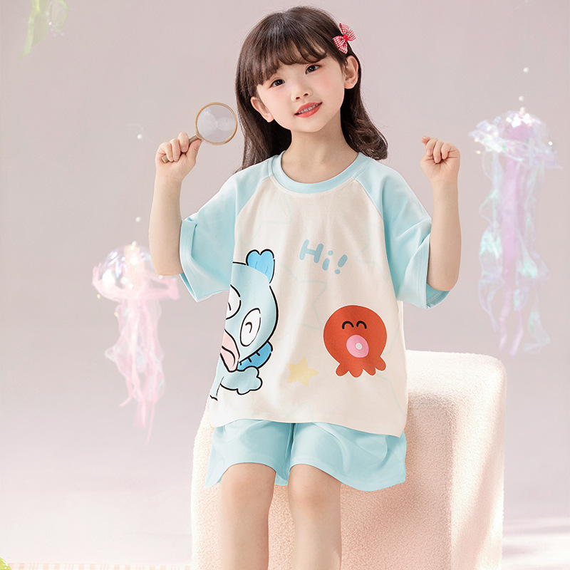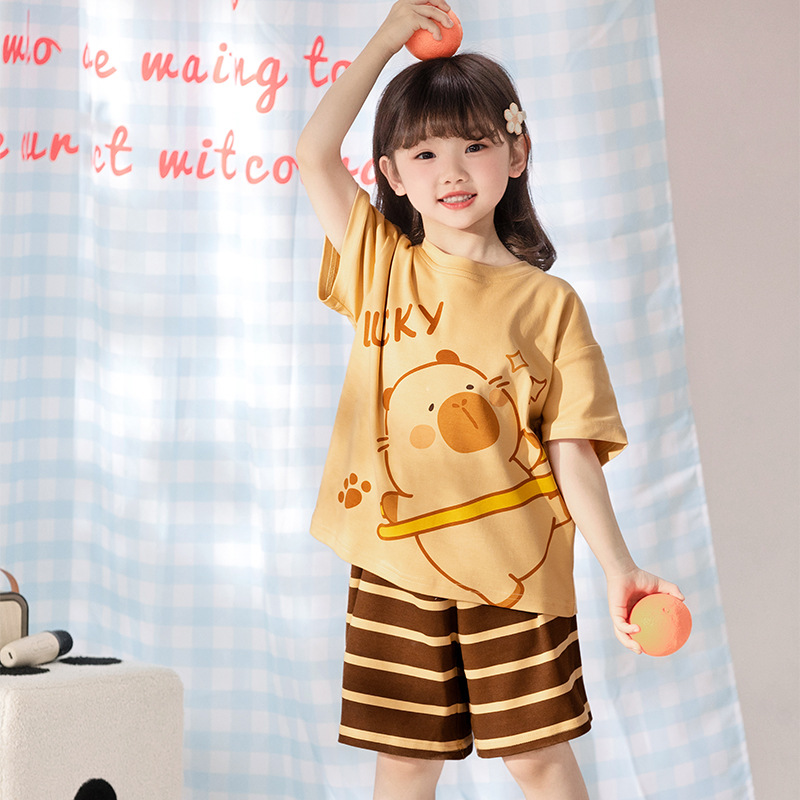 2025 새로운 어린이 잠옷 소녀 반팔 순수 코튼 여름 얇은 중대형 어린이 만화 비버 아기 가정 옷