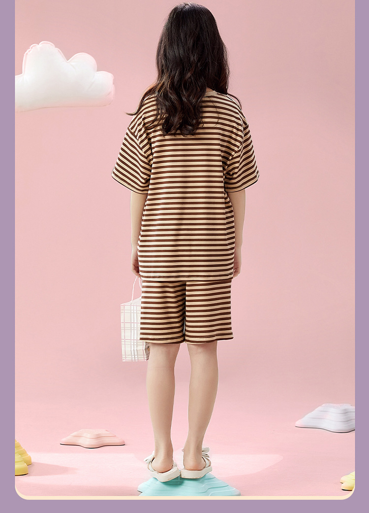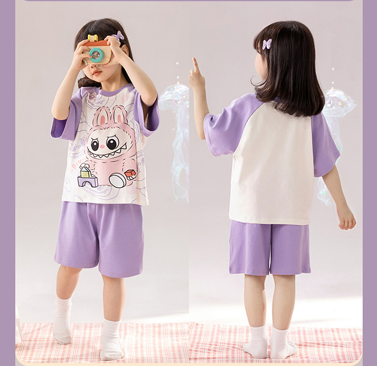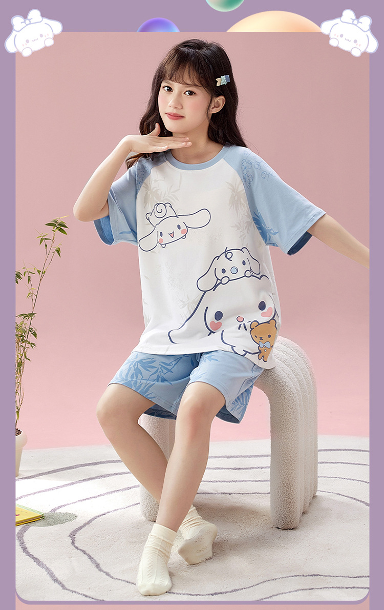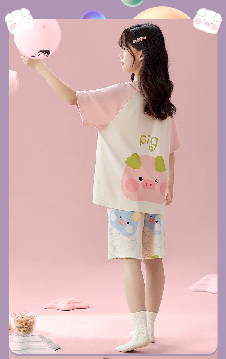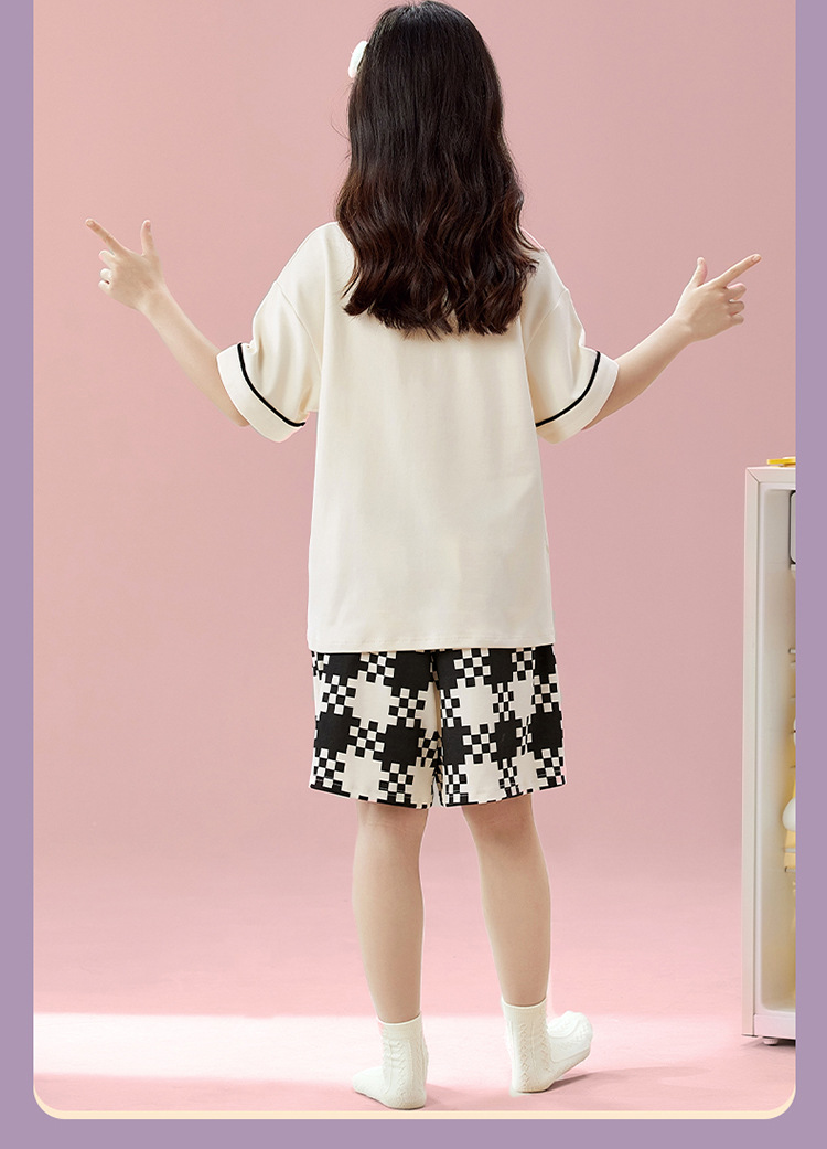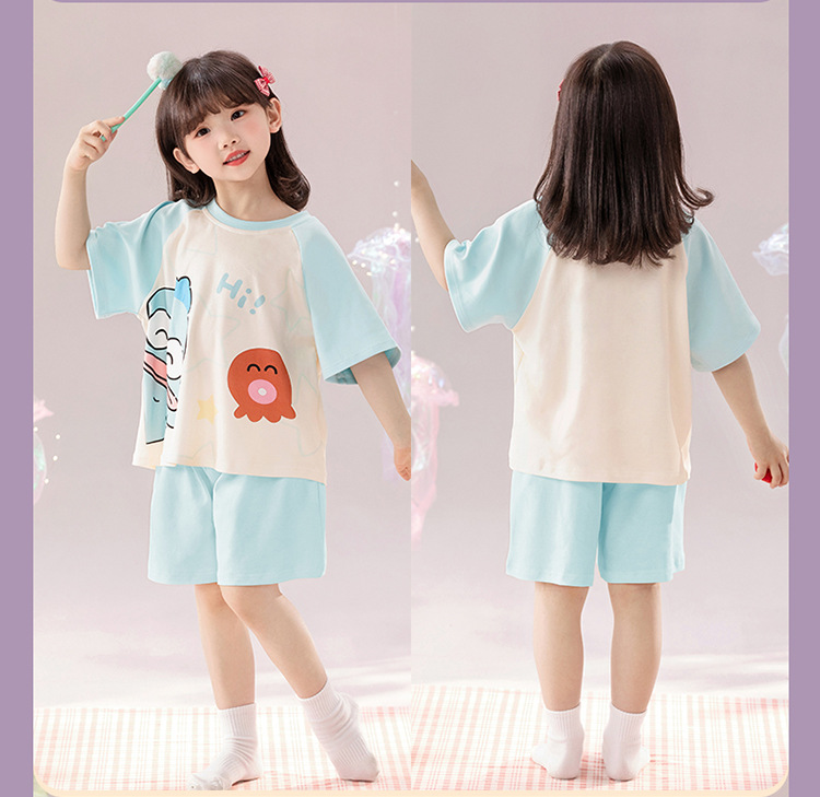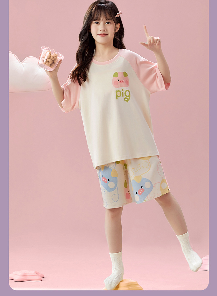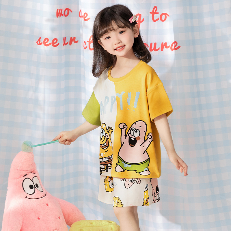 2025 새로운 어린이 잠옷 소녀 반팔 순수 코튼 여름 얇은 중대형 어린이 만화 비버 아기 가정 옷
