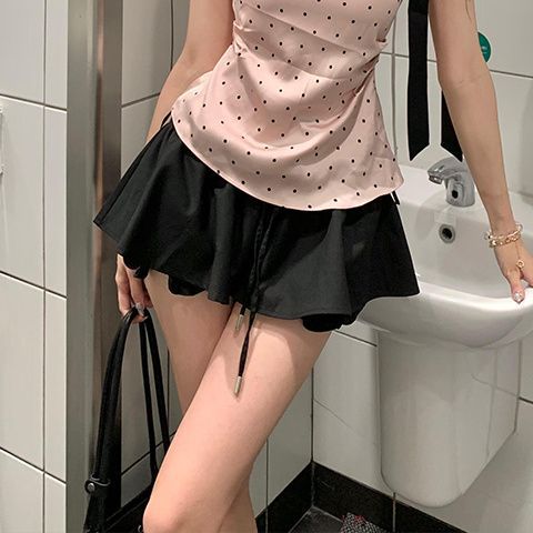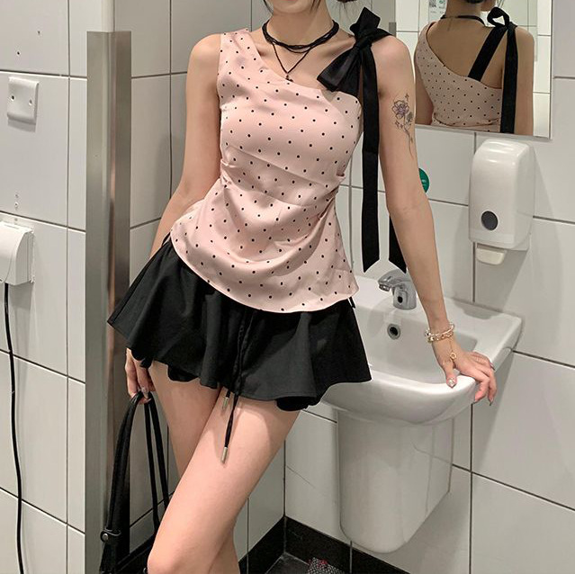 순수한 욕망 윈드 웨이브 포인트 스트랩 경사 어깨 핑크 카미 솔 여성의 여름 새로운 하이 웨이스트 블랙 A 라인 스커트 세트스토어 가기