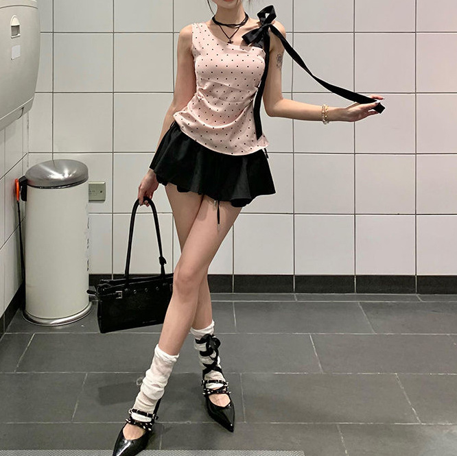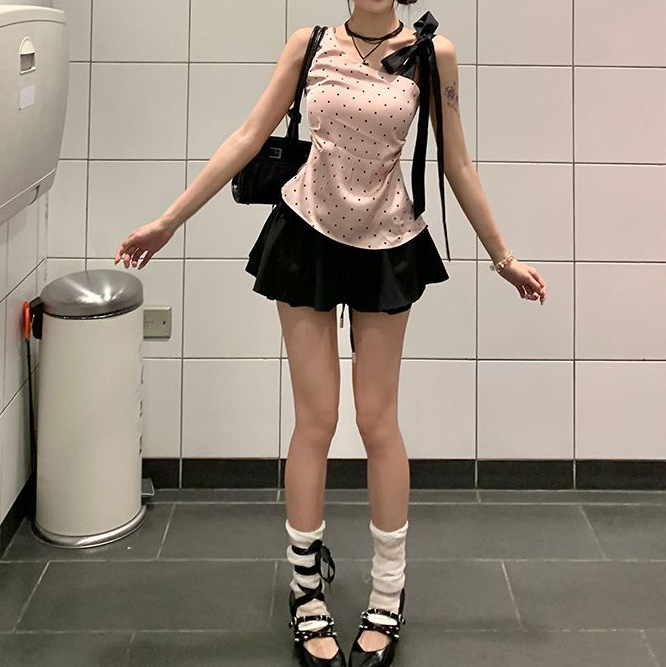 순수한 욕망 윈드 웨이브 포인트 스트랩 경사 어깨 핑크 카미 솔 여성의 여름 새로운 하이 웨이스트 블랙 A 라인 스커트 세트