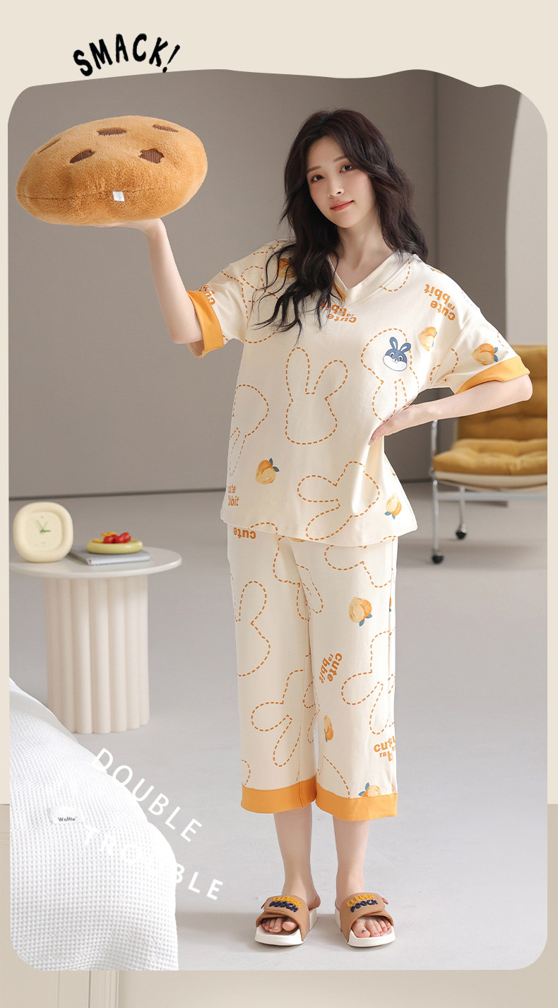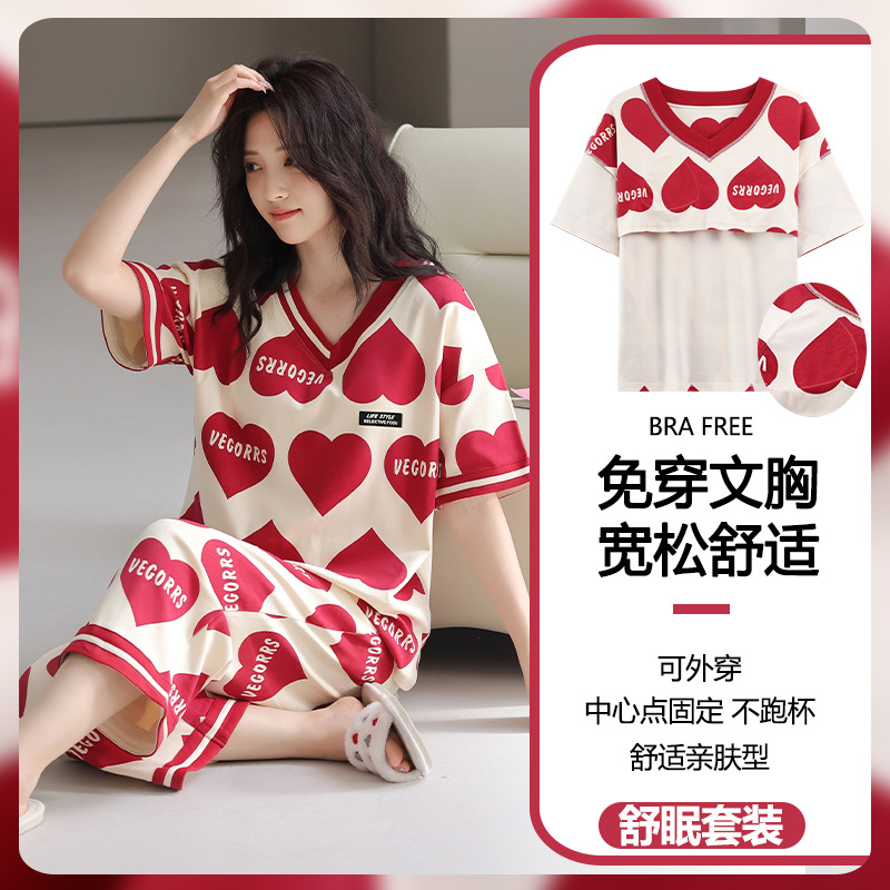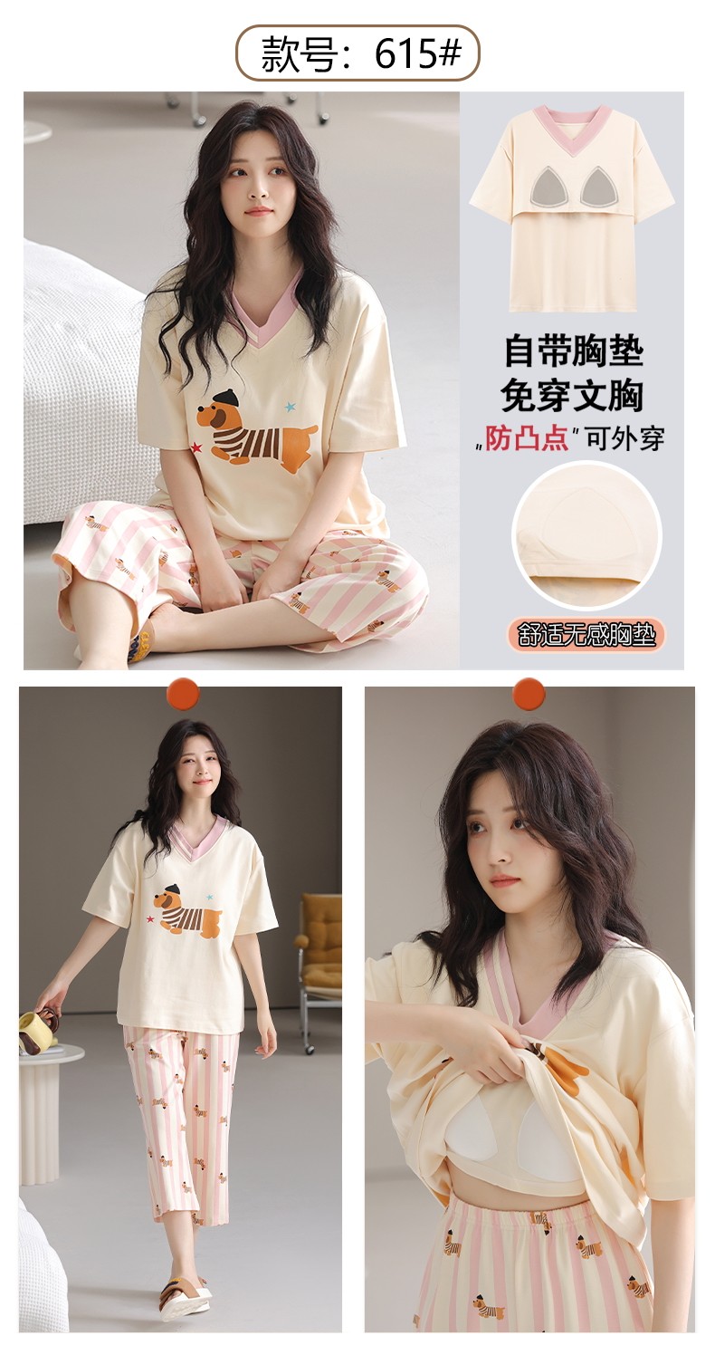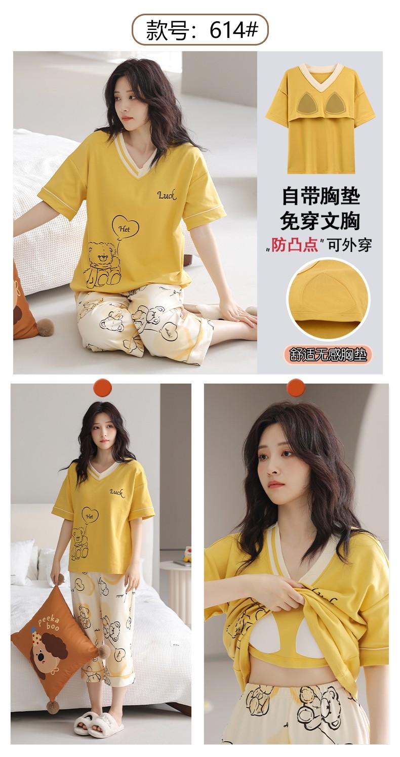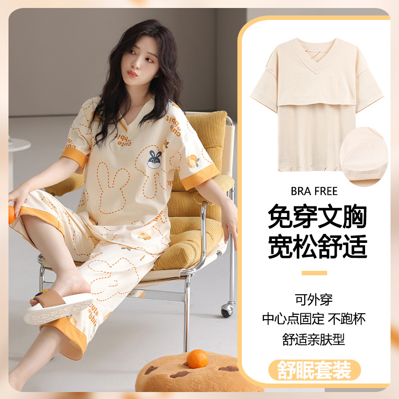 잠옷 여성의 여름 새로운 반팔 카프리 바지 가슴 패드 귀여운 만화 학생 느슨한 플러스 사이즈 홈 의류 세트스토어 가기