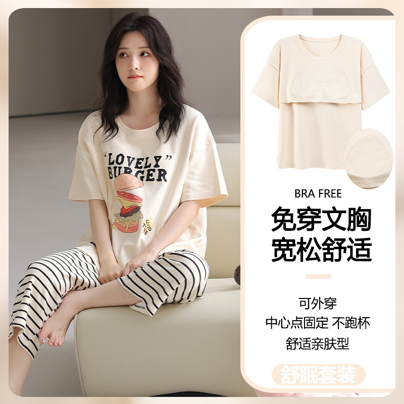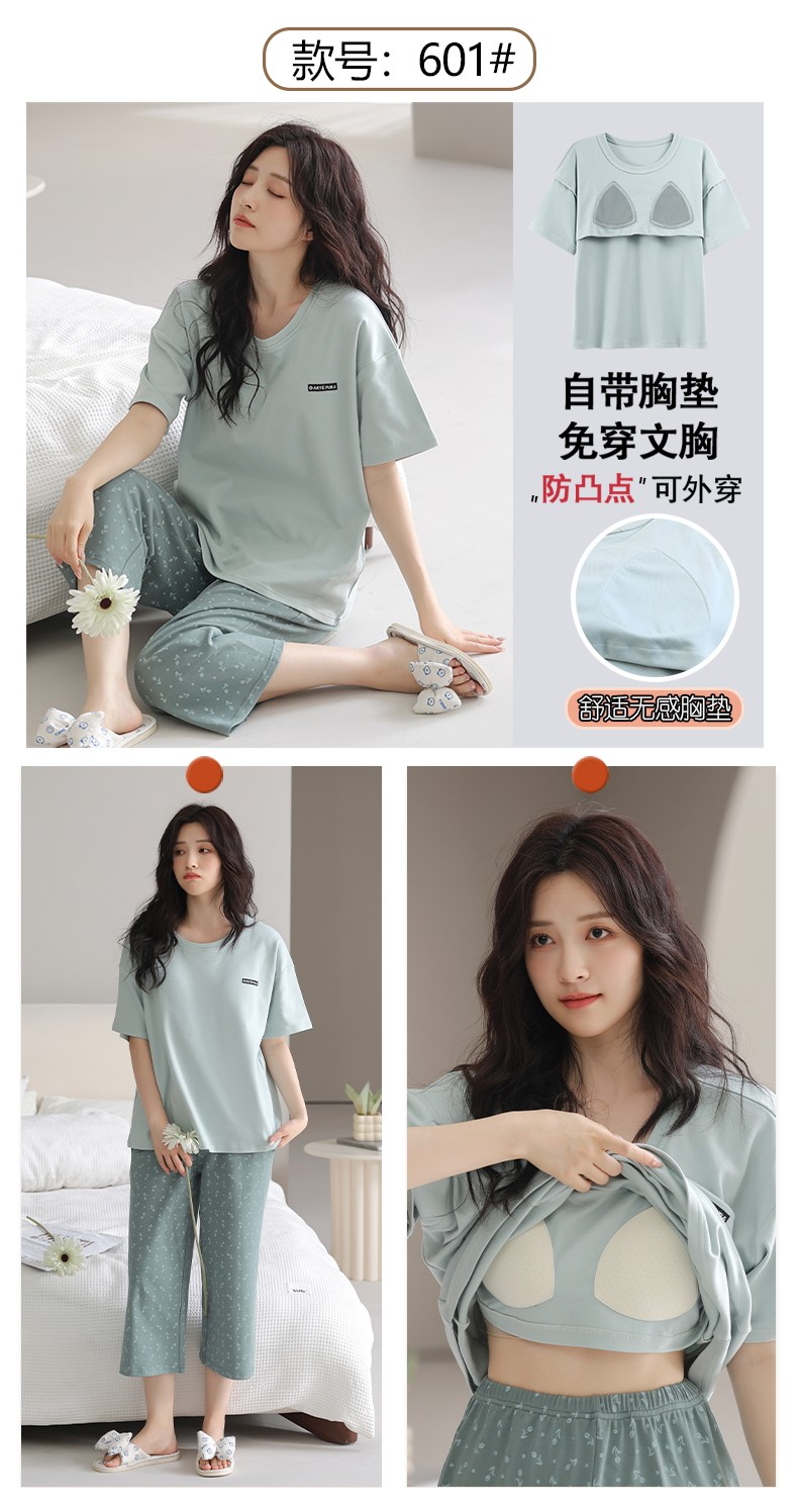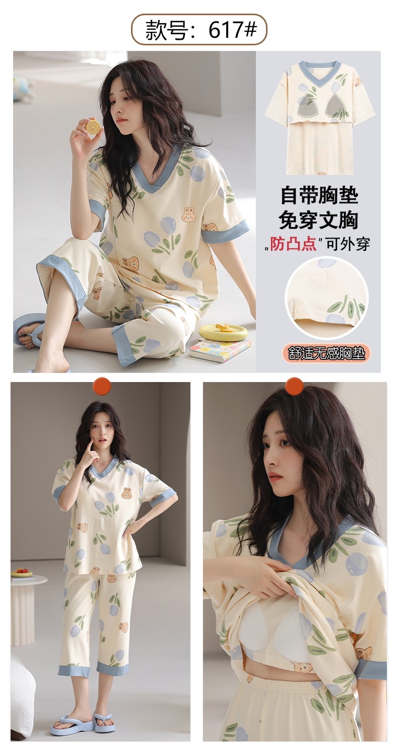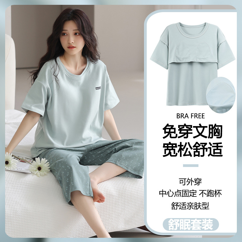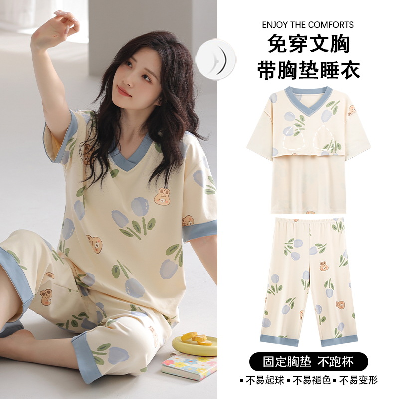 잠옷 여성의 여름 새로운 반팔 카프리 바지 가슴 패드 귀여운 만화 학생 느슨한 플러스 사이즈 홈 의류 세트