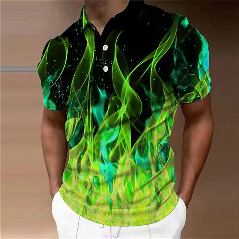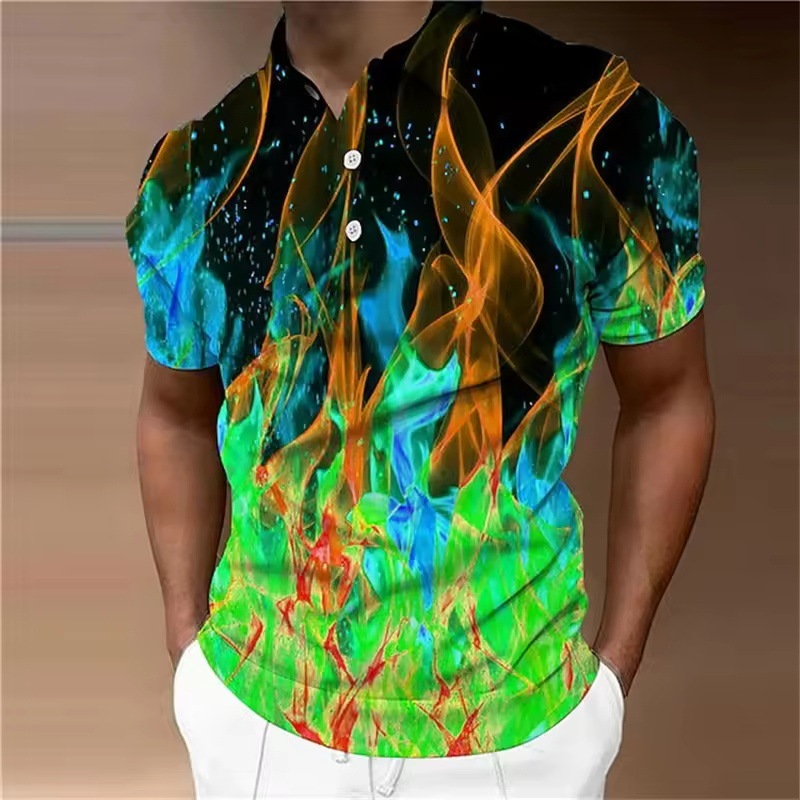 2025 패션 남자 폴로 셔츠 골프 셔츠 3D 인쇄 다채로운 불꽃 패턴 남자 짧은 소매 탑