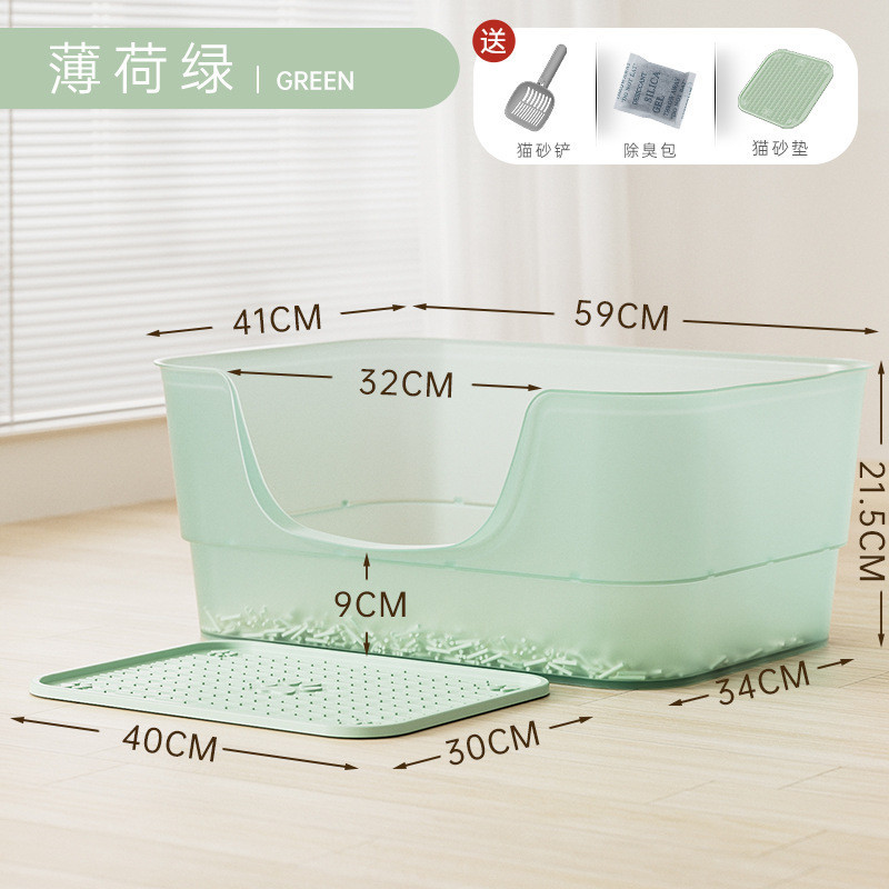 • 대형 민트 그린 투명 반투명 젤리 고양이 화장실 - 고양이 쓰레기 국자 + 고양이 쓰레기 매트★⚑