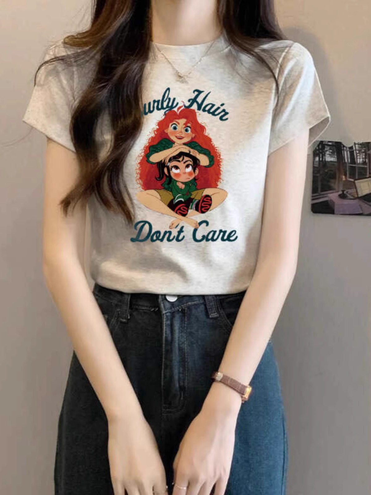 디자인 센스 아메리칸 스위트 스파이스 소녀 슬림 핏 반팔 티셔츠 여성용 여름 Ins 세련된 독특한 만화 인쇄 라운드 넥 탑스토어 가기