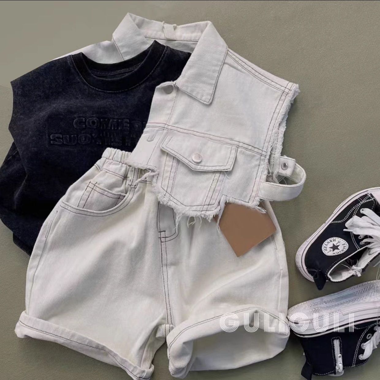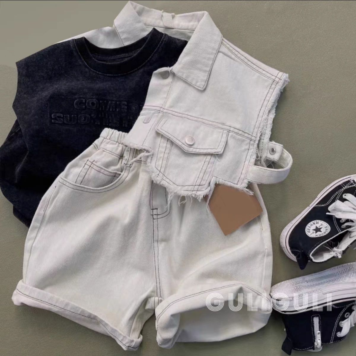 남아 여름 데님 슈트, 핸섬 스트리트 패션, 루즈한 아동 데님 셔츠, 얇은 반바지, 코튼 3피스 세트스토어 가기