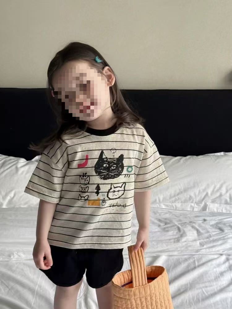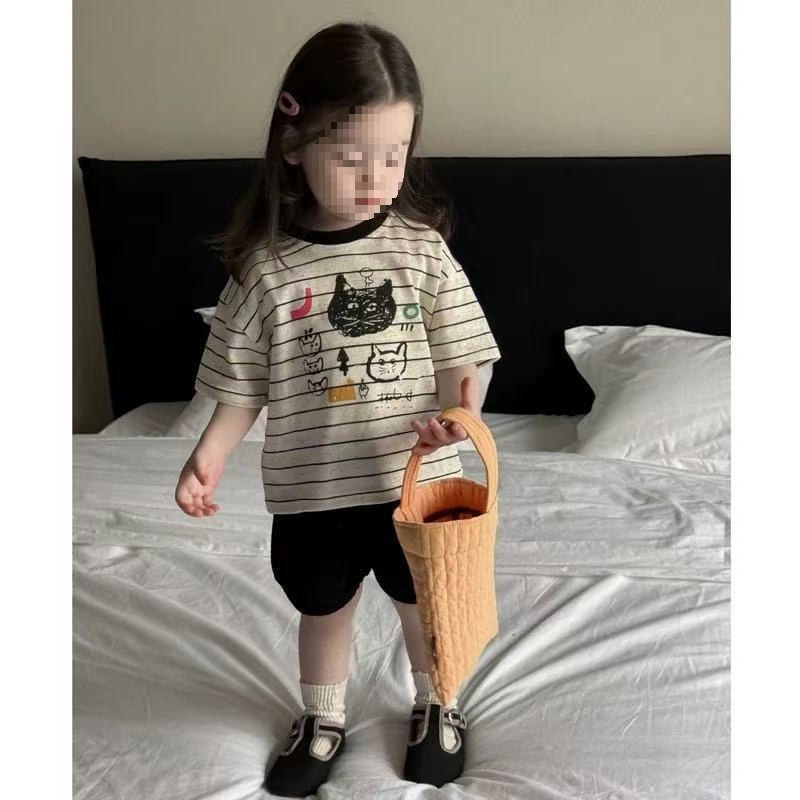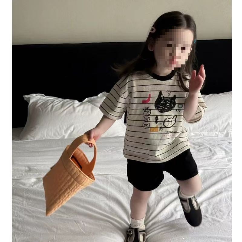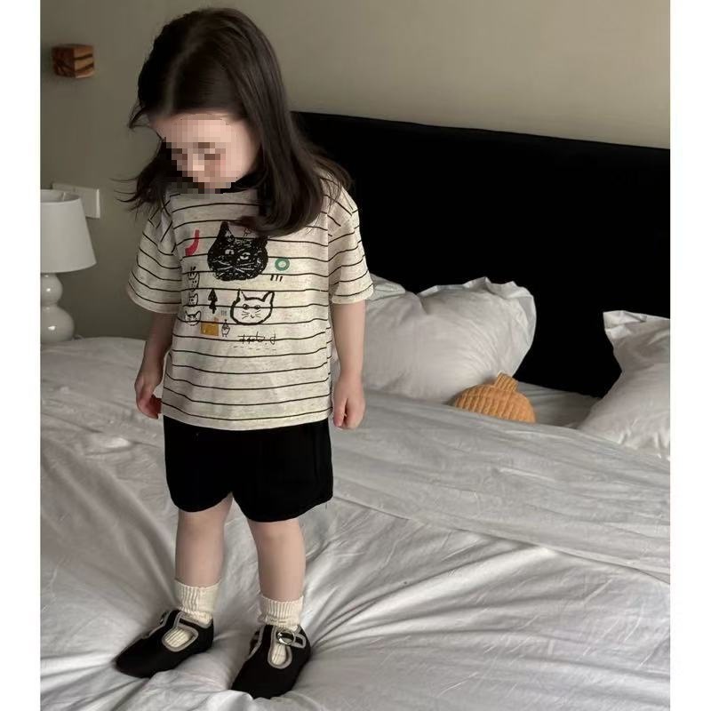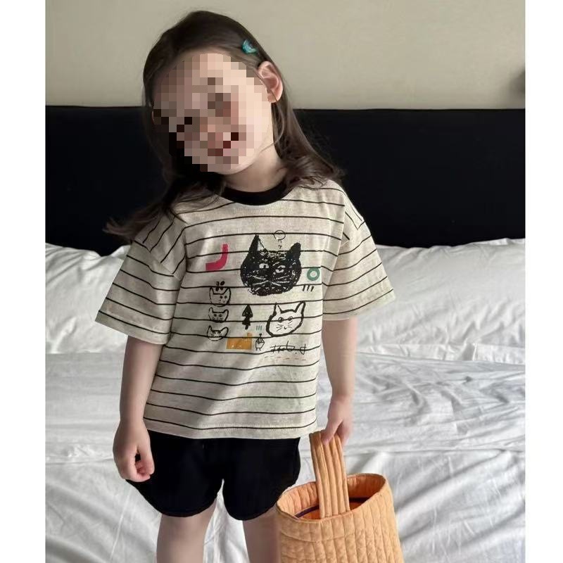 어린 소녀 여름 한국 스타일 귀여운 복고풍 반팔 어린이 아기 소녀 만화 인쇄 새끼 고양이 캐주얼 티셔츠 Z021스토어 가기