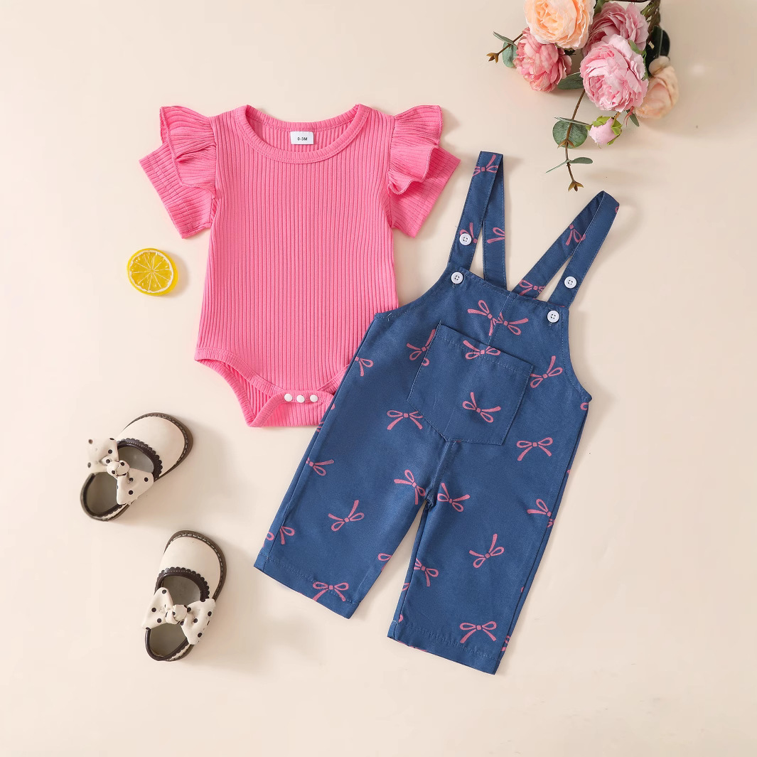 유아 여아 봄 여름 솔리드 컬러 반팔 탑 + 모조 데님 점프 슈트 바느질 프린트 슈트
