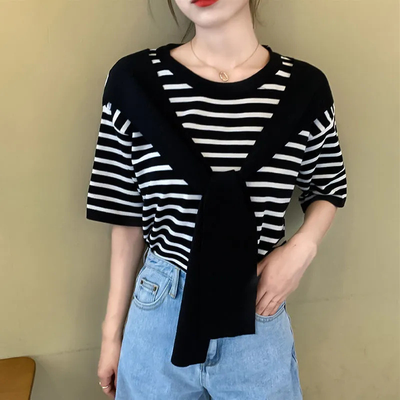 인터넷 인기 패션 반팔 니트웨어 여성 봄과 여름 2023 새로운 서양식 목도리 가짜 투피스 티셔츠 스트라이프 탑스토어 가기