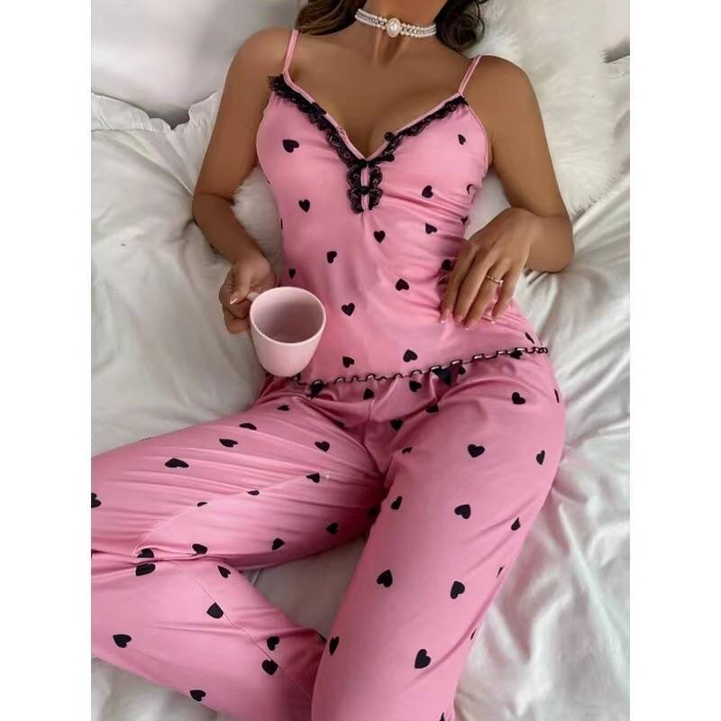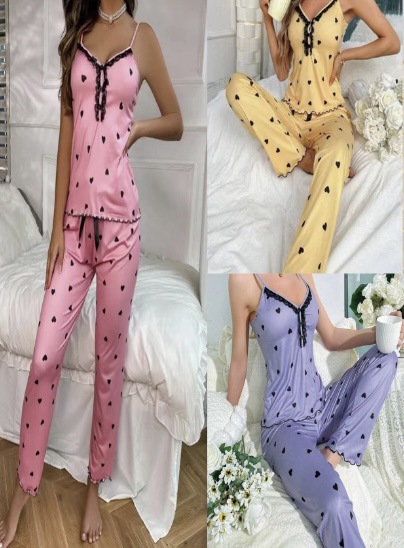 새로운 유럽과 미국의 대외 무역 여성의 새로운 V 넥 잠옷, 편안한 홈 버튼 서스펜더 바지, 홈웨어 투피스 세트