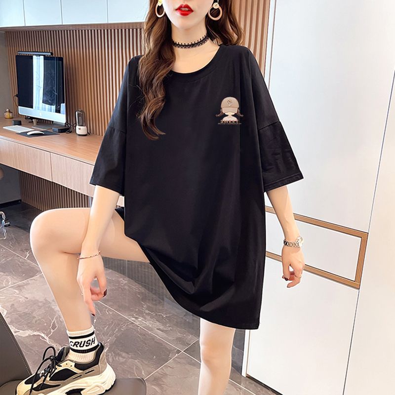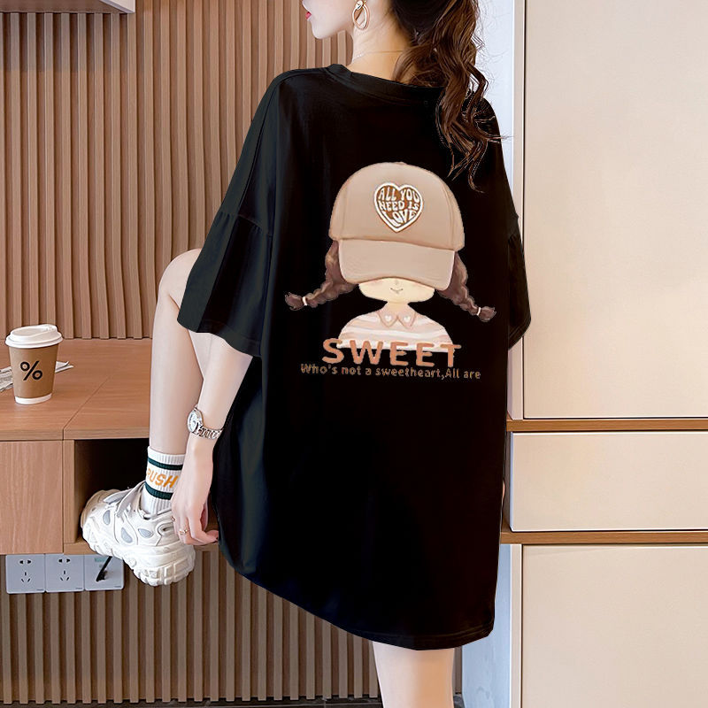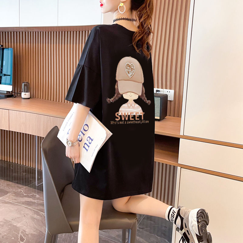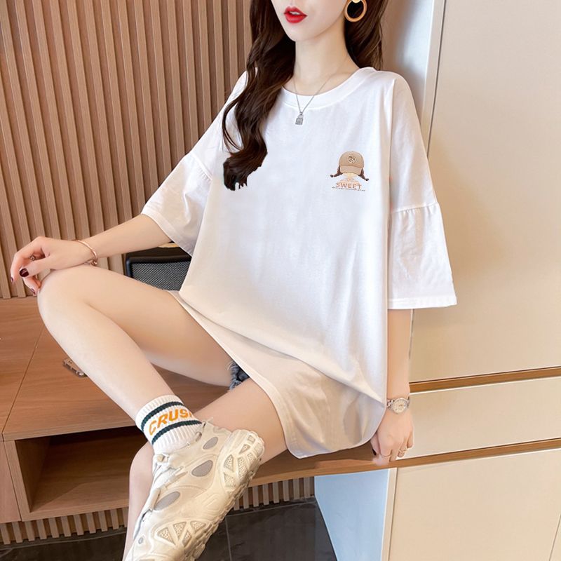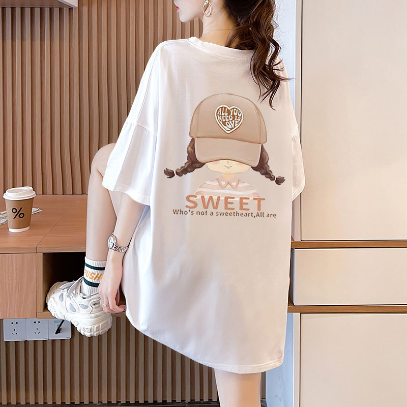 100% 코튼 대형 반팔 티셔츠 여성용 새 여름 캐주얼 루즈 화이트 티셔츠 반팔 중간 길이 탑스토어 가기