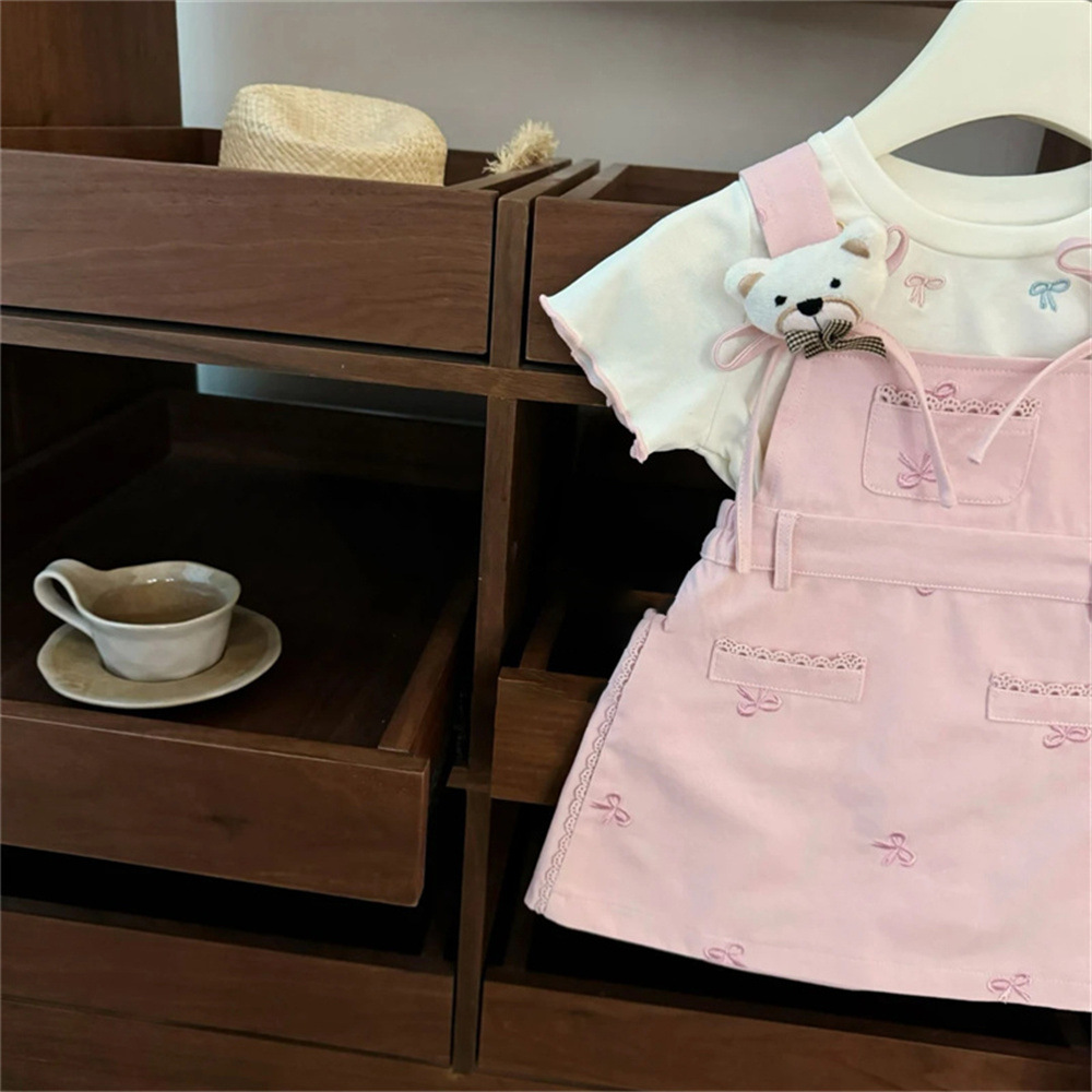 [레몬] 벚꽃 가루! 아기 소녀 달콤한 쿨 화이트 핑크 활 스트랩밴드 티셔츠 세트 트렌디스토어 가기
