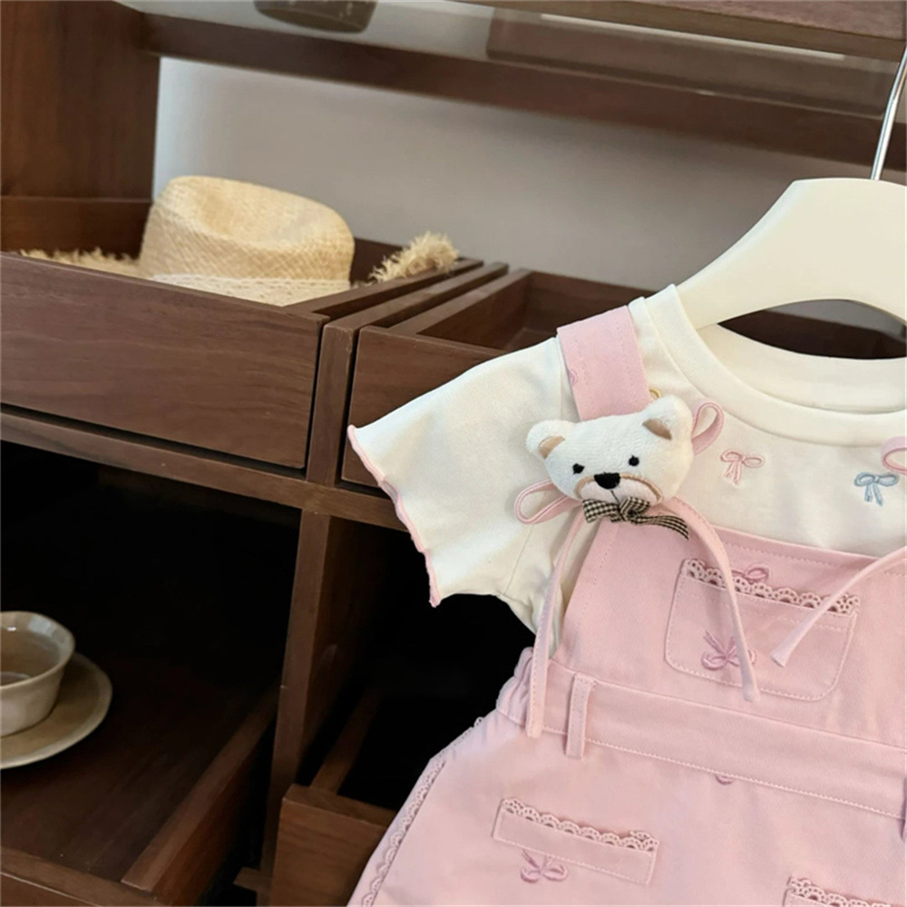 [레몬] 벚꽃 가루! 아기 소녀 달콤한 쿨 화이트 핑크 활 스트랩밴드 티셔츠 세트 트렌디