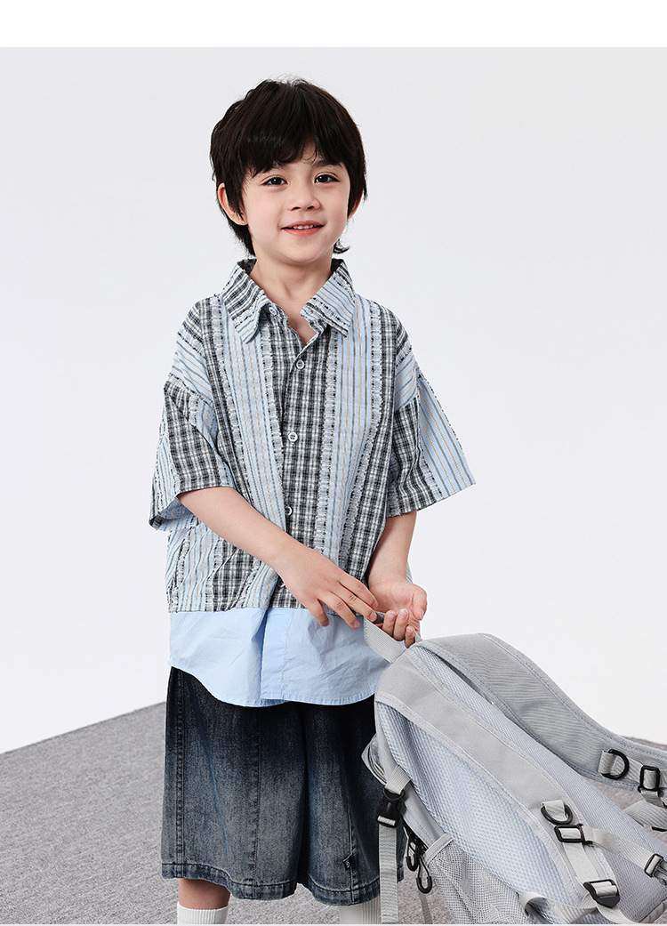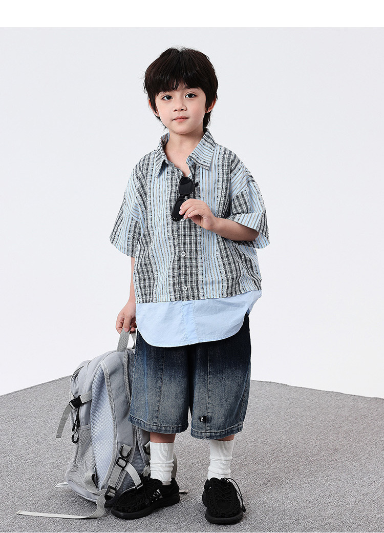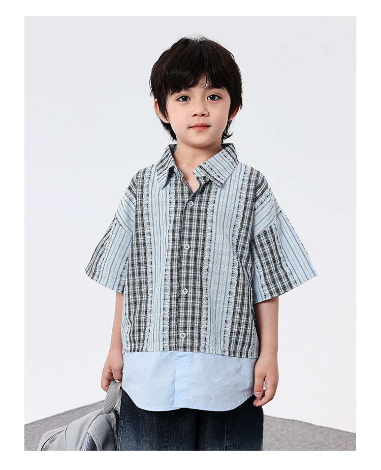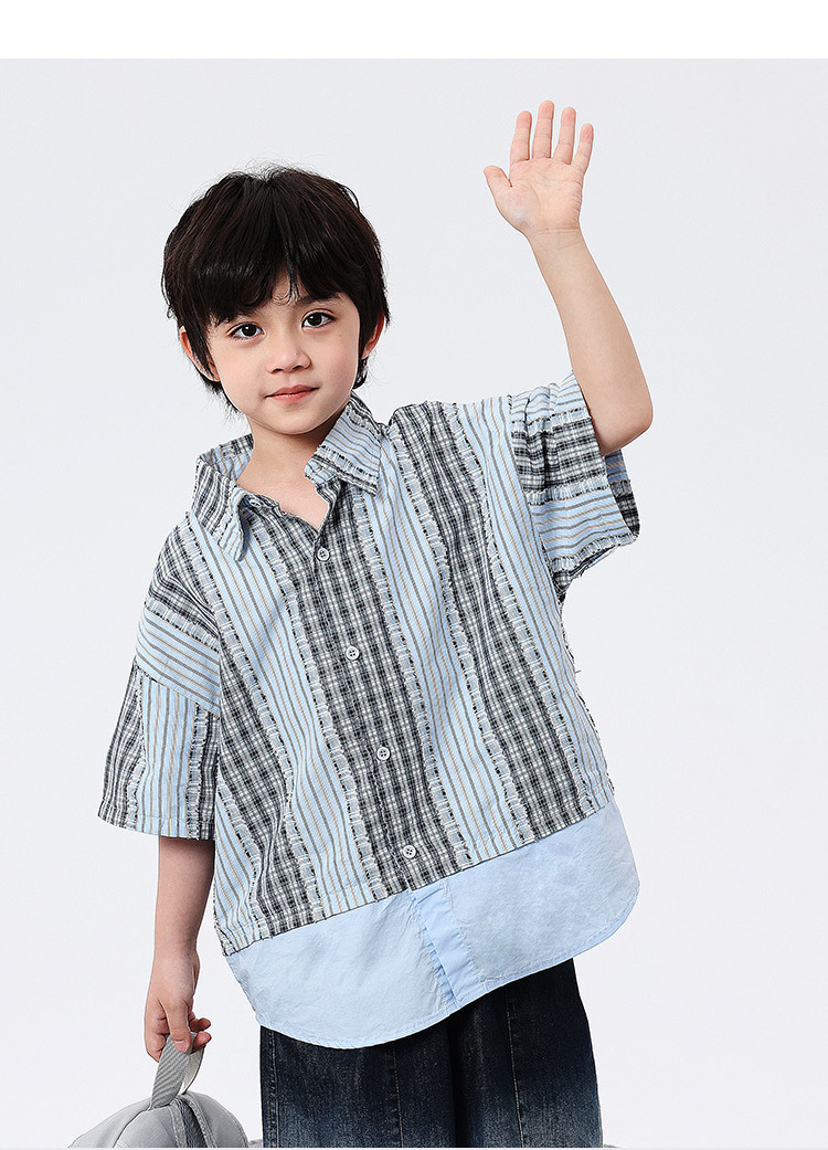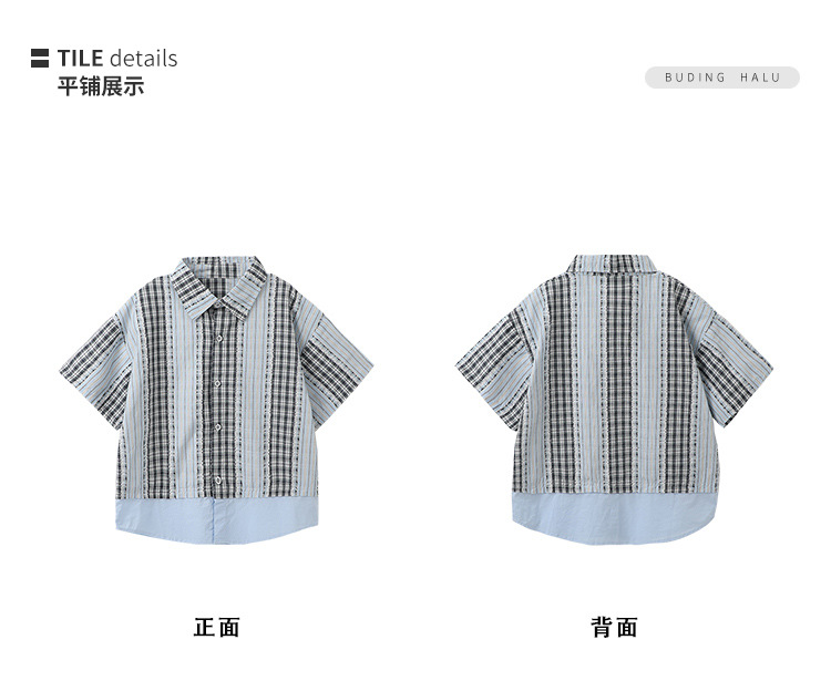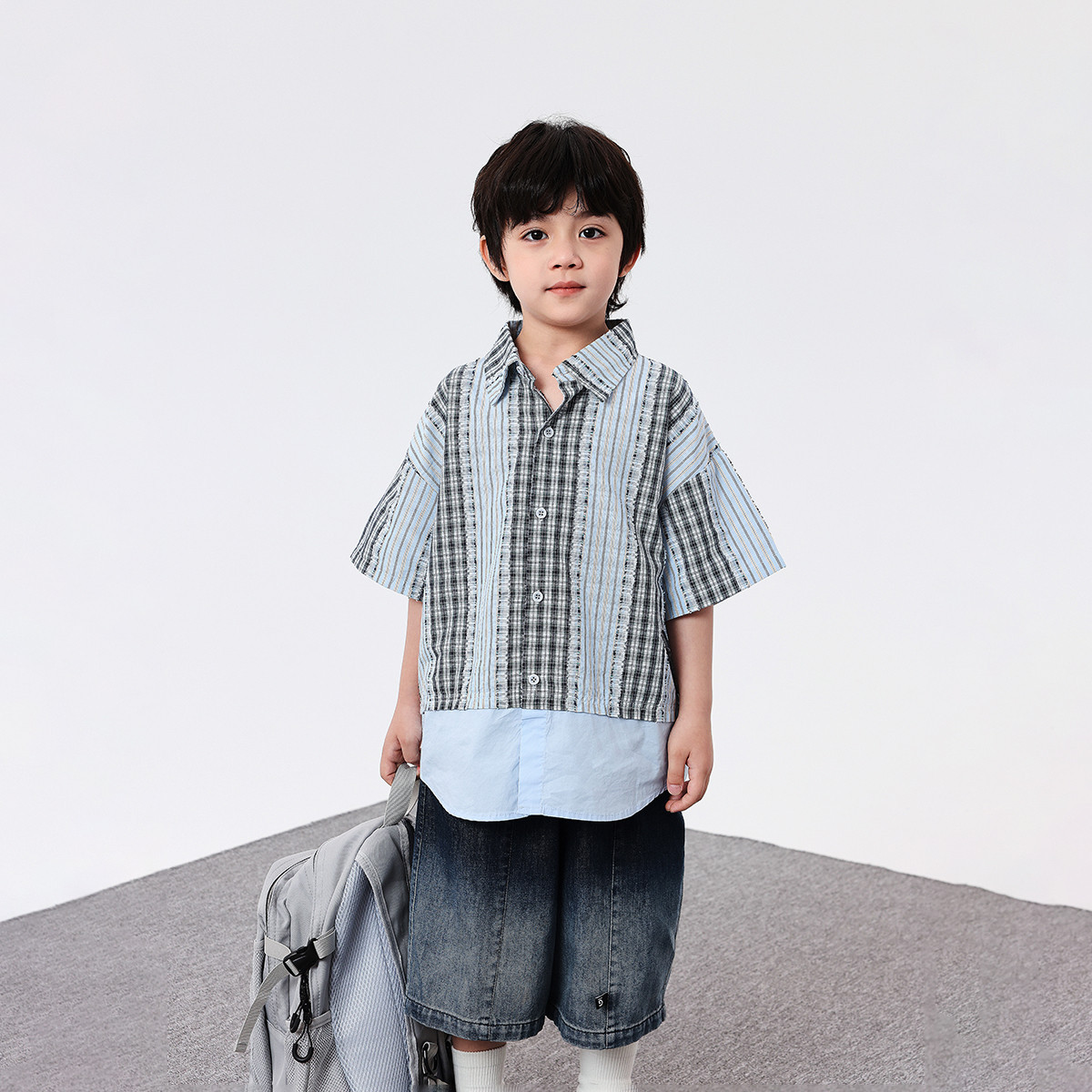Pudding Haru 아동복 소년 디자인 탑 2025 여름 신작 중대형 아동 캐주얼 반팔 셔츠