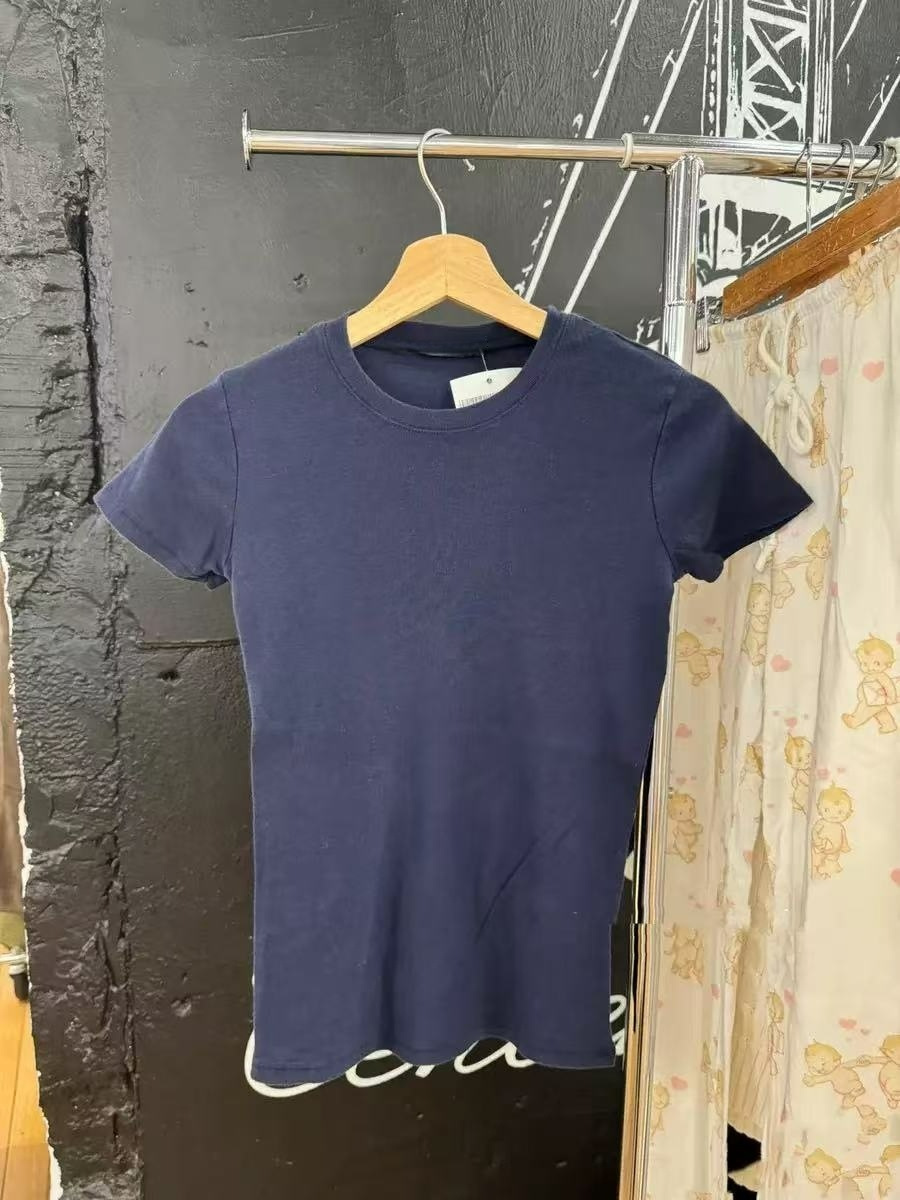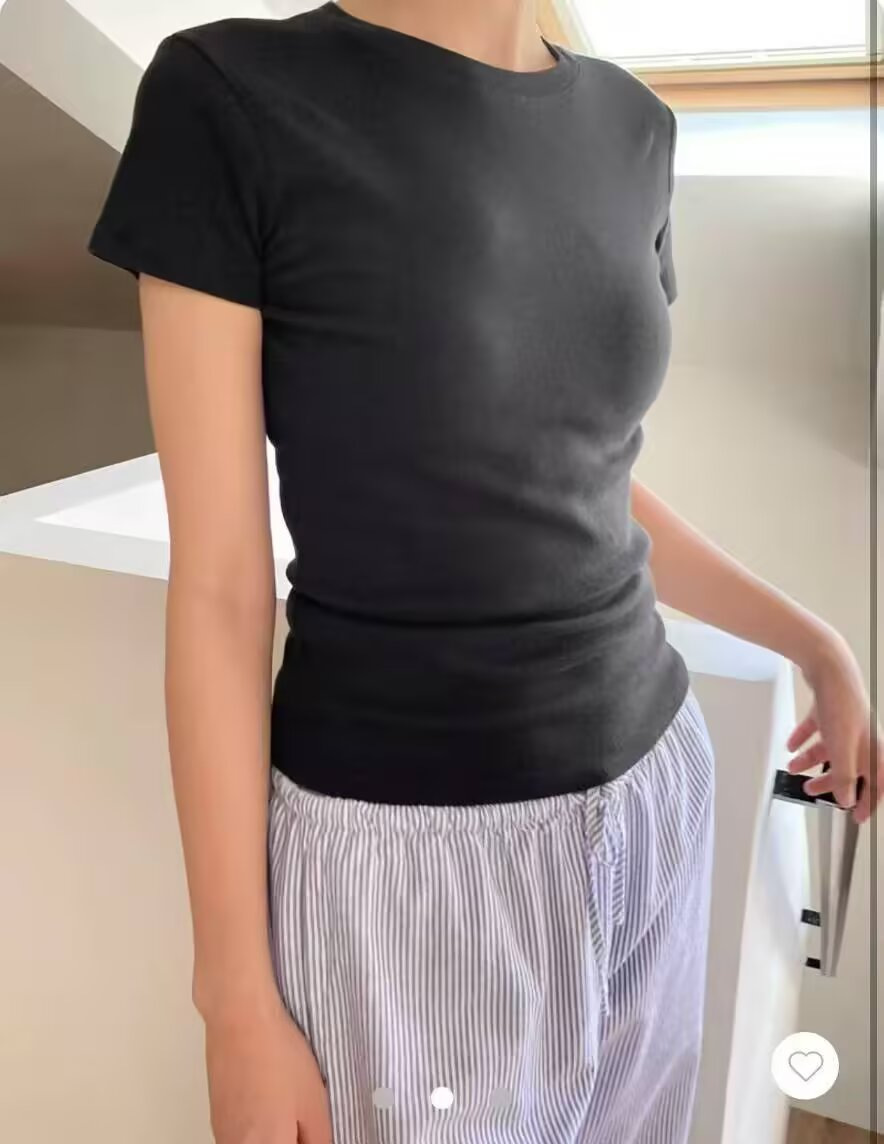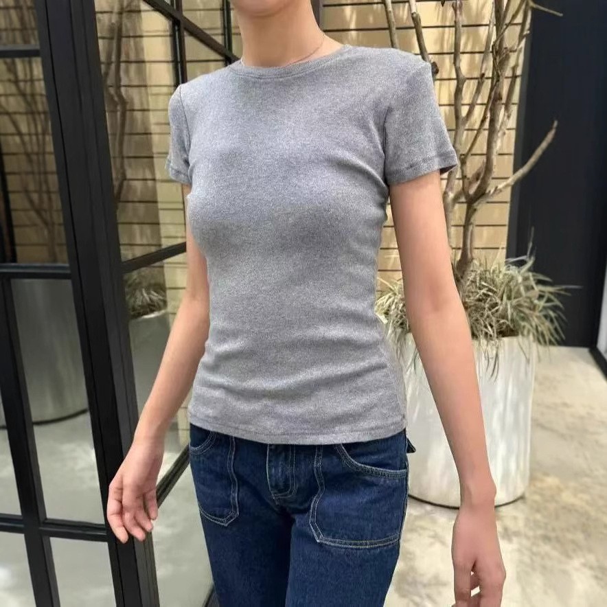 BM 스타일 반팔 핫걸 스타일 기본 솔리드 컬러 라운드 넥 티셔츠 여성용 다용도 슬림핏 이너웨어 짧은 오버숄더 탑 트렌디스토어 가기
