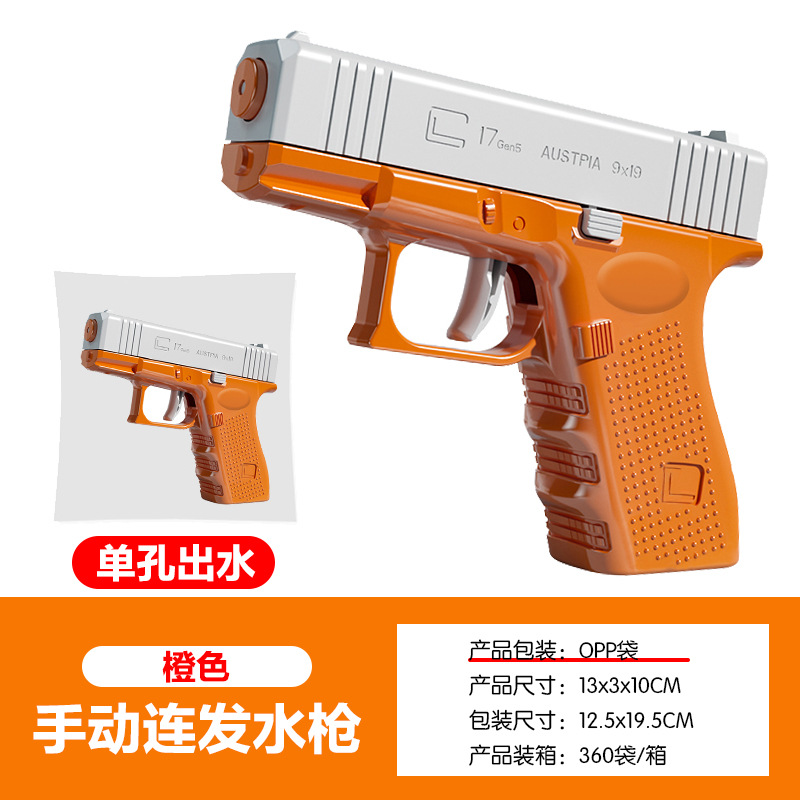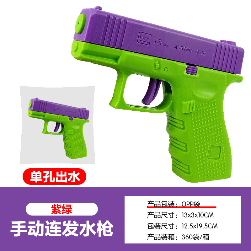 | 格洛克水枪 | 60ML | 紫绿、橙色、红色、绿色 透明灰、透明蓝、透明粉 | OPP袋 | 13x3x10 | 12.5x19.5 | 360 | 74.5*38.5*56 |