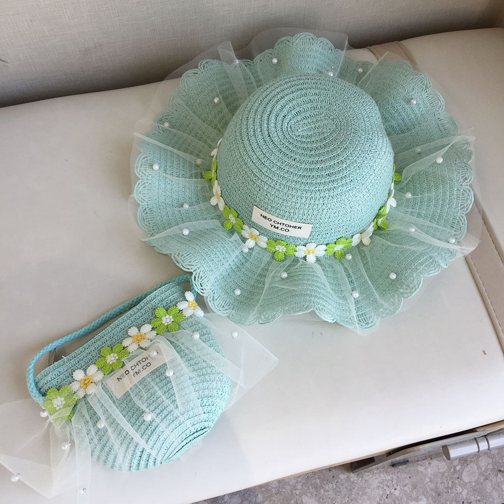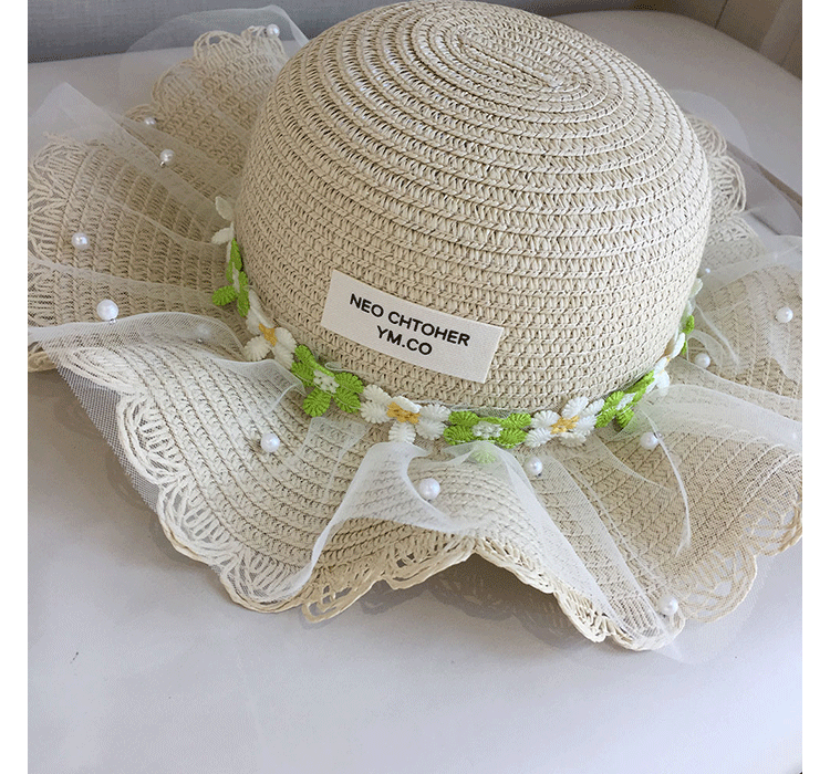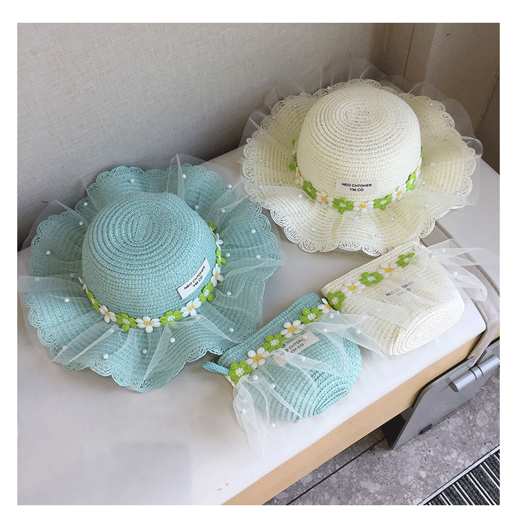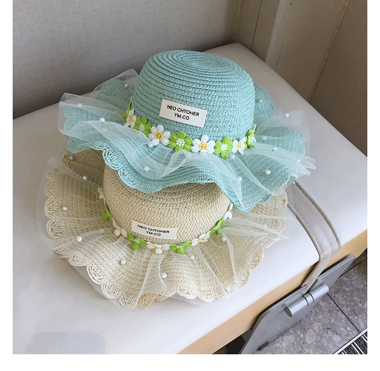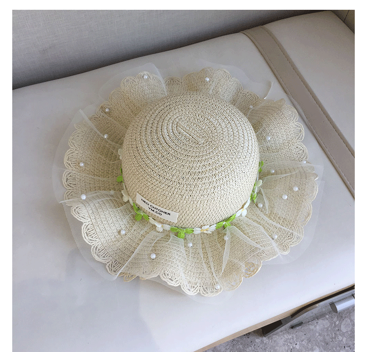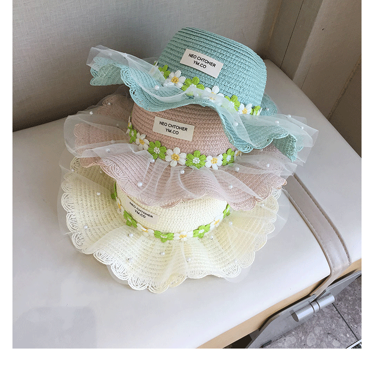 여름 공주 메쉬 시리즈 진주 물결 어린이 밀짚 모자 소녀의 햇빛 모자 비치 활 밀짚 모자