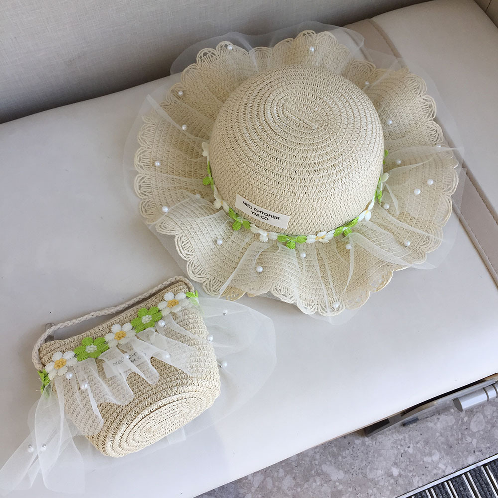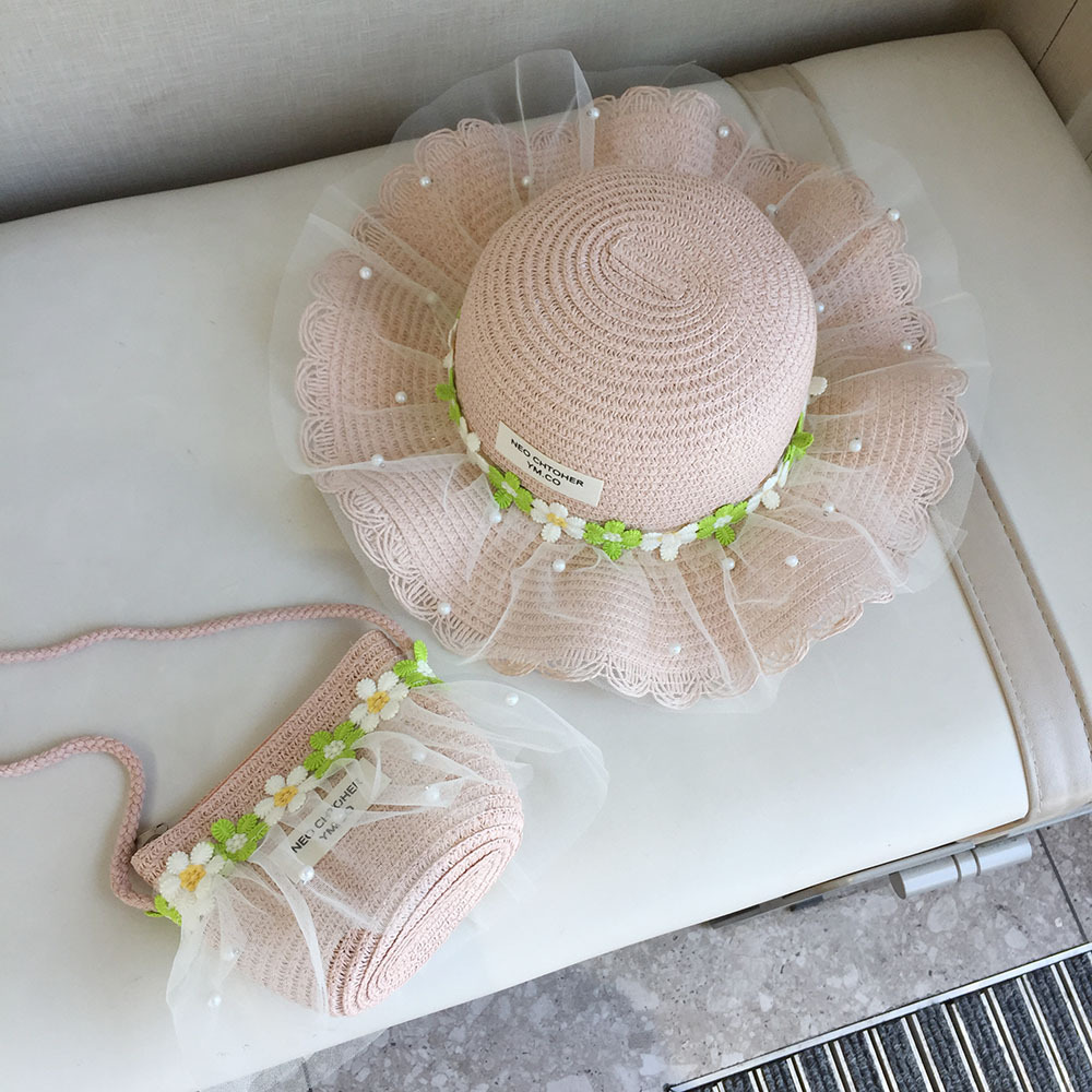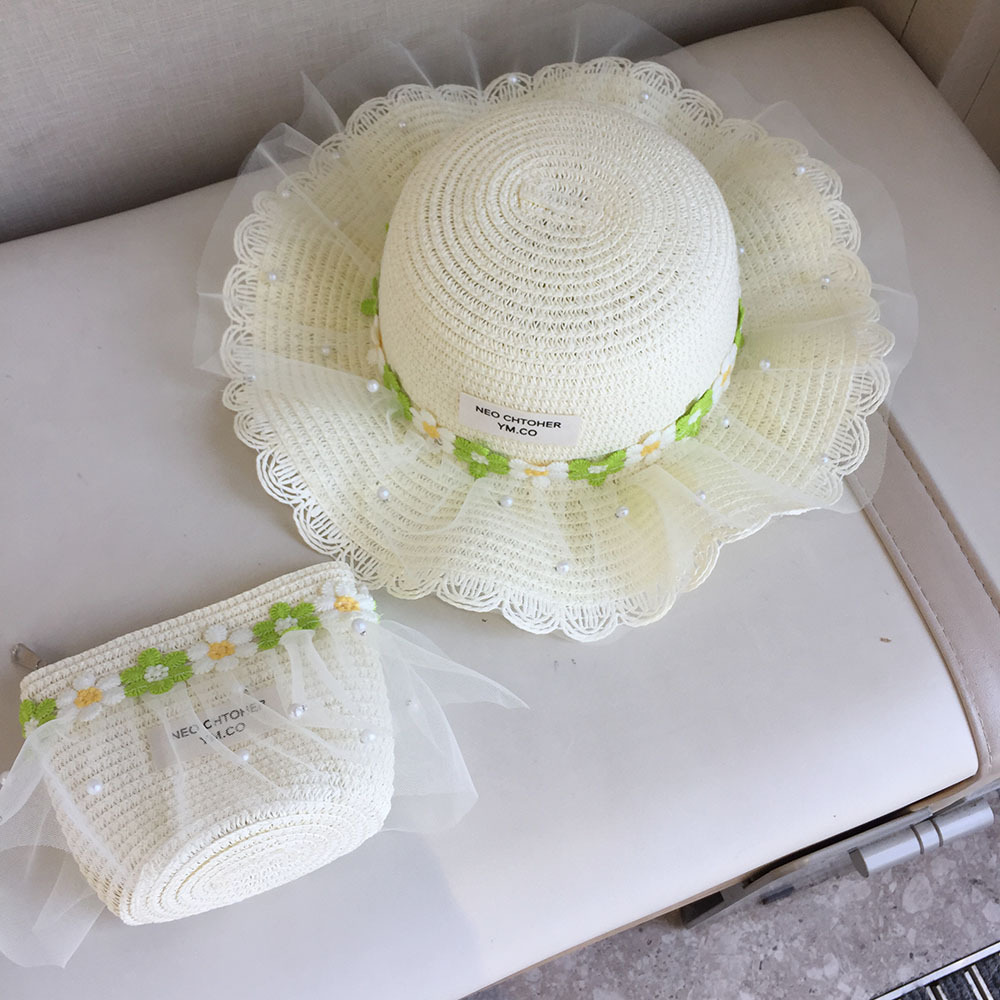 여름 공주 메쉬 시리즈 진주 물결 어린이 밀짚 모자 소녀의 햇빛 모자 비치 활 밀짚 모자
