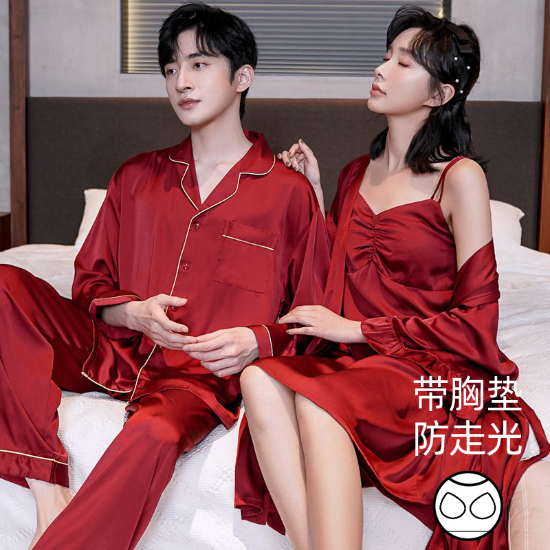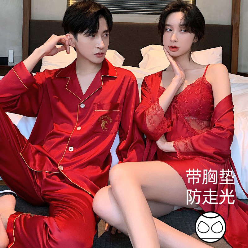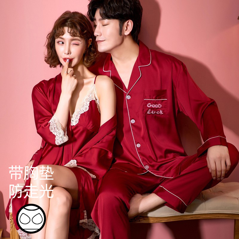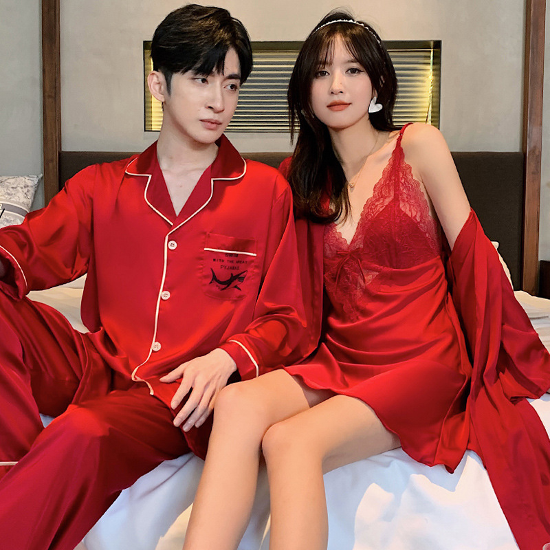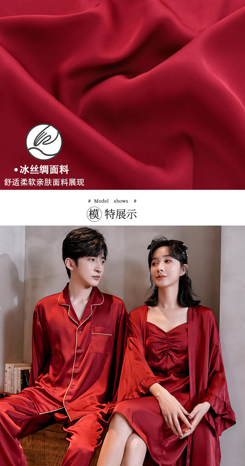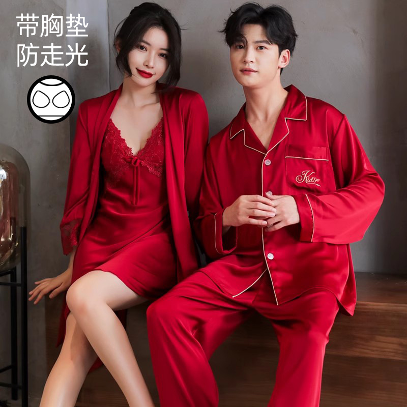 커플 잠옷 여성 결혼식 여름 얼음 실크 섹시한 잠옷 투피스 세트 빨간색 신혼 실크 남성 반팔 가정복스토어 가기