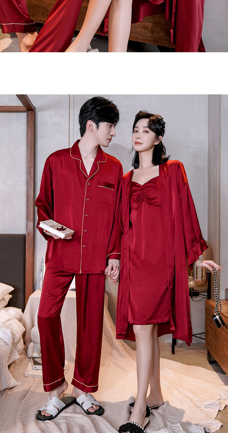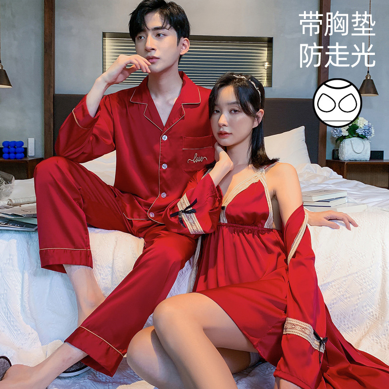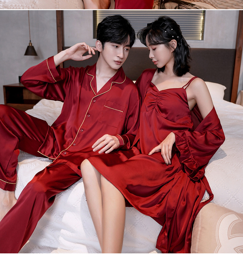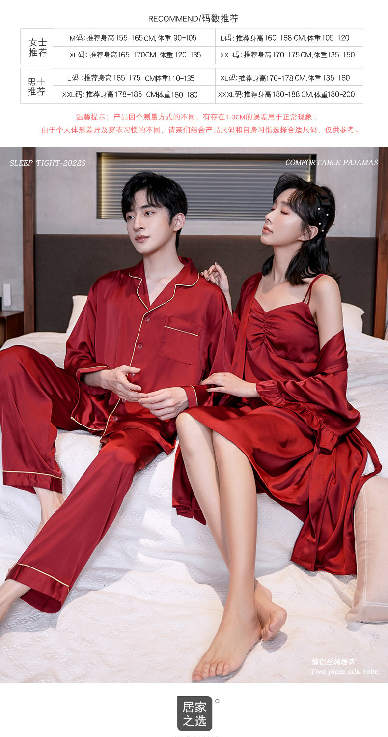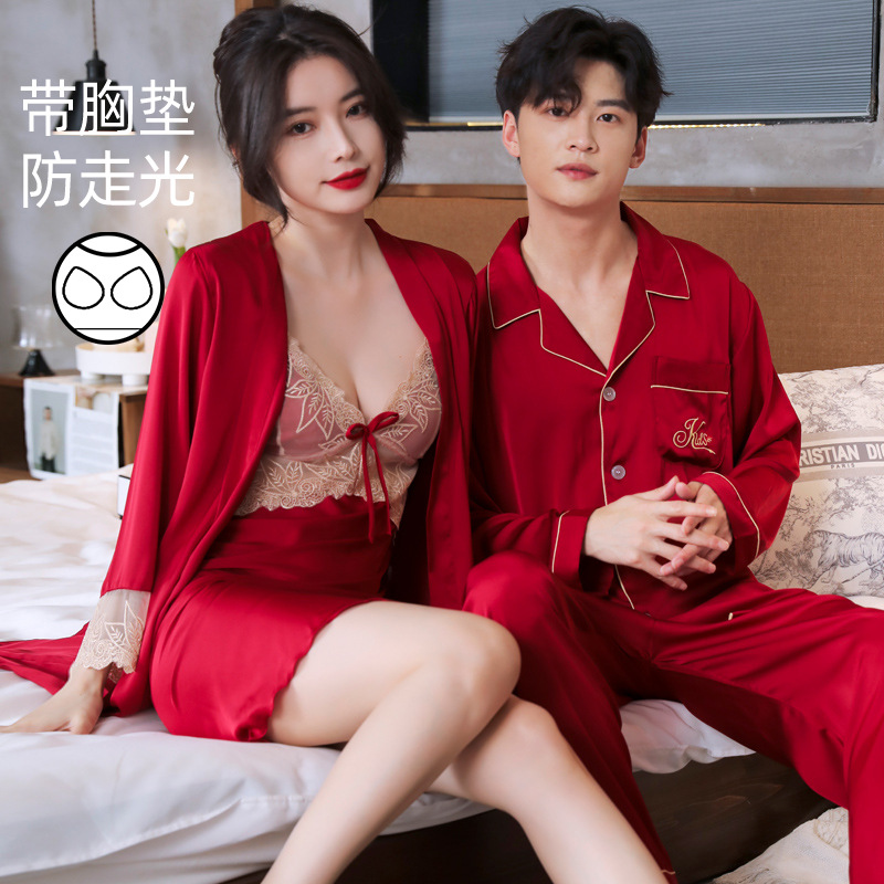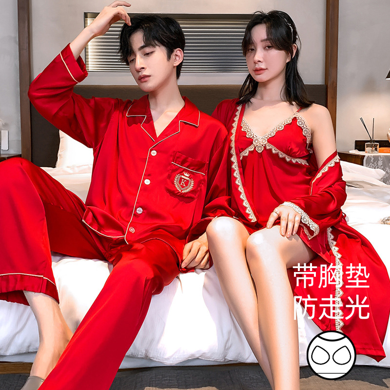 커플 잠옷 여성 결혼식 여름 얼음 실크 섹시한 잠옷 투피스 세트 빨간색 신혼 실크 남성 반팔 가정복스토어 가기